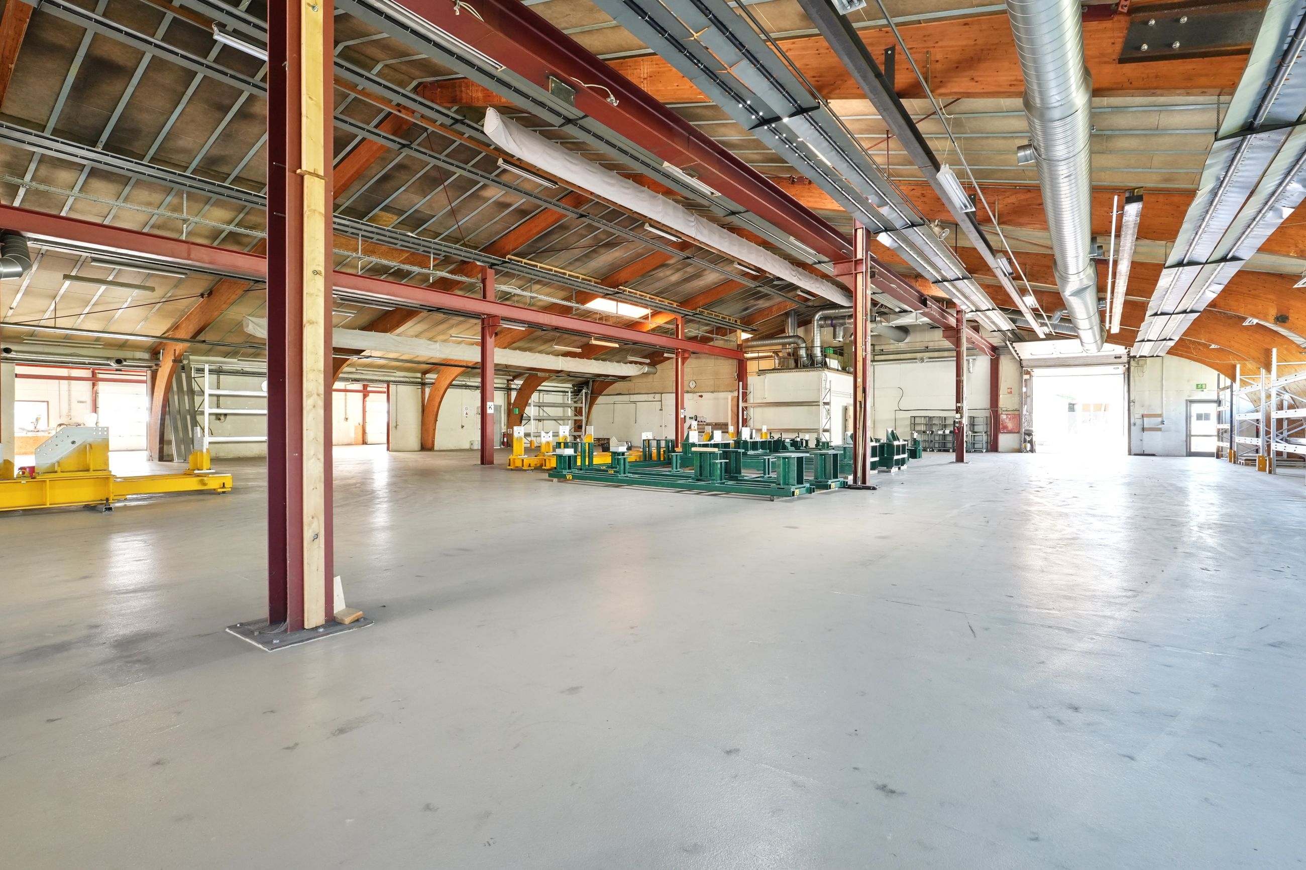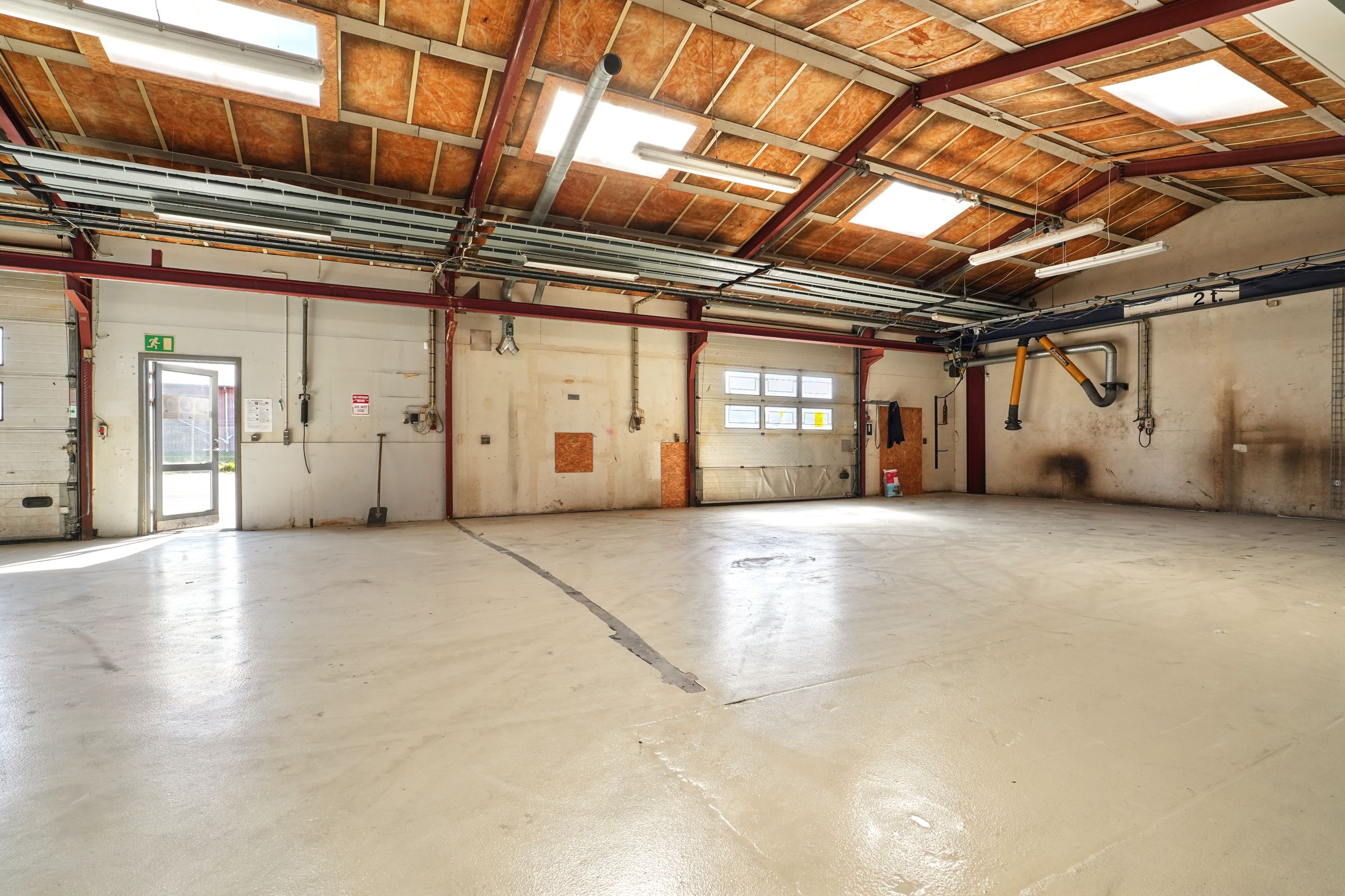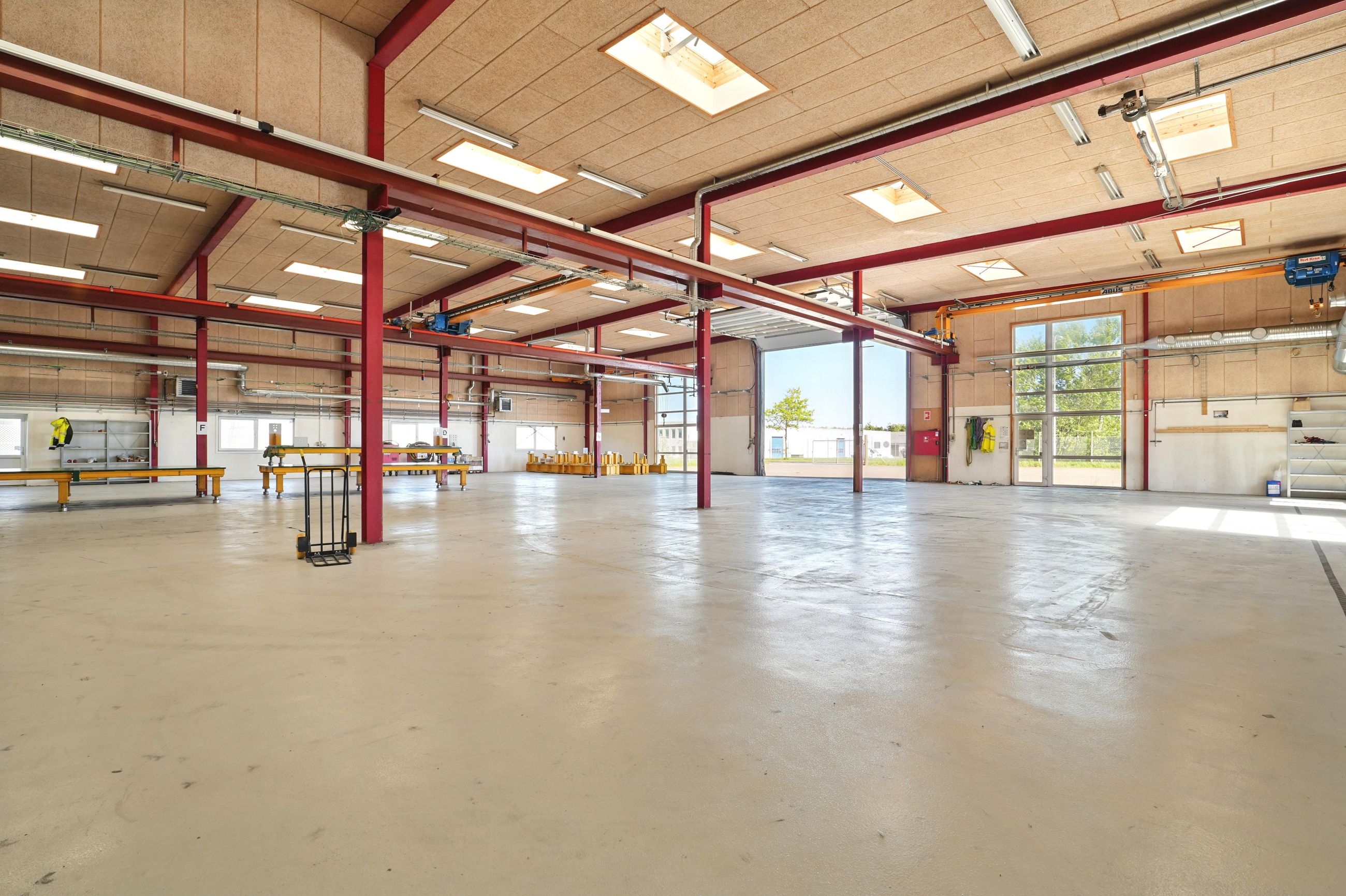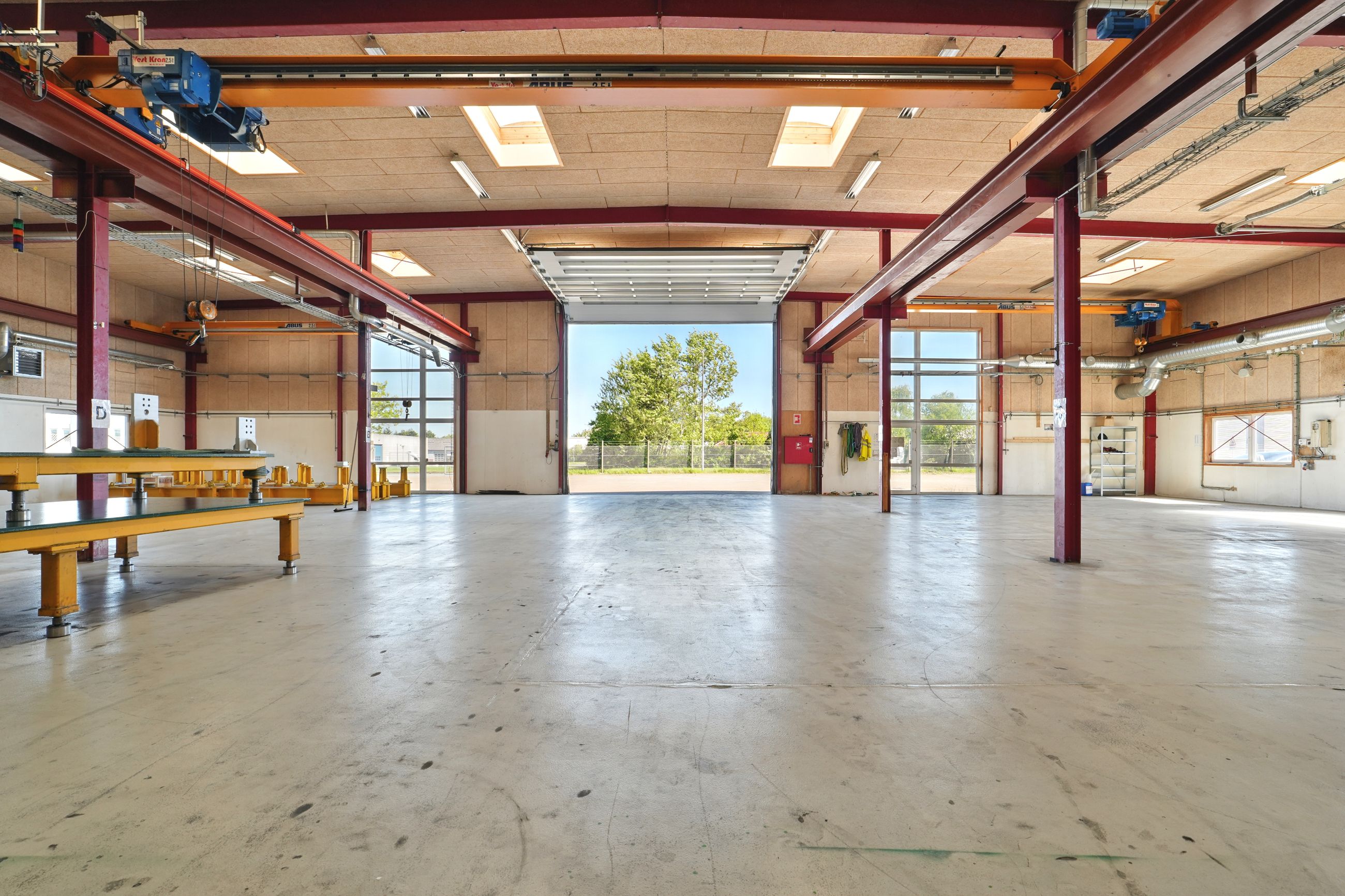 Beskrivelse: Denne ejendom er indrette med stor opvarmet produktionshal, malerkabine, kontorafsnit, et pænt kantinelokale samt bade/toilet faciliteter. Hallen er højloftet og den forreste del af hallen er fra 2007. Ligeledes er der 7 stk. traverskraner på henholdsvis 500 kg. - 2.500 kg - og 5.000 kg, fordelt rundt i hallen. Der gode muligheder for at tilgå hallen, da der fem større porte fordelt omkring på bygningen. Porten i midten er ca. 8 meter bred og 7 meter høj, de tre andre porte er ca. 4 meter bred og 4 meter høj. I forhold til løfte højde er der ca. 6 meter i den store hal og ca. 4 meter i den lille hal.