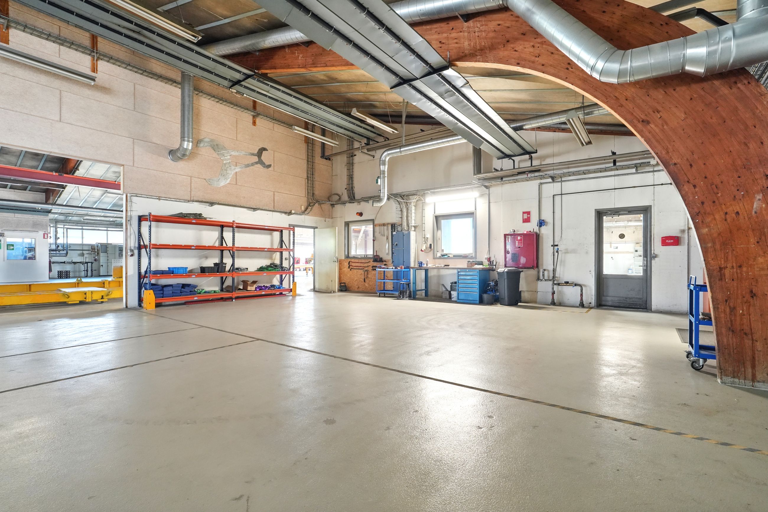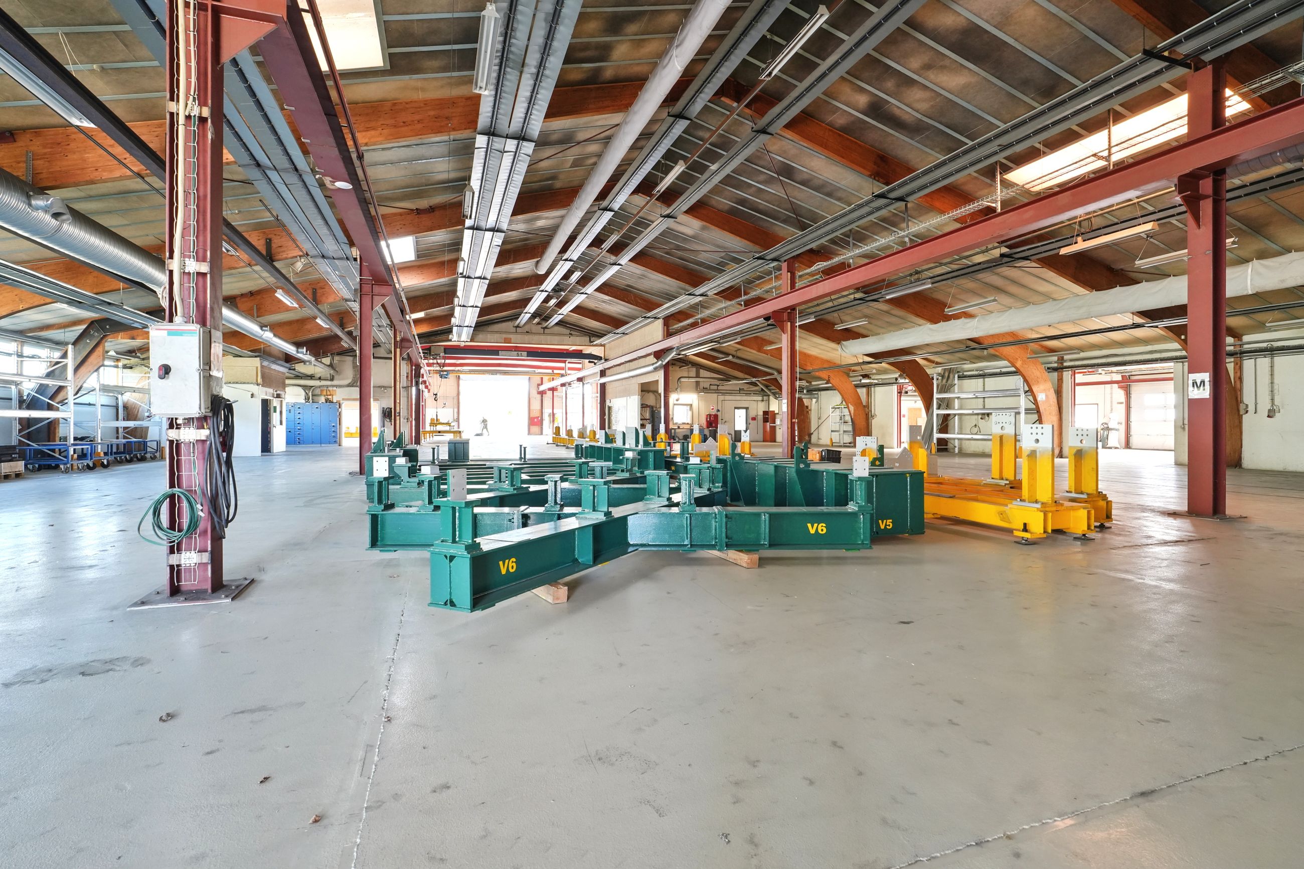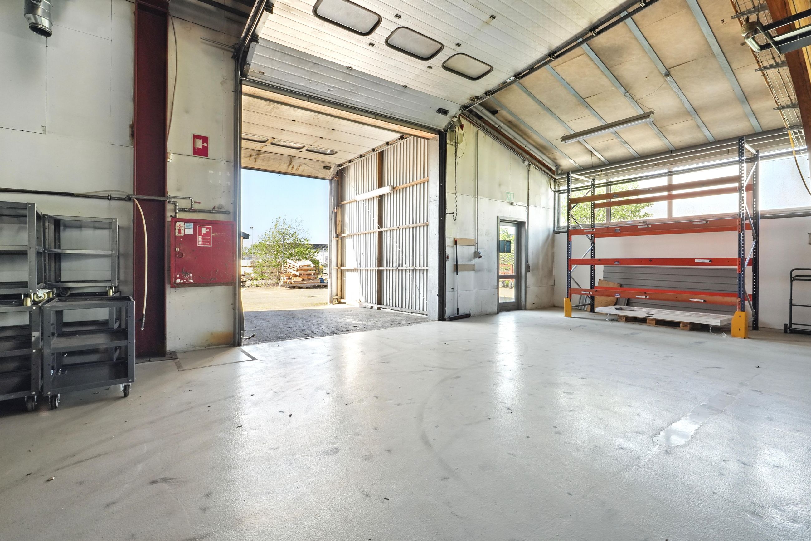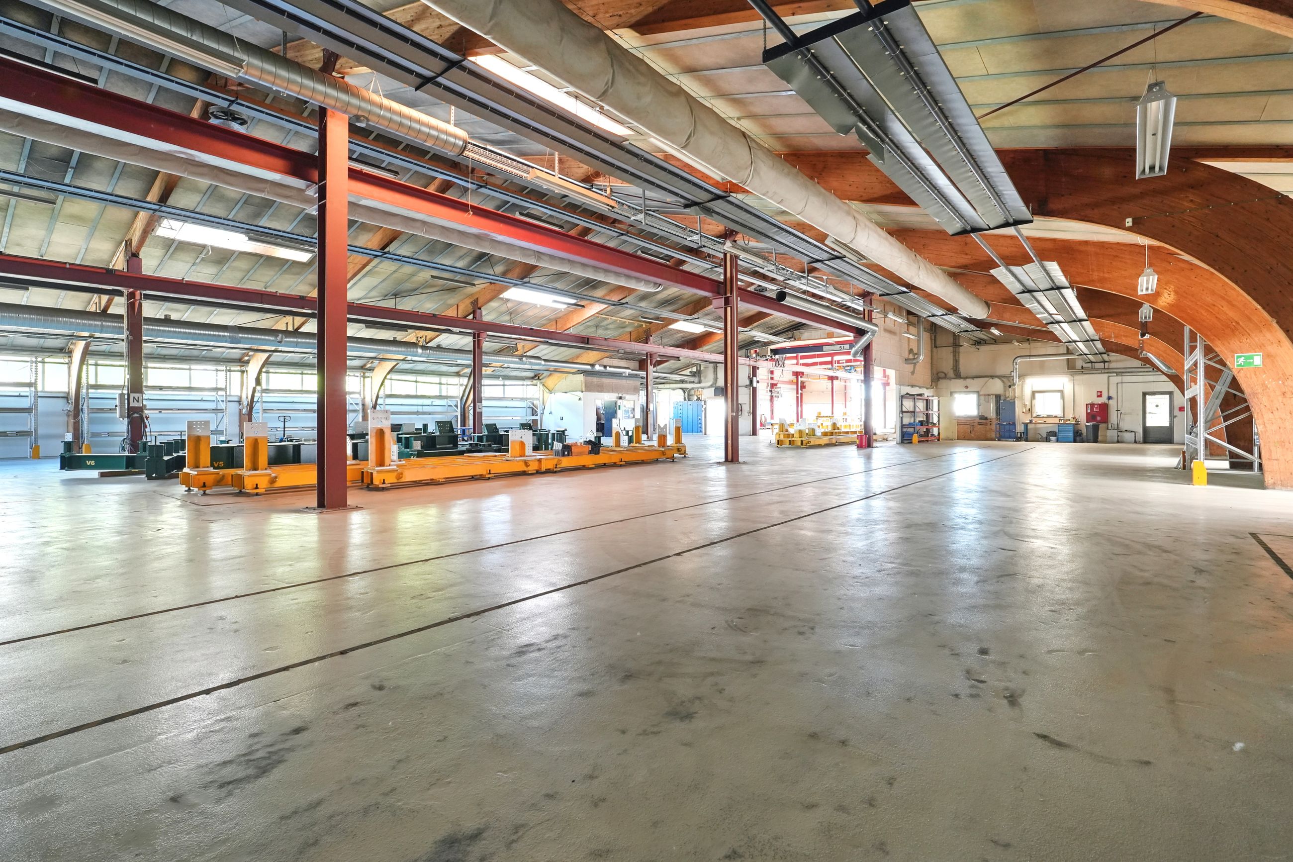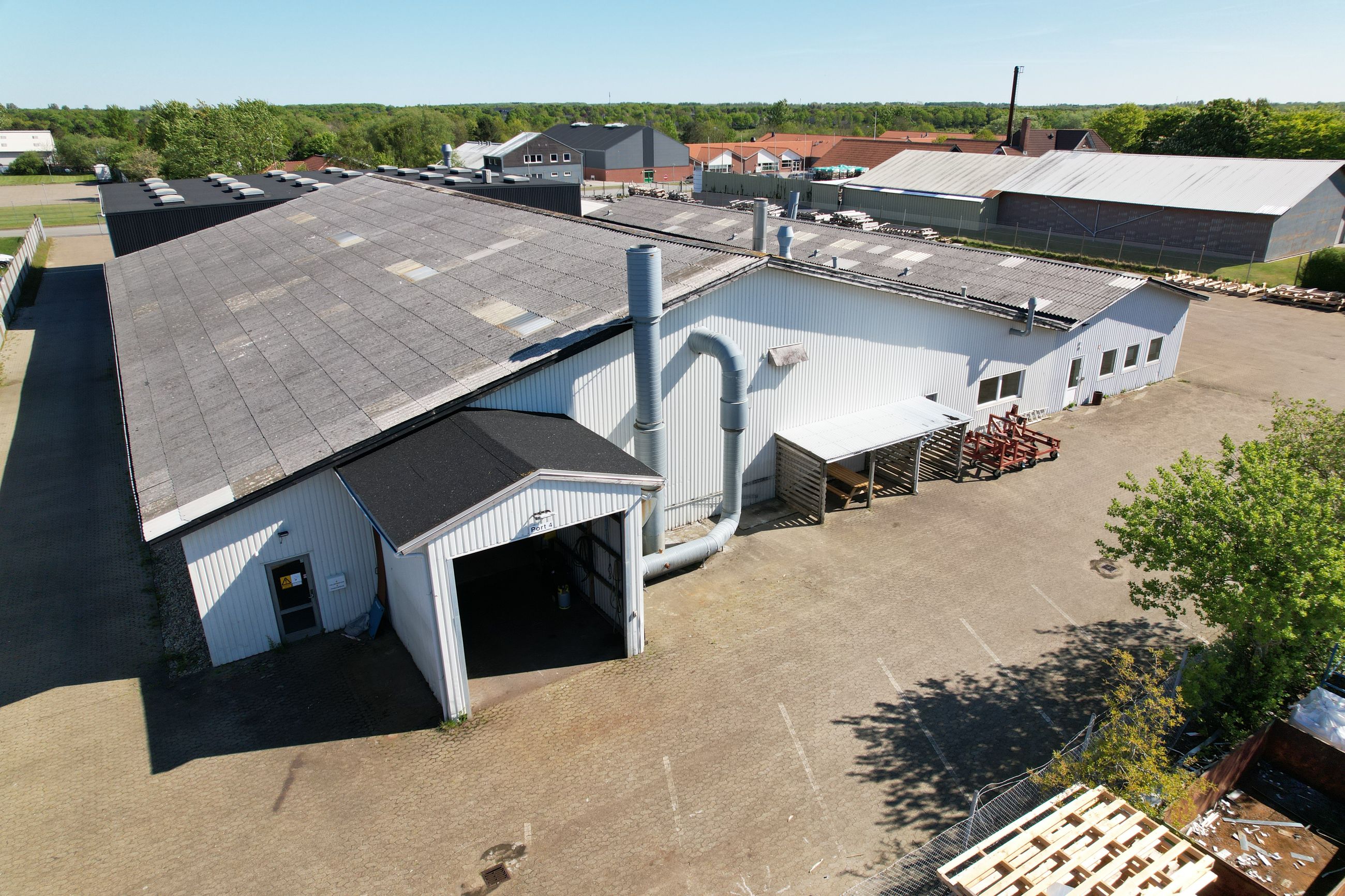 Beskrivelse: Denne ejendom er indrette med stor opvarmet produktionshal, malerkabine, kontorafsnit, et pænt kantinelokale samt bade/toilet faciliteter. Hallen er højloftet og den forreste del af hallen er fra 2007. Ligeledes er der 7 stk. traverskraner på henholdsvis 500 kg. - 2.500 kg - og 5.000 kg, fordelt rundt i hallen. Der gode muligheder for at tilgå hallen, da der fem større porte fordelt omkring på bygningen. Porten i midten er ca. 8 meter bred og 7 meter høj, de tre andre porte er ca. 4 meter bred og 4 meter høj. I forhold til løfte højde er der ca. 6 meter i den store hal og ca. 4 meter i den lille hal.