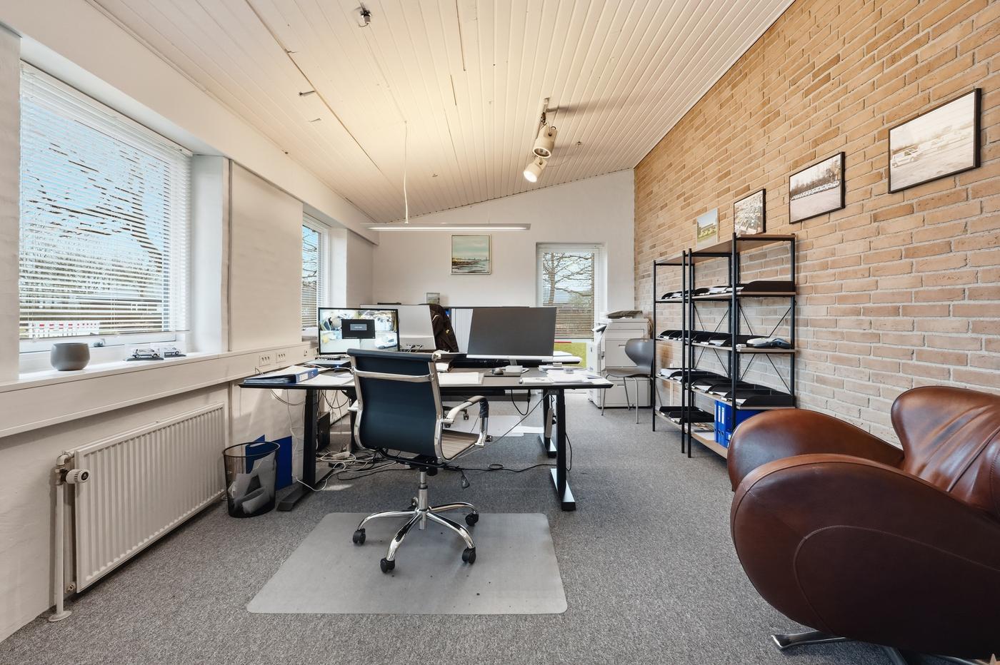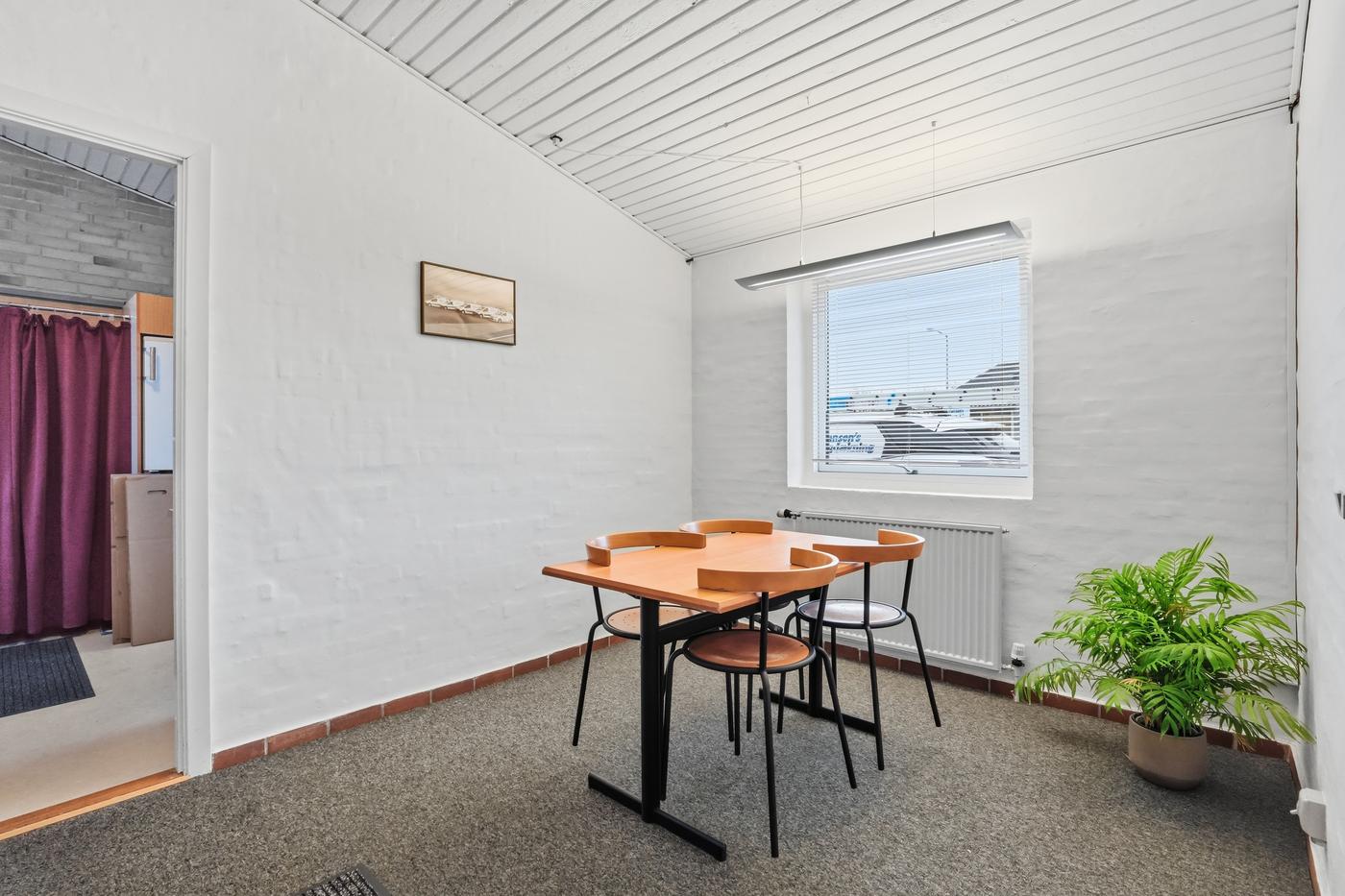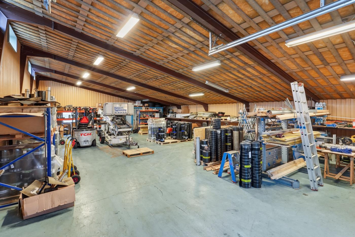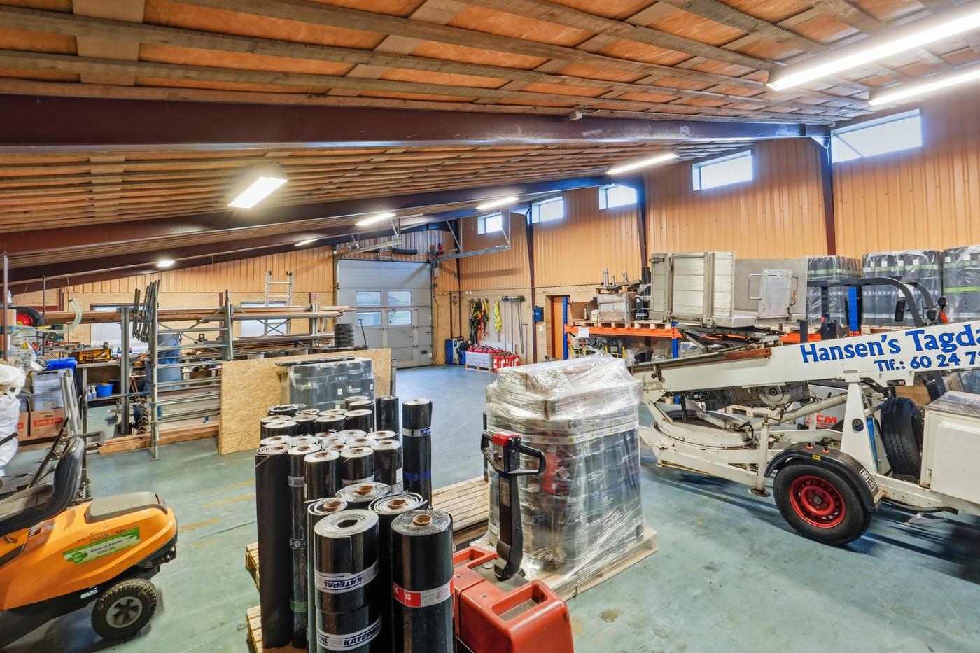 I lager-/værkstedsdelen er der en god loftshøjde og port, så lokalet nemt kan tilpasses forskellige drifts- og logistikbehov.