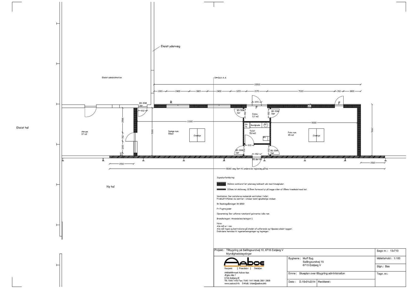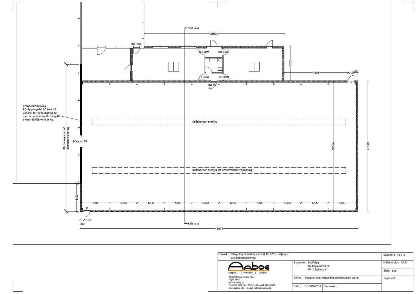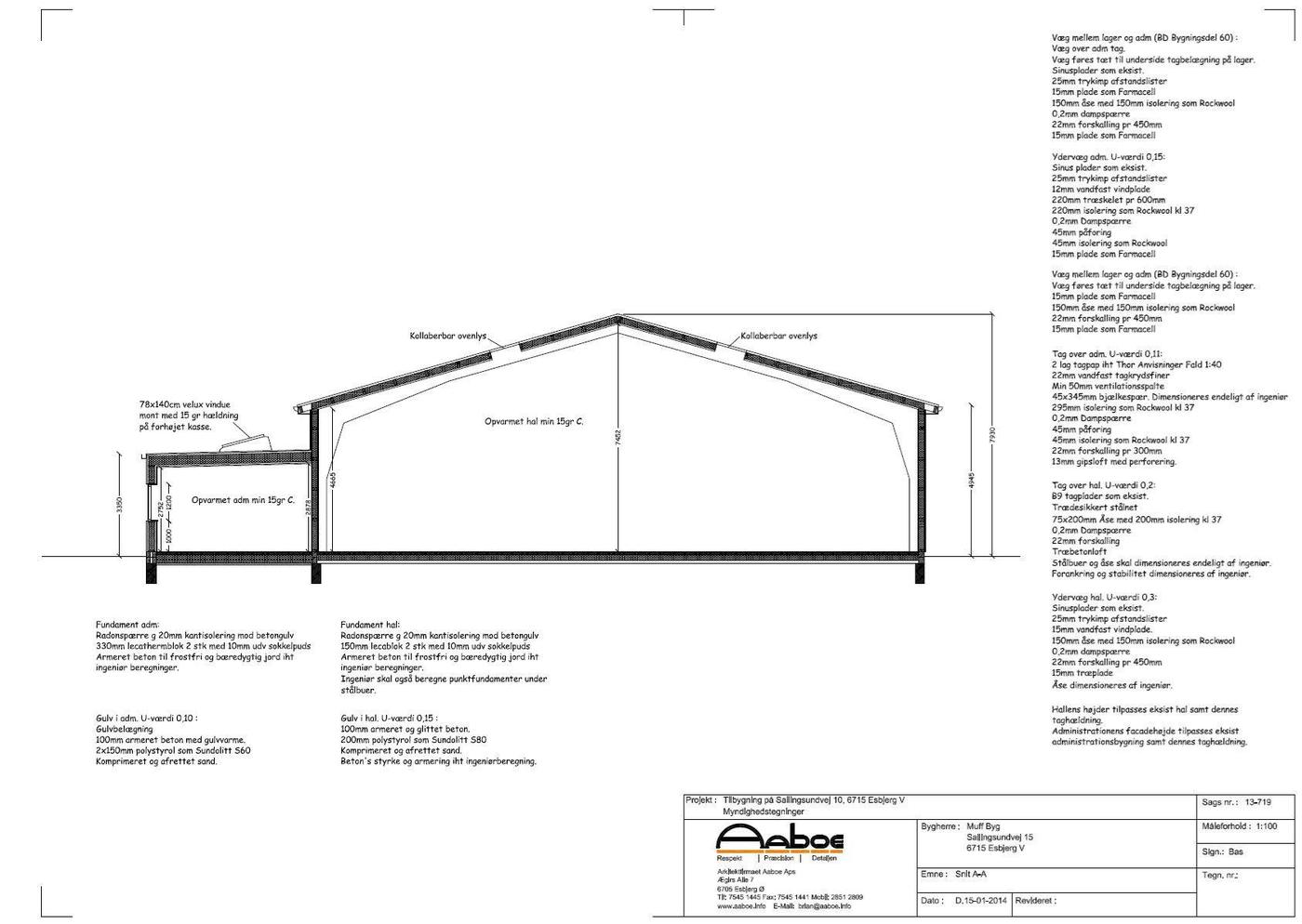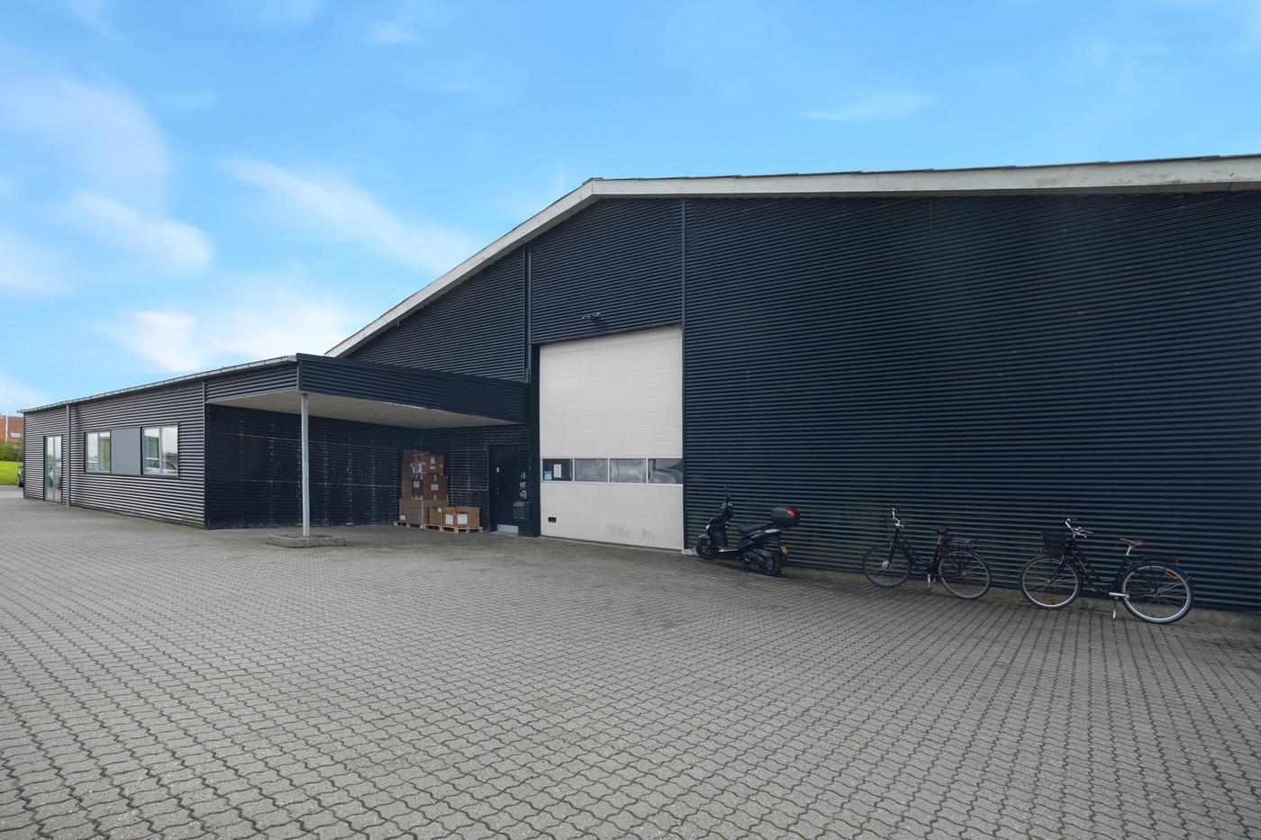 Beskrivelse: Ejendommen er opført i 1996 og ombygget i 2014 med stålspærskonstruktion beklædt med stålplader og eternittag. Hallen er isoleret. Indvendig højde anslåes til 7,5 m i kip og ca. 5 m i sidehøjde.
