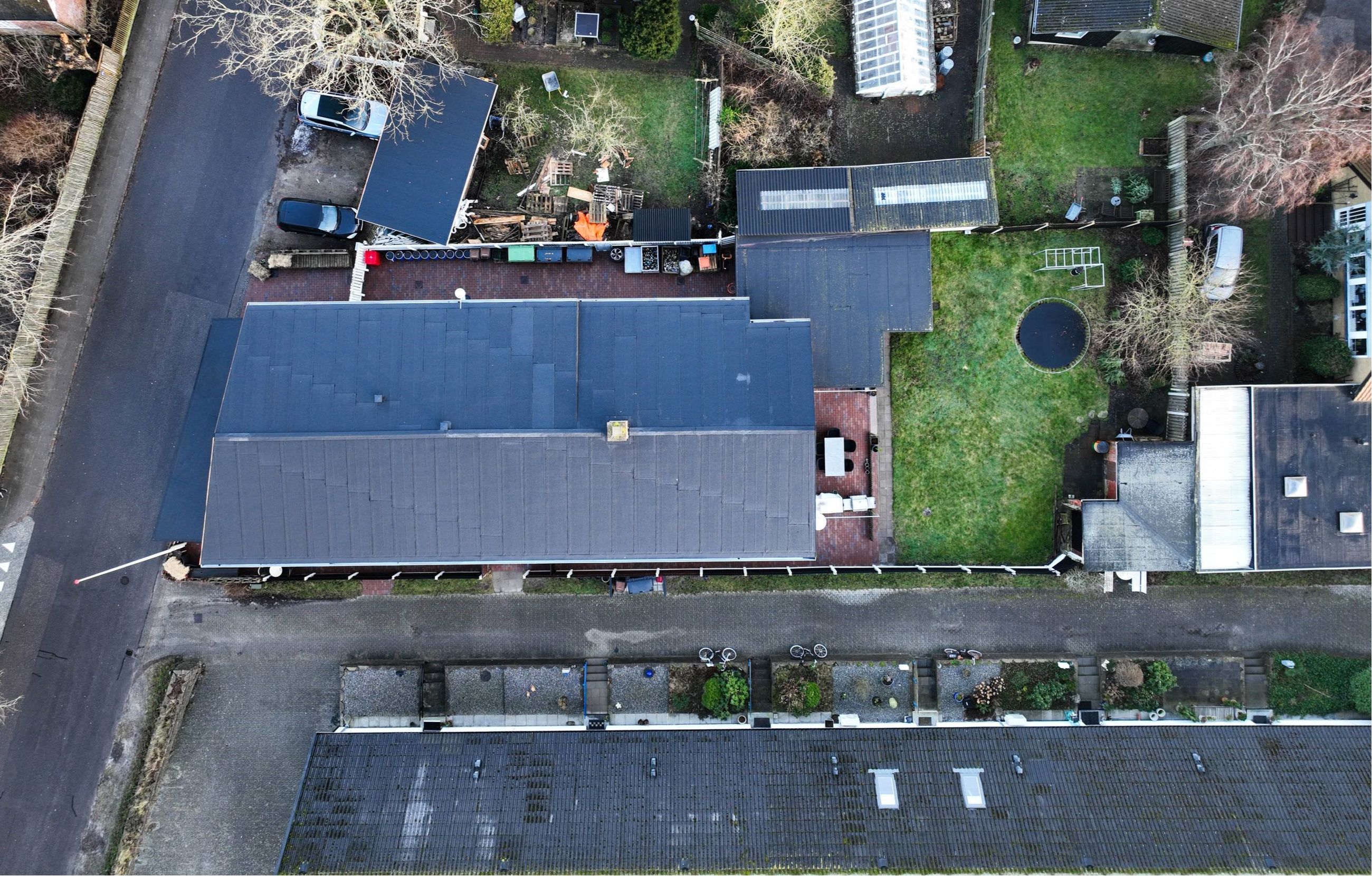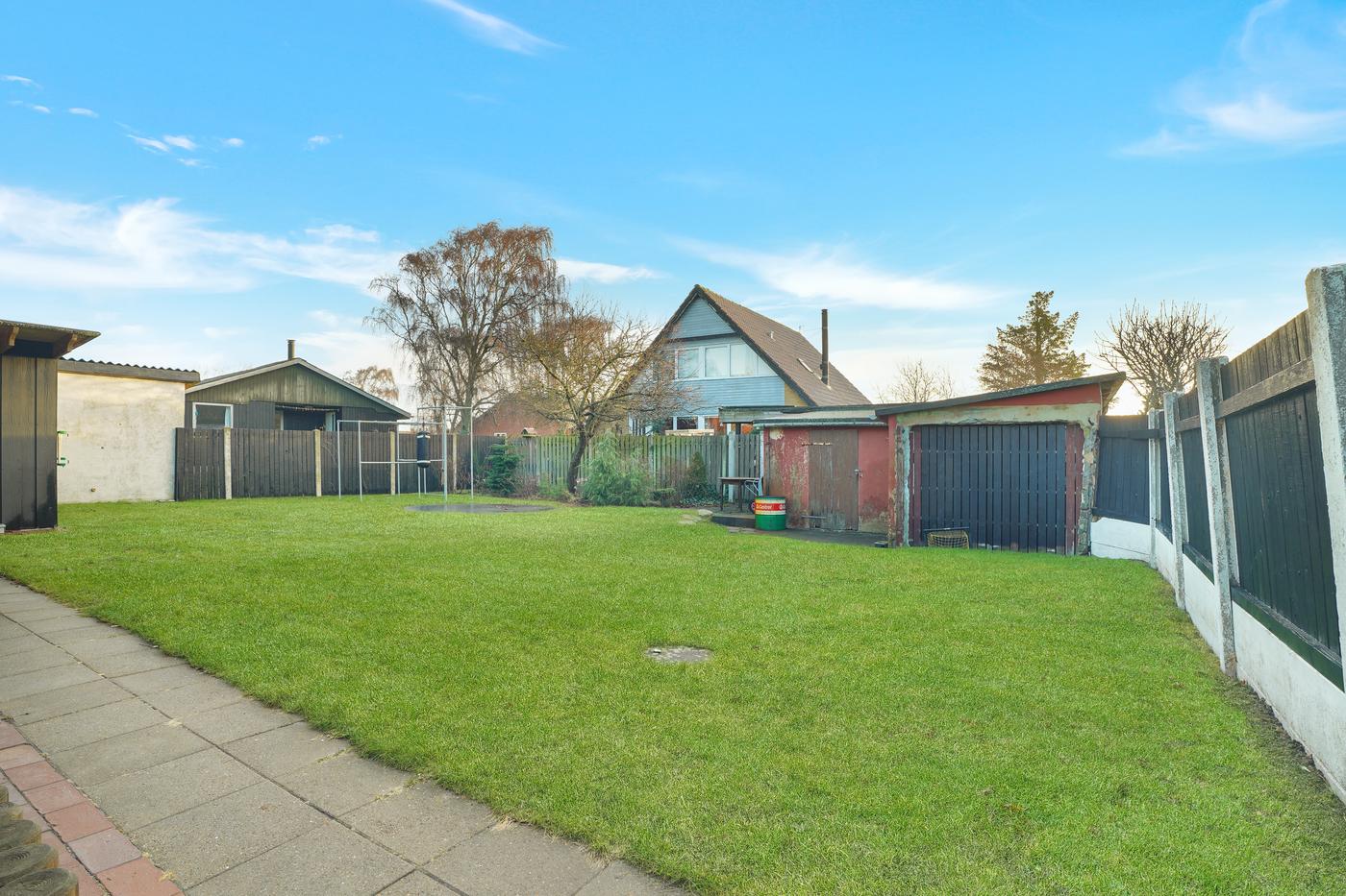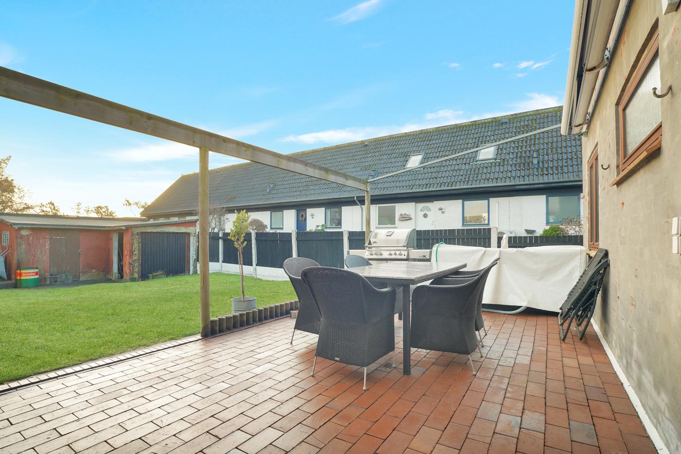 Bag ejendommen er der anlagt have med græsareal og terrasse, og i bunden af haven er der et mindre udhus / skur.