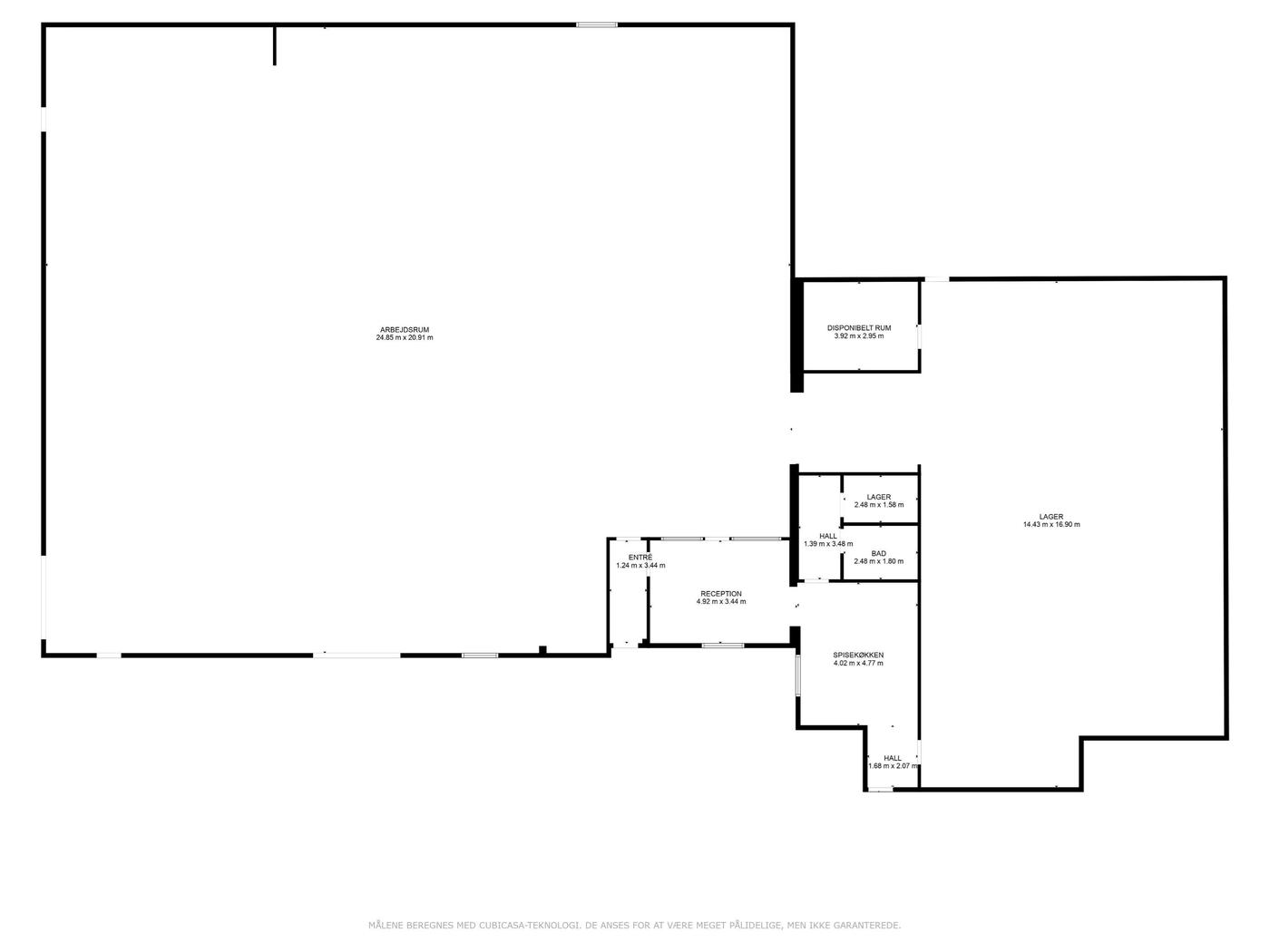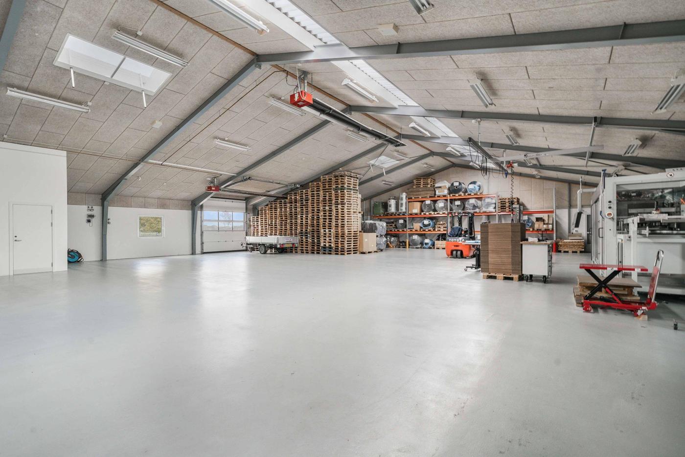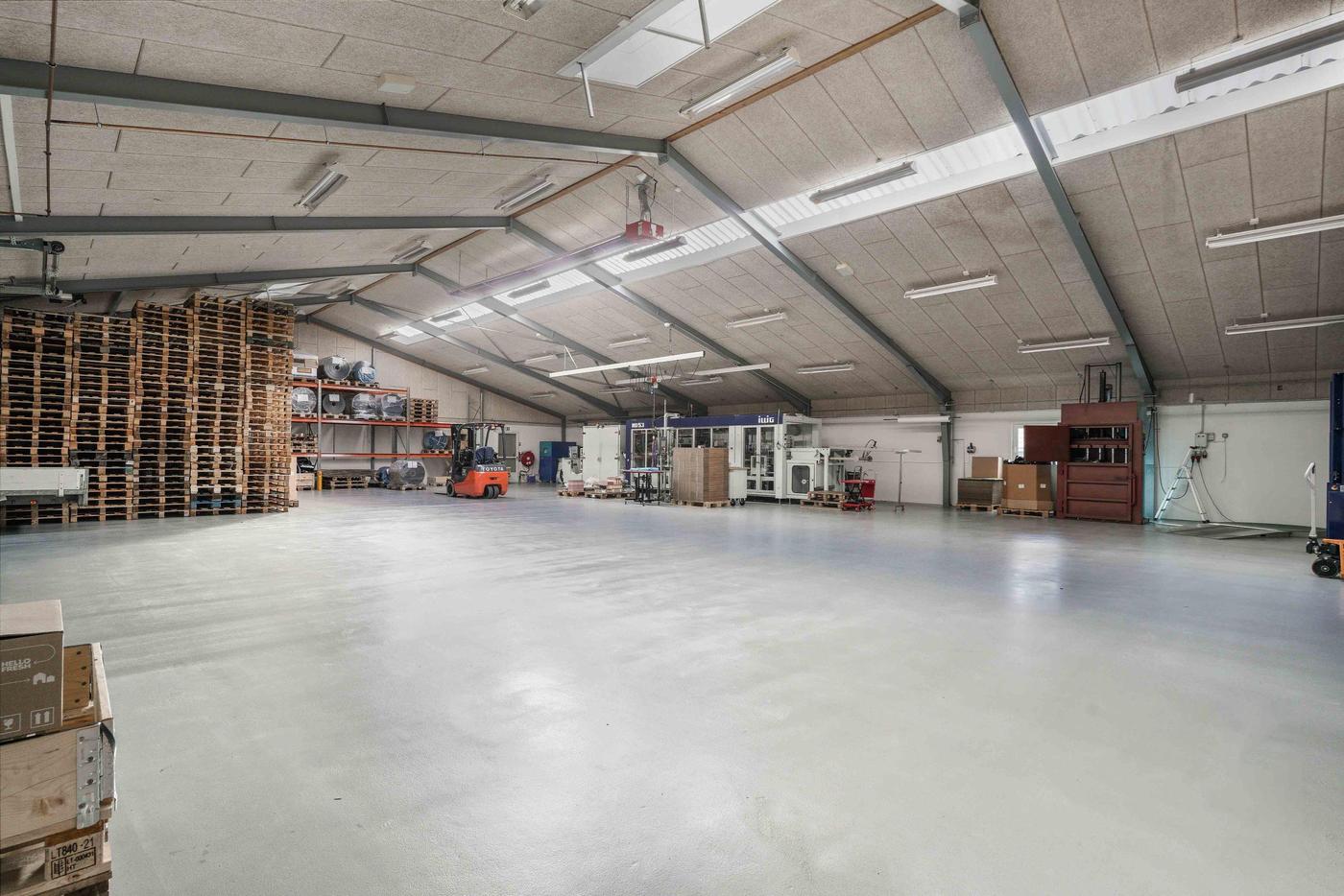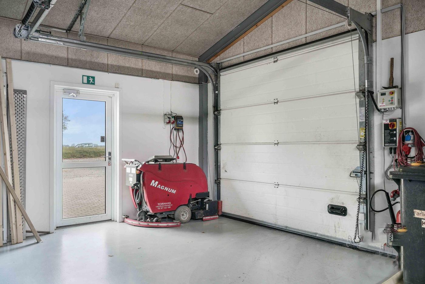 Beskrivelse: Lejemålet fordeler sig på i alt 760 m², og består af en stor produktions-/lagerhal med 2 porte samt endnu en lagerhal. Det rummer ligeledes en kontordel og pæne personalefaciliteter i form af spisekøkken, toilet og omklædning/bad.