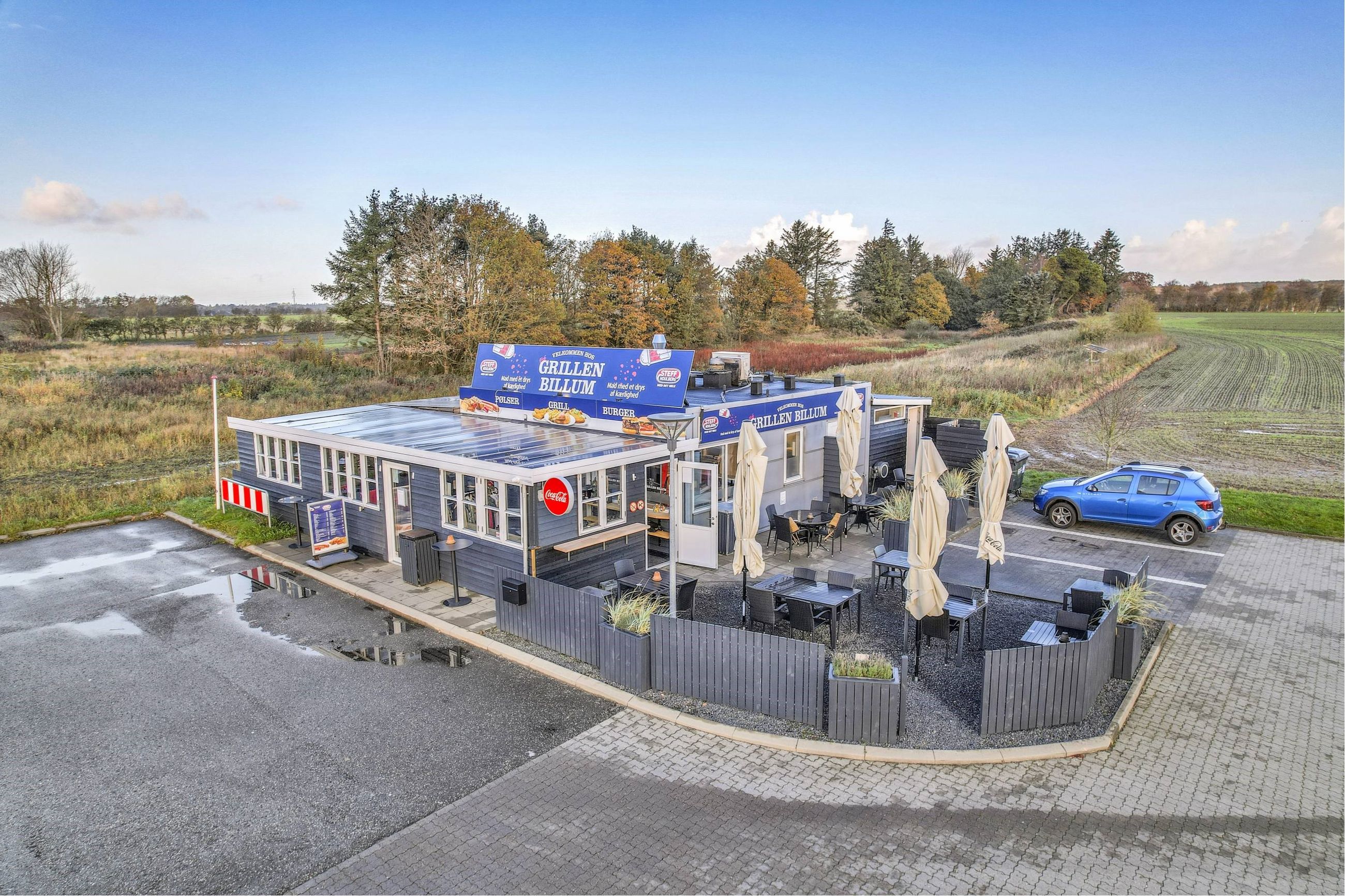 Grunden ligger tilbagetrukket fra rundkørslen ved Billum, men med stor synlighed i forhold til de mange forbipasserende i rundkørslen og de handlende, som skal i Rema 1000.