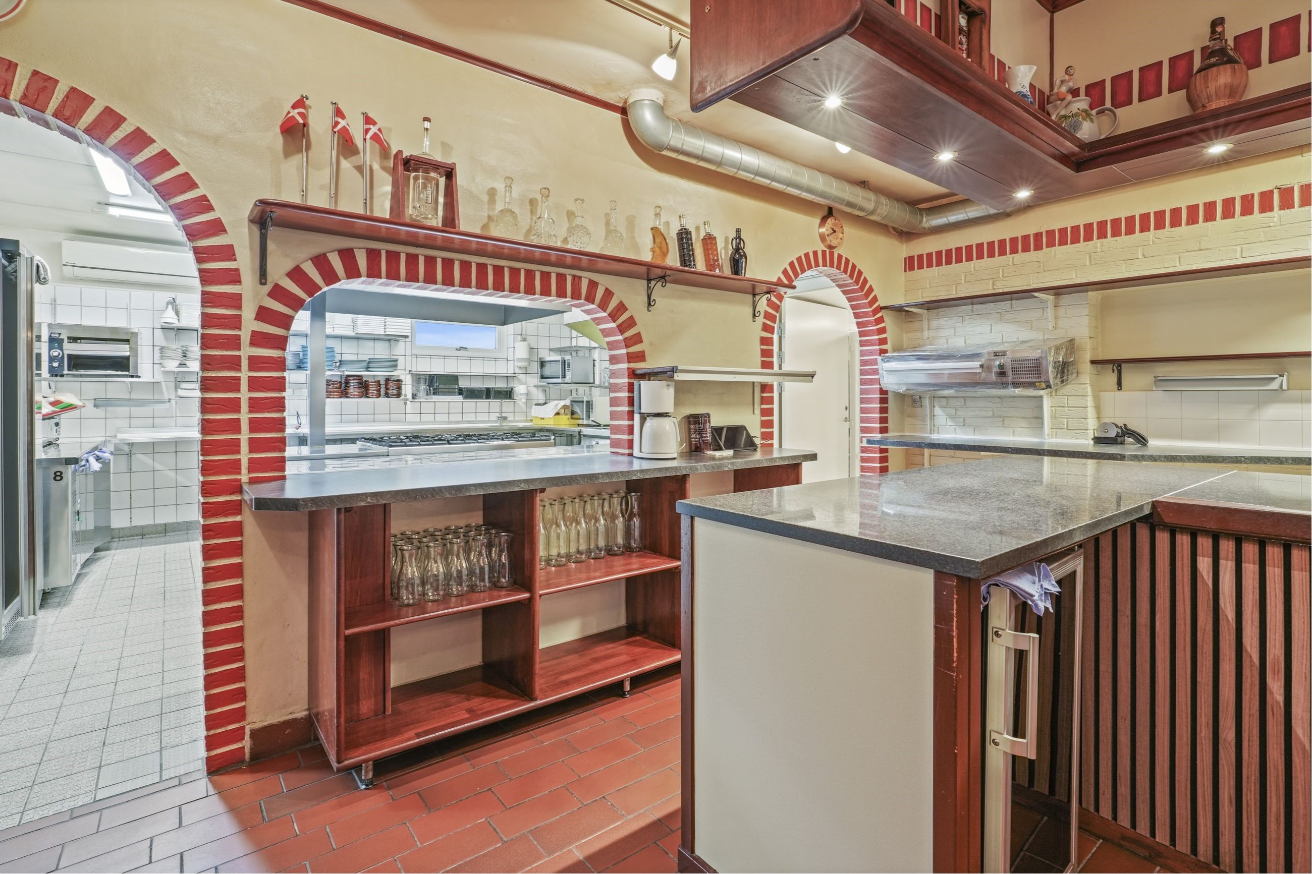 Ligeledes er der et velfungerende barområde, som ligger i forlængelse af køkkenet. Køkkenet er stort og i nyere stand, den har en størrelse der giver god arbejdsplads. Tilhørende er der nyere køle og fryserum.