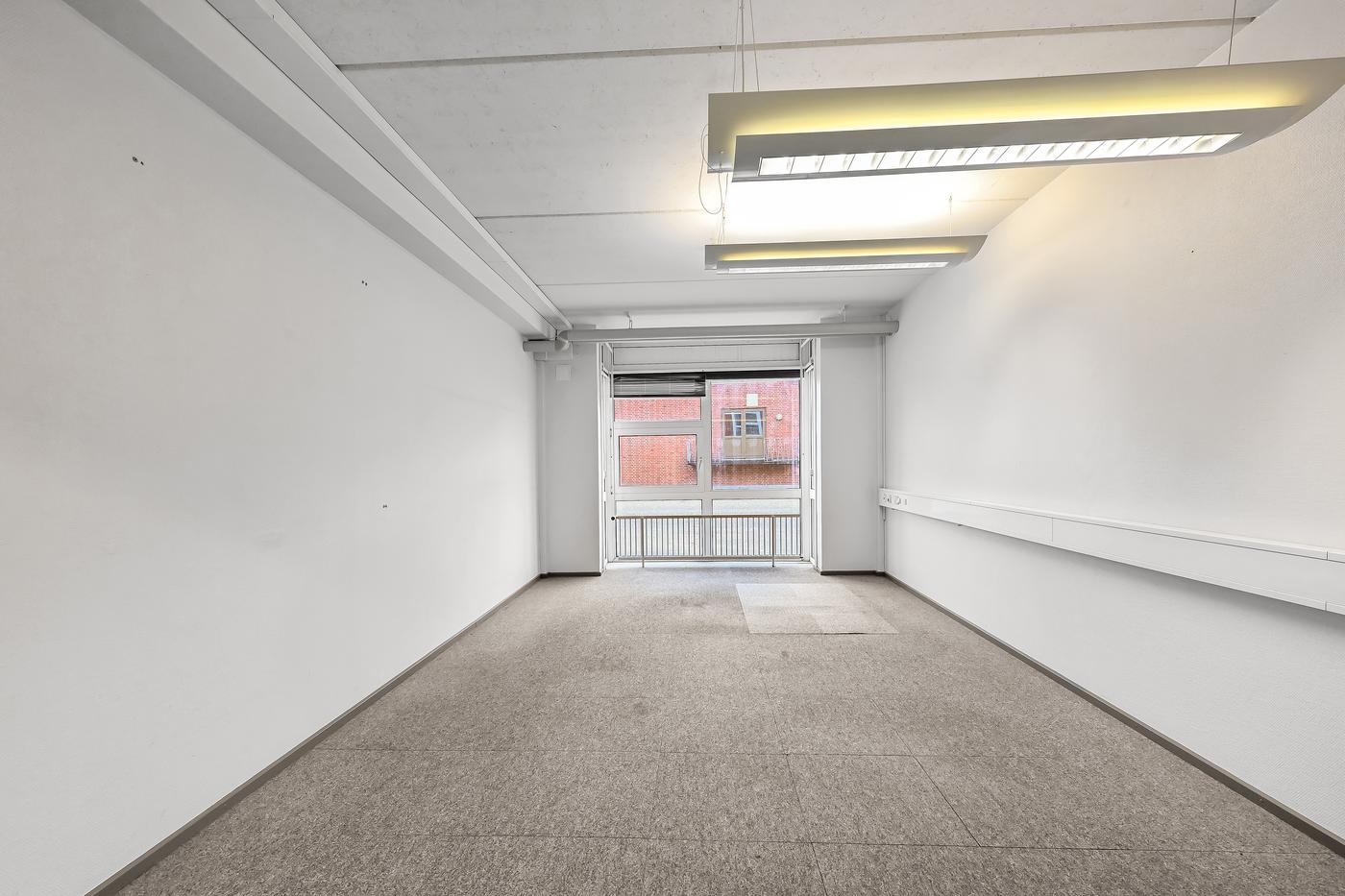 Herfra indgang til et stort, lyst åbent kontorlokale med gulvtæppe, som giver adgang til: