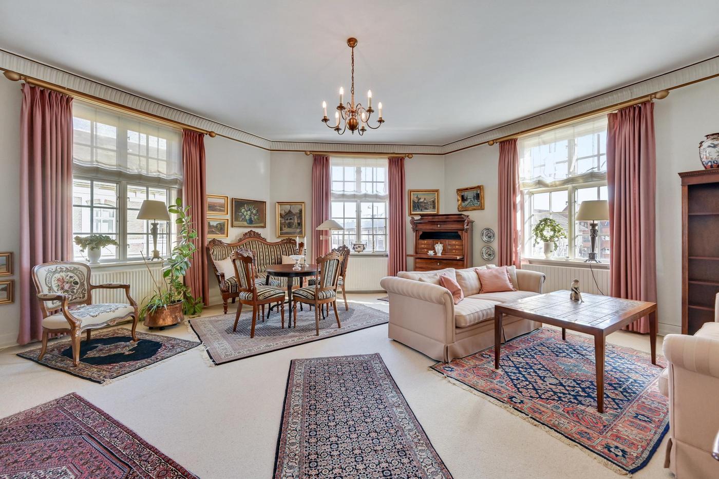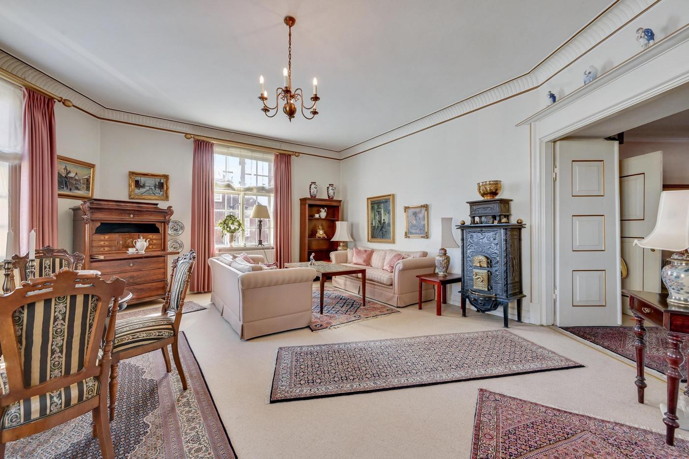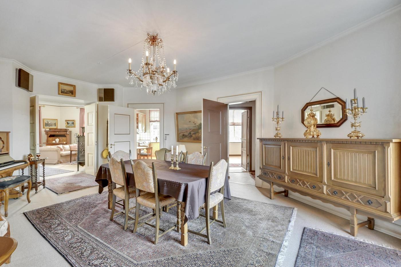På 1. sal er der en stor og flere steder herskabelig lejlighed, der består af spisestue med udgang til terrasse, værelsesafdeling med flere værelser og badeværelse samt bryggers. Fra spisestuen er der adgang til 'Harbogade 3', der i princippet består af en separat lejlighed, der indeholder flere værelser samt badeværelse.