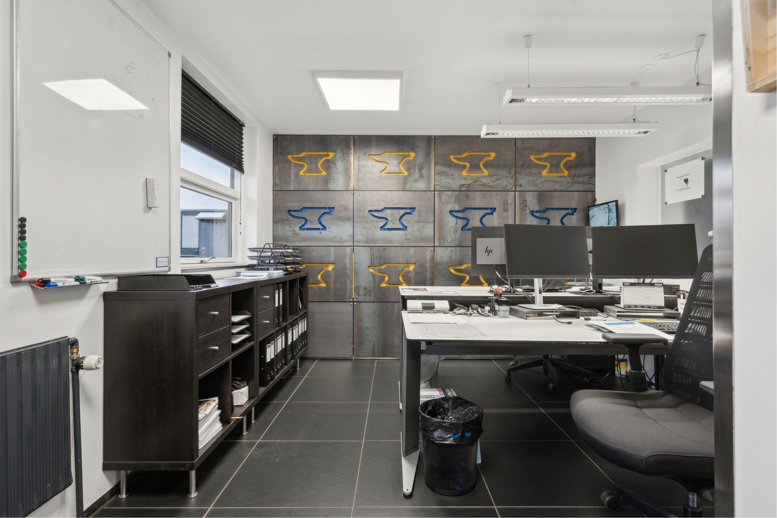 Selve bygningen er med gråmalet facade og større vinduesparti i gavl. Ejendommens kontorafsnit er nyrenoveret indvendigt, herunder med nymalede gulve, lofter samt vægge.