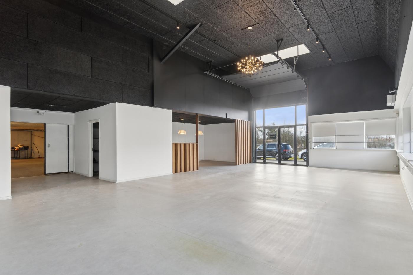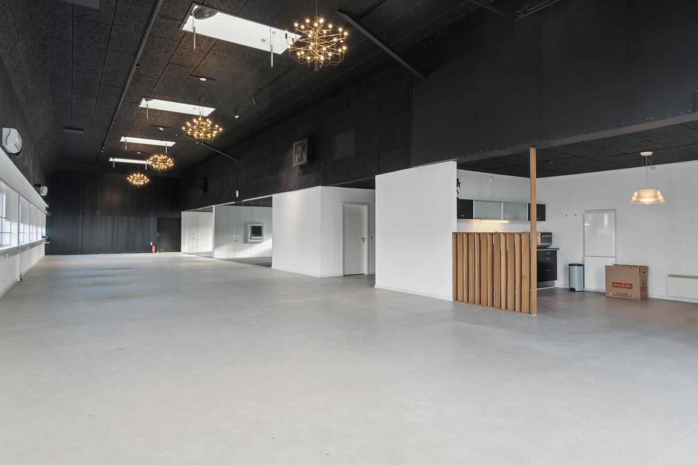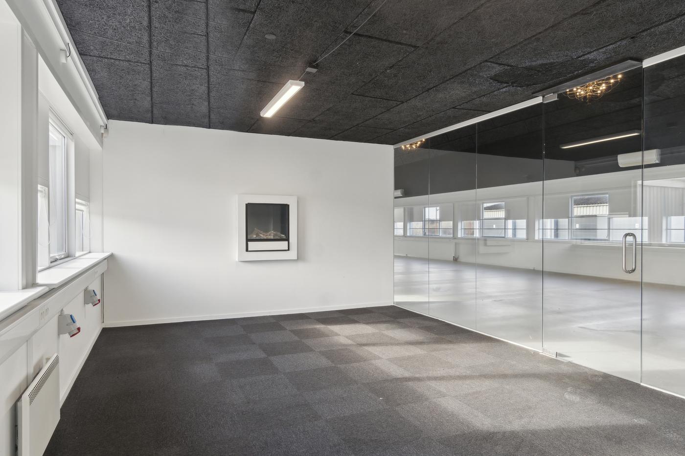 Dette lejemål har 5 meters loftshøjde og er nok ejendommens flotteste lokale. Det er passende til kontor eller showroom med tilhørende lager. Der er et dejligt lysindfald fra de mange vinduer.