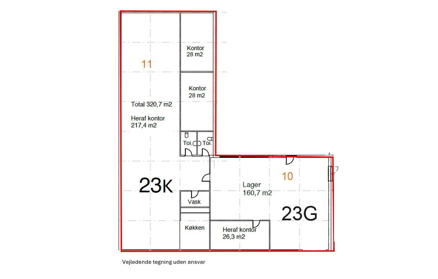 Planløsningen er optimal, med stort fælles rum, samt to lukkede kontorrum og åbent køkken for enden af lejemålet. De to toiletter er placeret tættest på lageret.