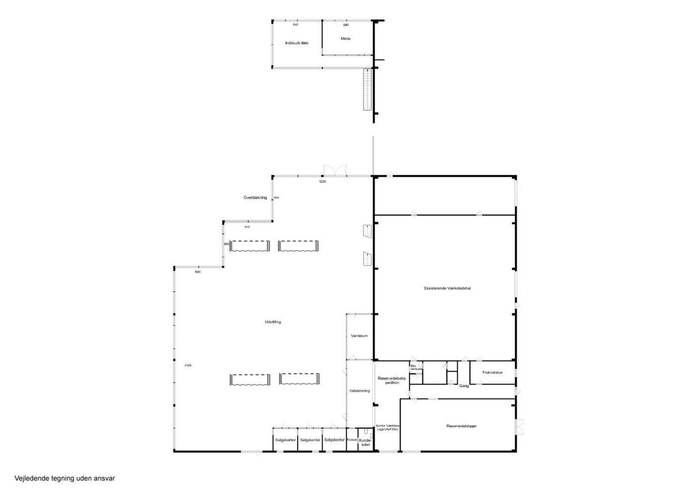 Ejendommen er funktionelt indrettet med showroom, kontor-og personalefaciliteter samt værksted og lager. Showroomet på ca. 800 m² er placeret mod vejen med store facadevinduer i aluminium og fire porte. Her findes også tre salgskontorer og et venterum.