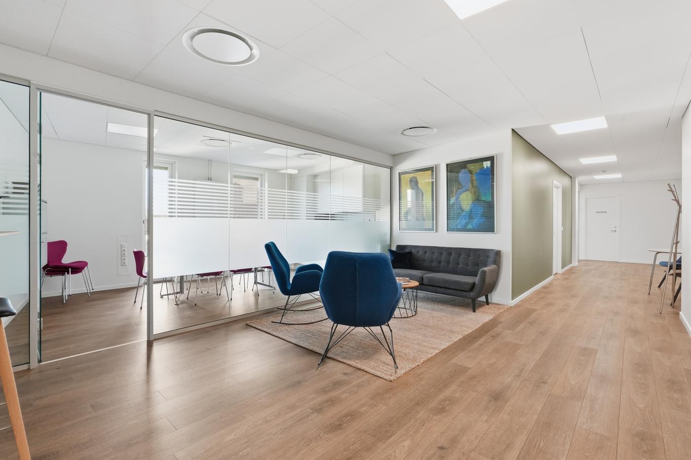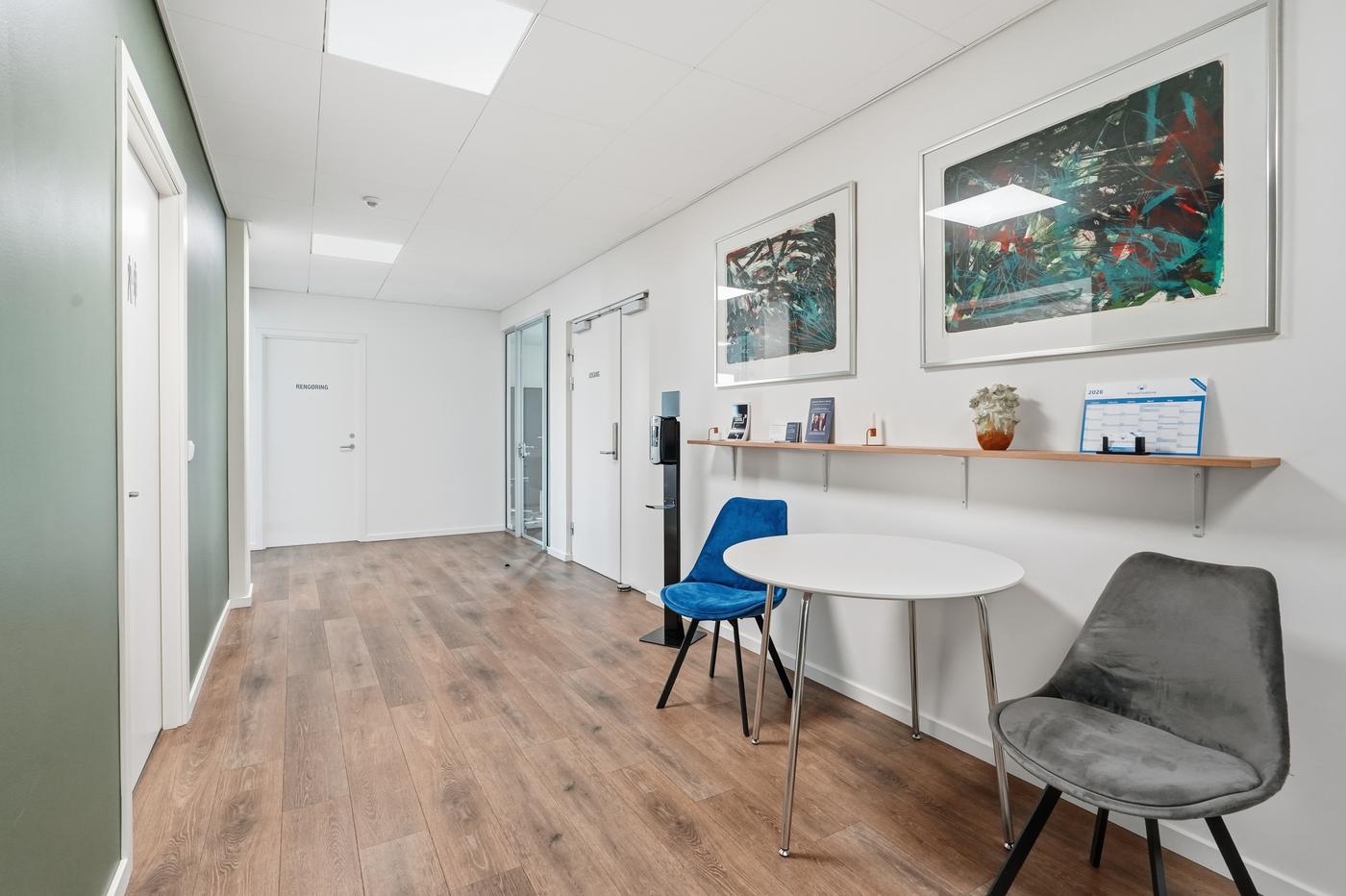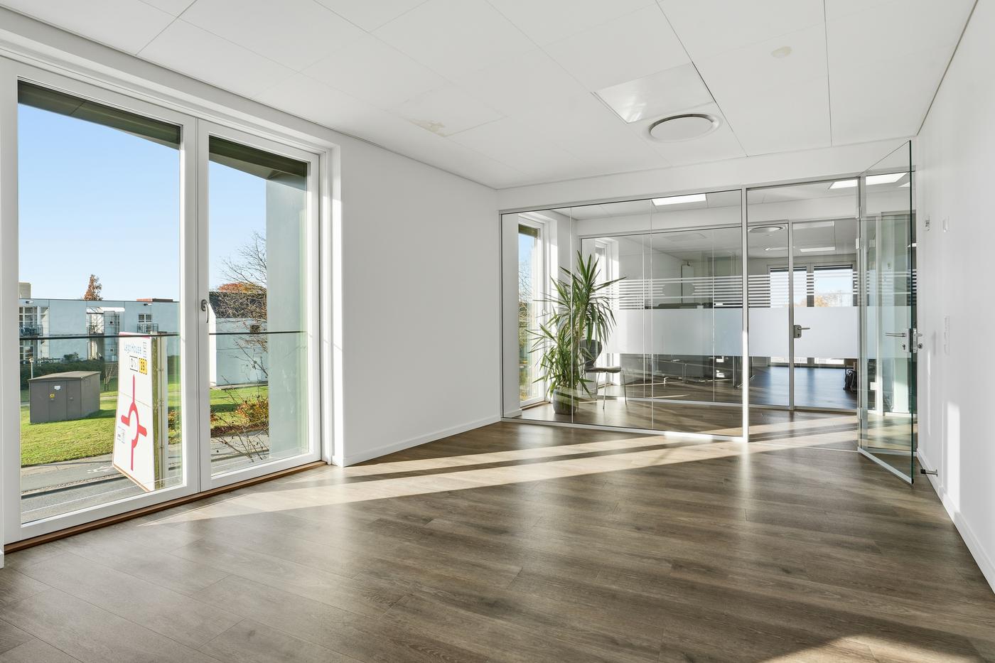 Lejemålet er lyst og indbydende med store vinduespartier, der giver et flot naturligt lysindfald. Lokalet er en del af et moderne kontorfællesskab med stilrene fællesarealer.