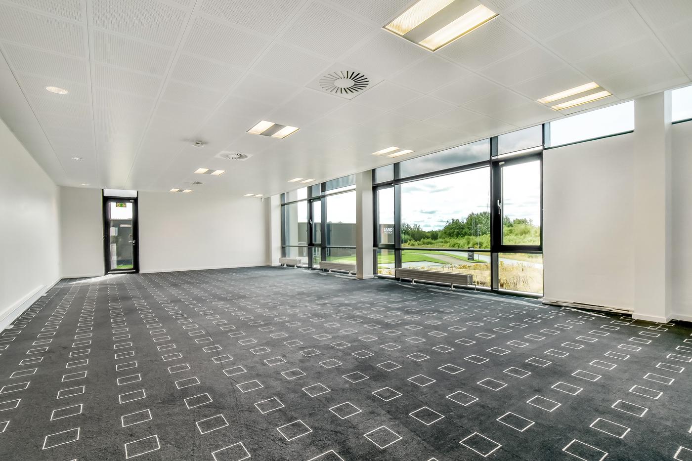 Desuden er der hele gulvarealet beklædt med et flot og smagfuldt gulvtæppe. Lofter er beklædt med flotte hvide lyddæmpende loftpaneler.