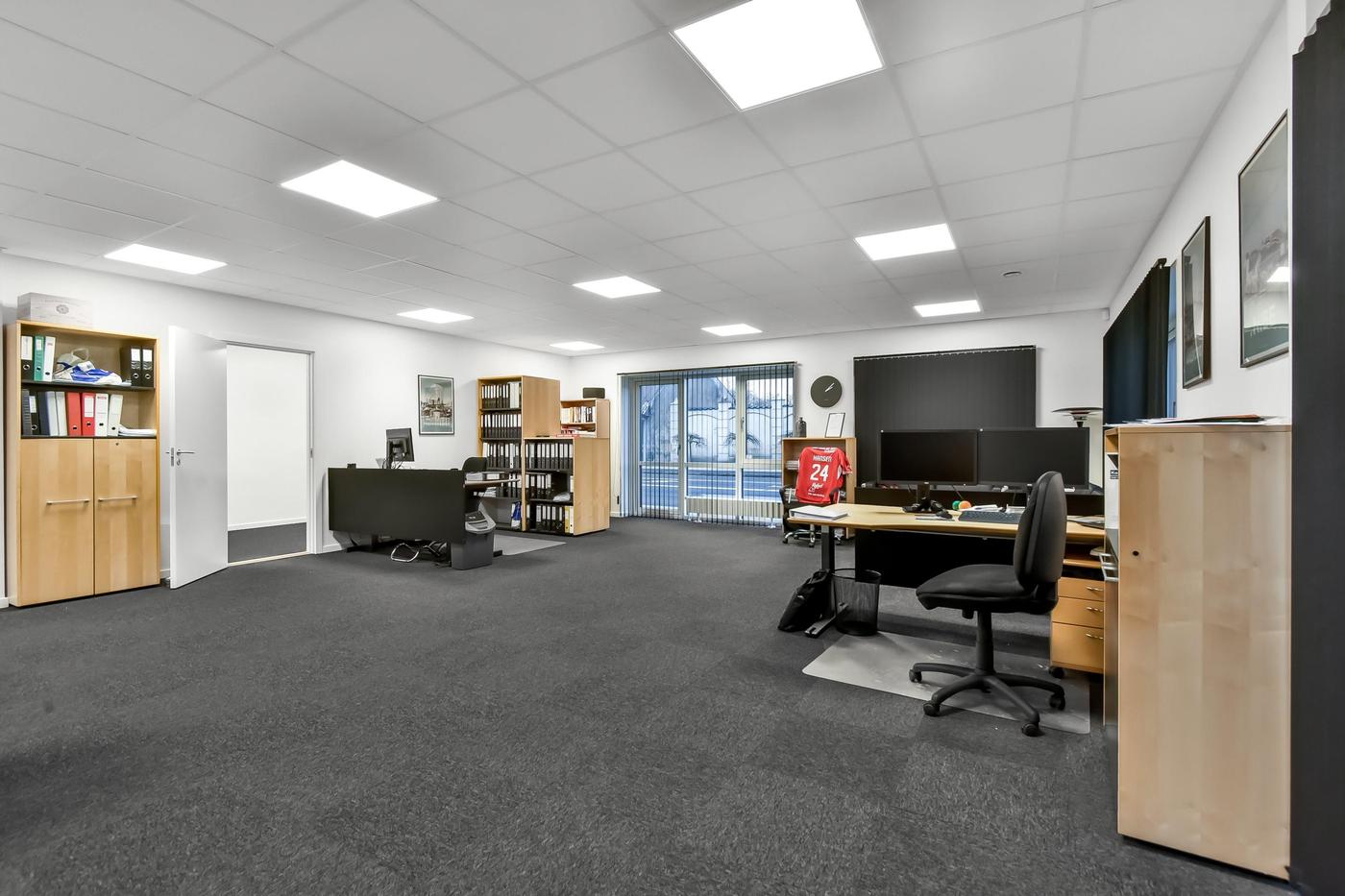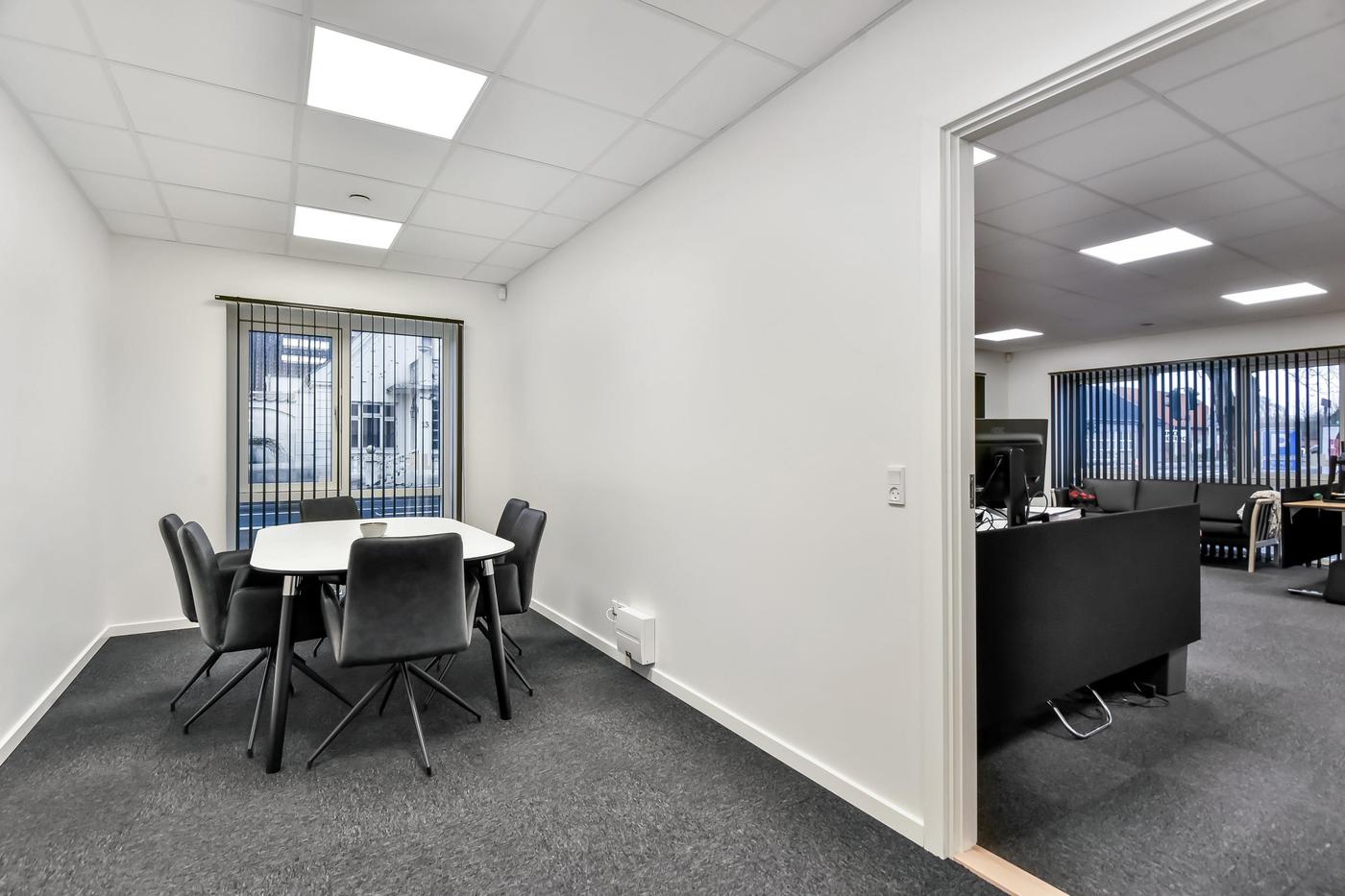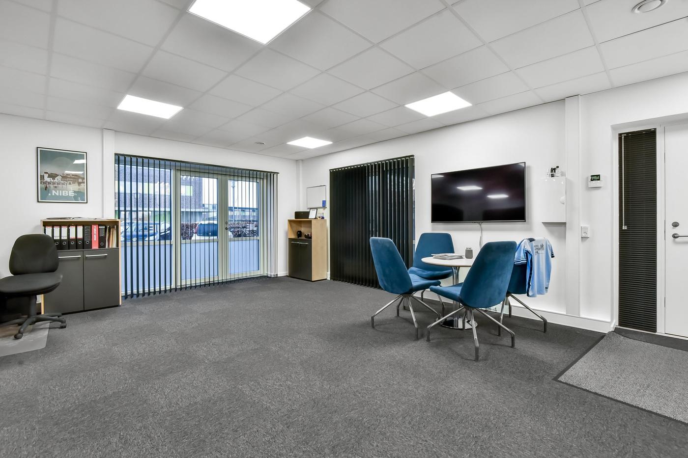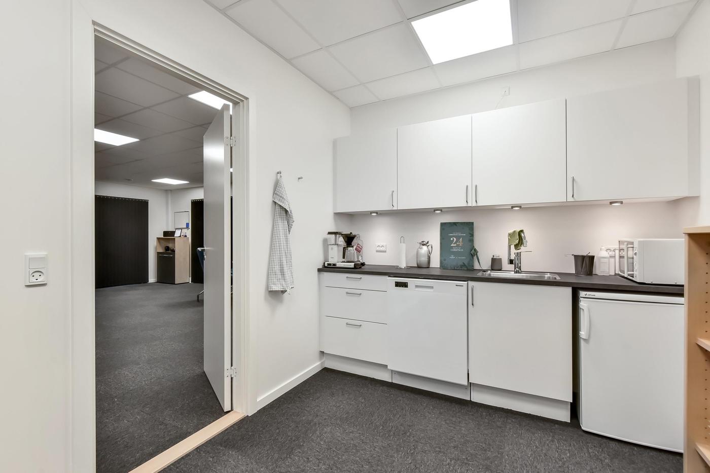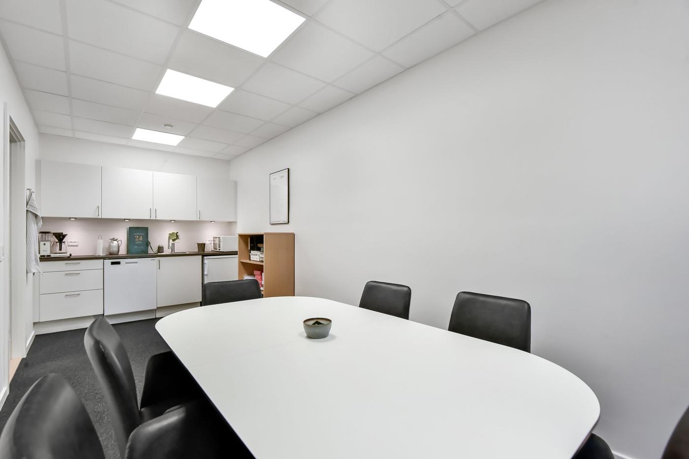 I tilknytning til det åbne kontor er der lukket kontor/mødelokale med mørkt gulvtæppe, hvide vægge og lofter. Herudover er der et hvidt the-køkken med opvaskemaskine, køleskab og overskabe samt toilet med hvide klinker og hvidt badeværelsesmøbel.