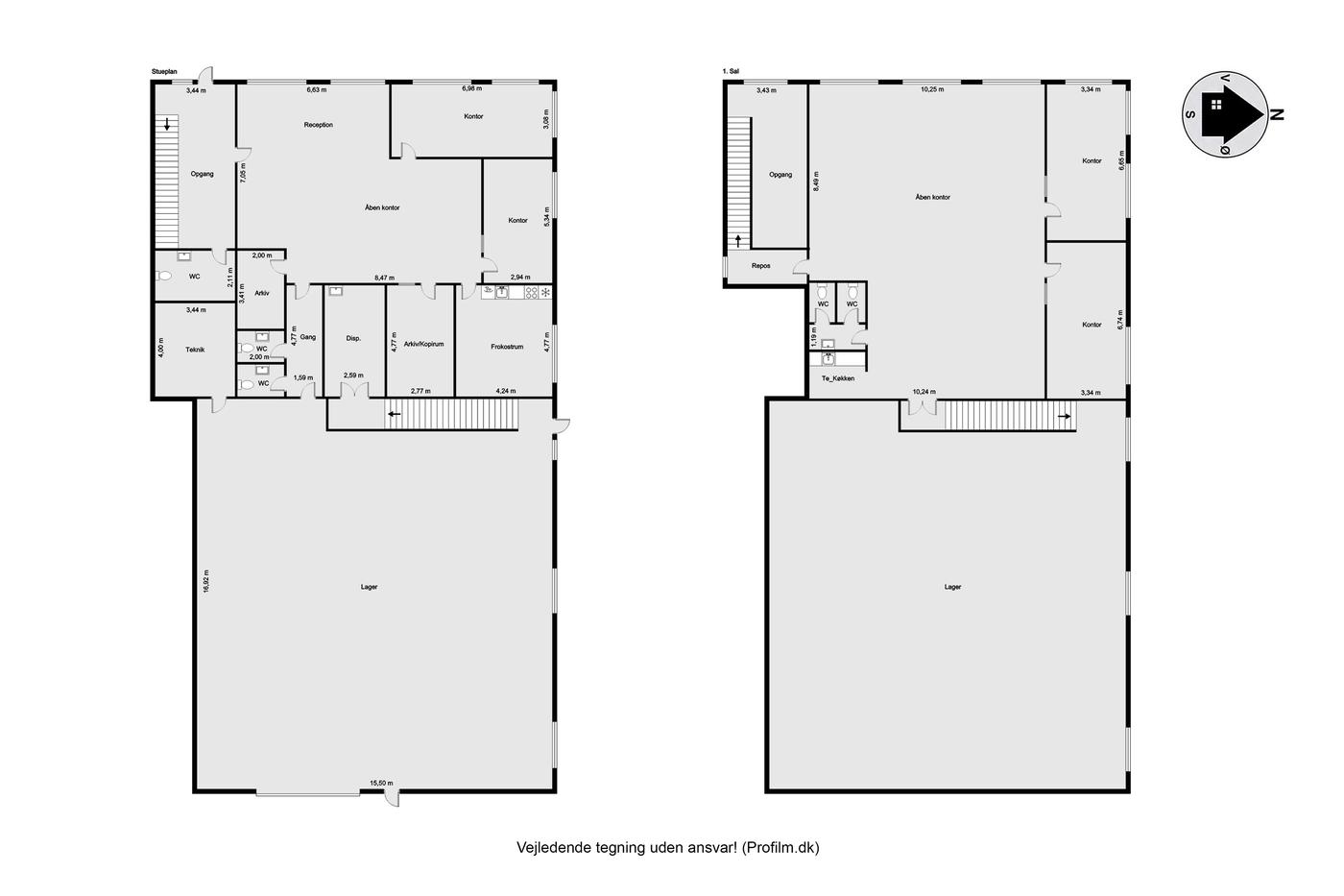Lejemålet er på i alt 729 m² bestående af 450 m² kontor- og administrationslokaler samt 279 m² højloftet lager samt adgang til befæstet areal omkring bygningen.