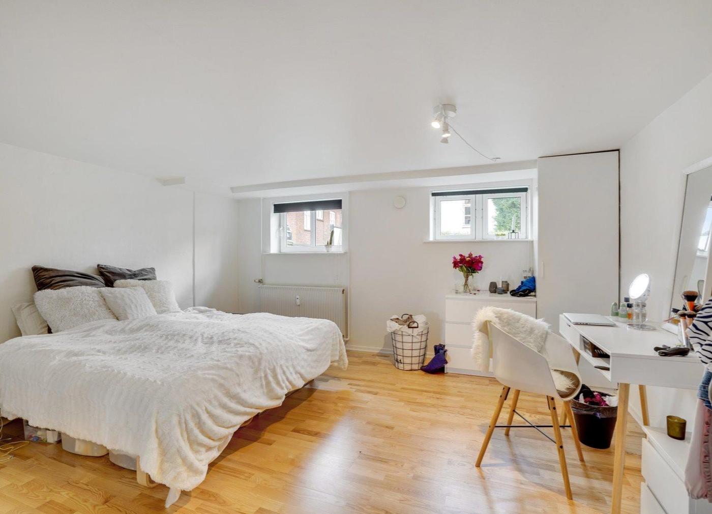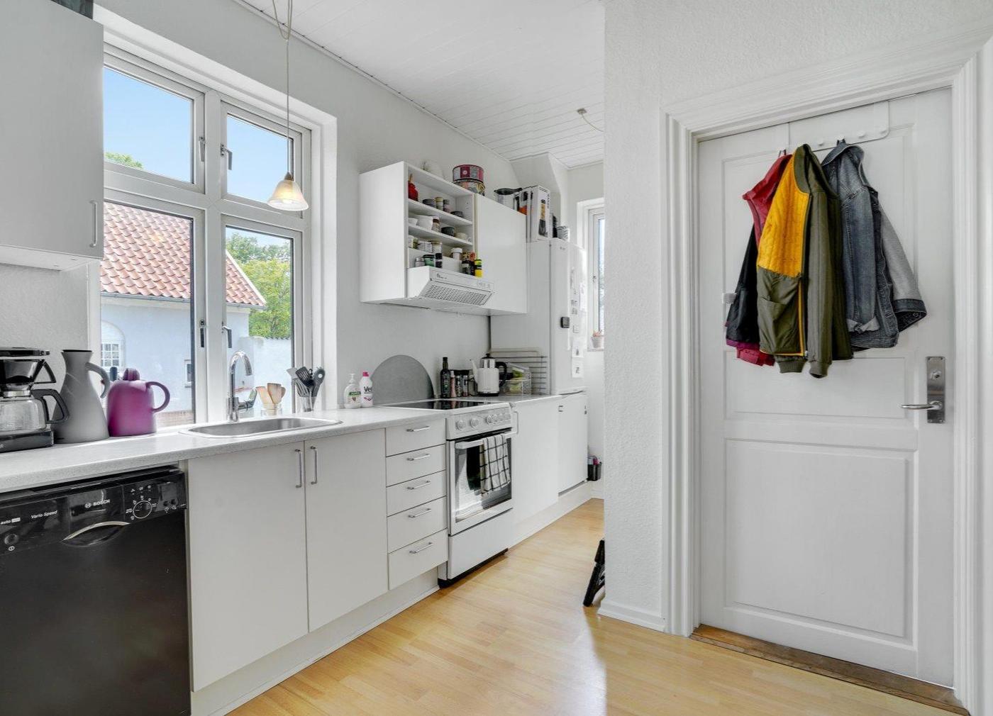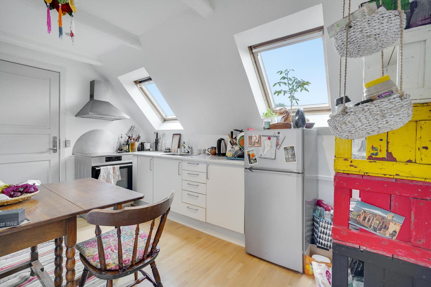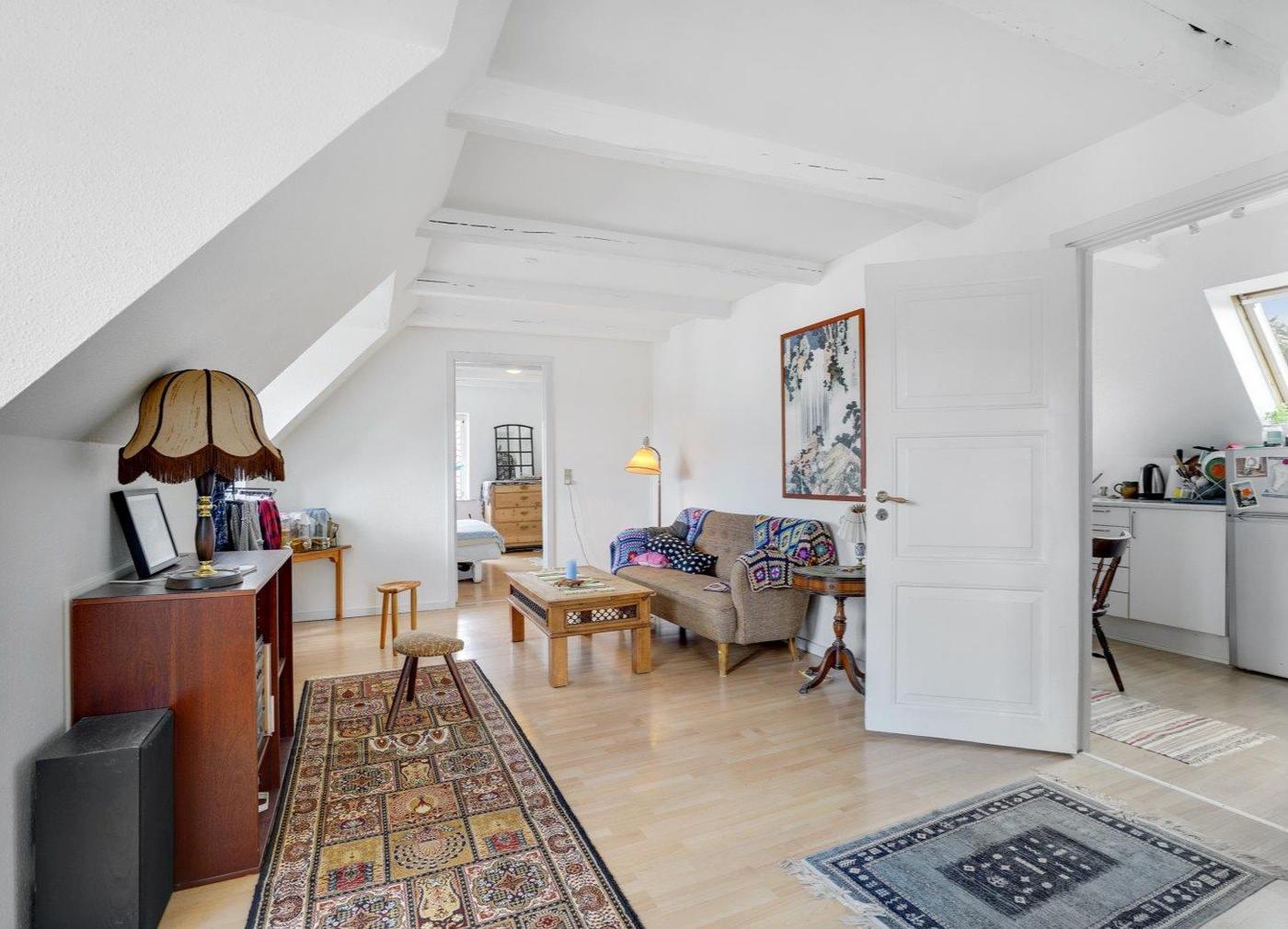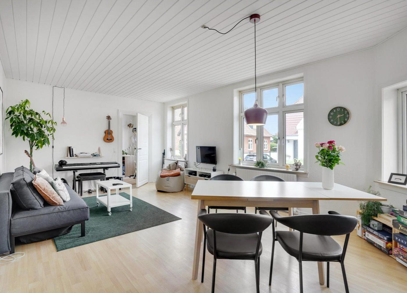 Stuelejligheden er på 103 m² og fremstår lys og med god loftshøjde - består af entré, stor stue, køkken med spiseplads, nyrenoveret badeværelse, værelse samt mindre værelse.