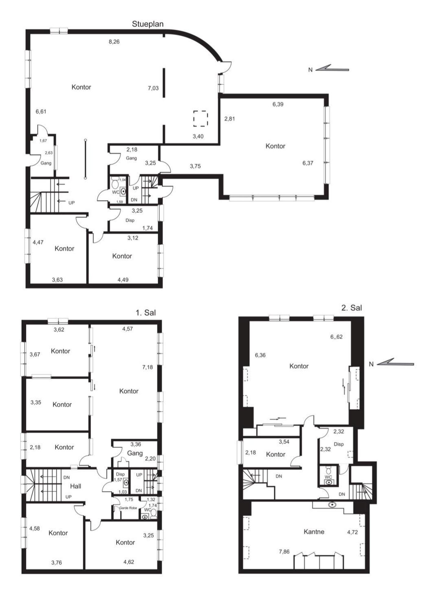 De 3 etager er pt. indrettet til kontor, men der er udarbejdet arkitekttegnede skitser, med forslag til ombygning i 6 stk. beboelseslejligheder.