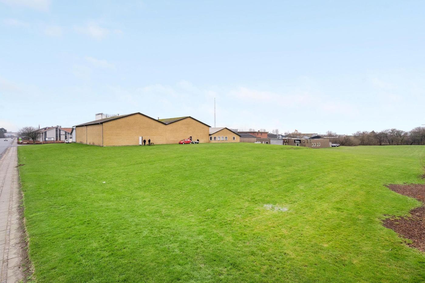 Grunden er på 8.268 m², heraf 444 m² vej, og der kan således være mulighed for yderligere bebyggelse af ejendommen, idet der ifølge lokalplan må bebygges med 50%. Grunden er udover asfalteret parkeringsområde, udlagt i græs.