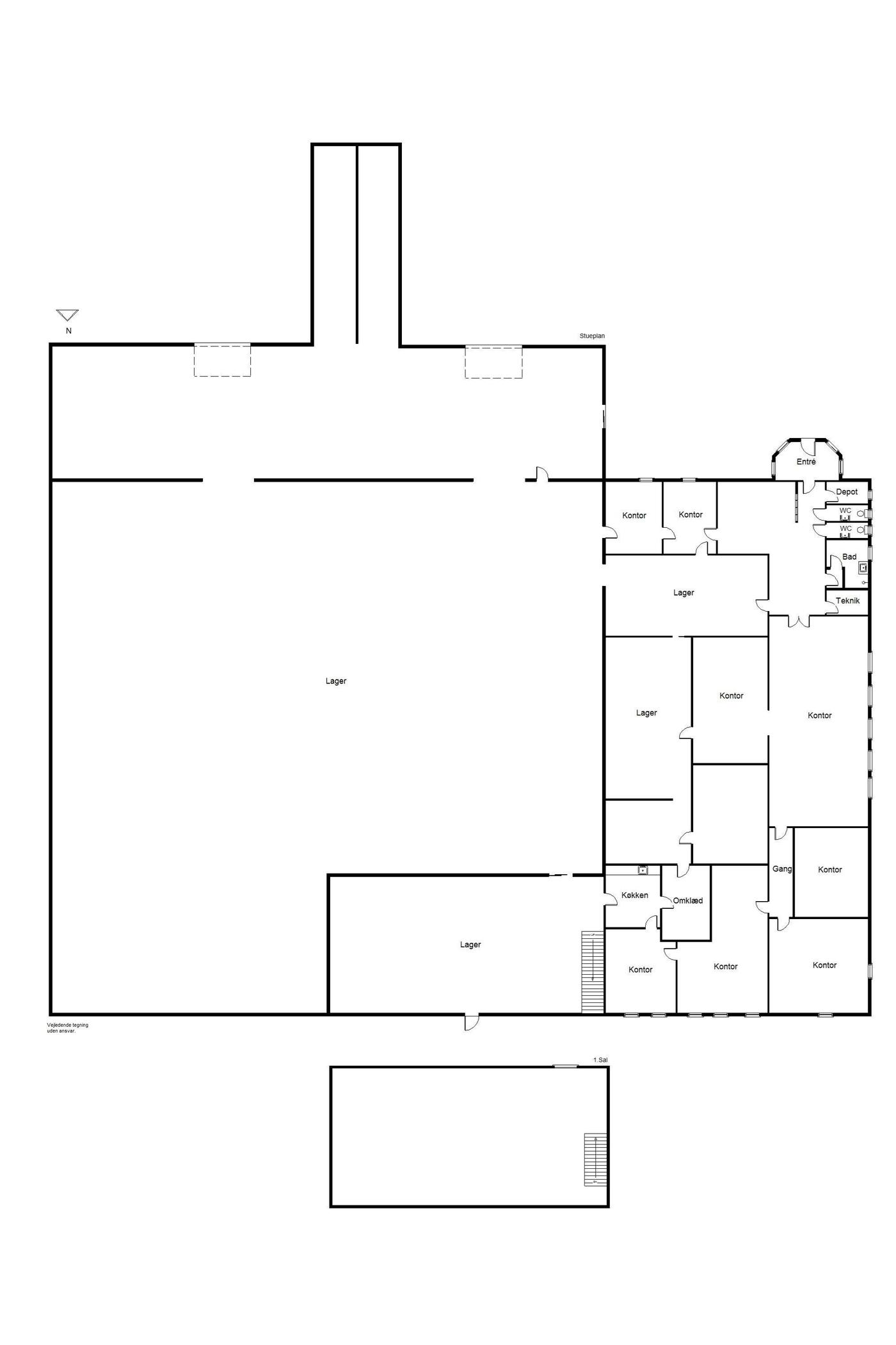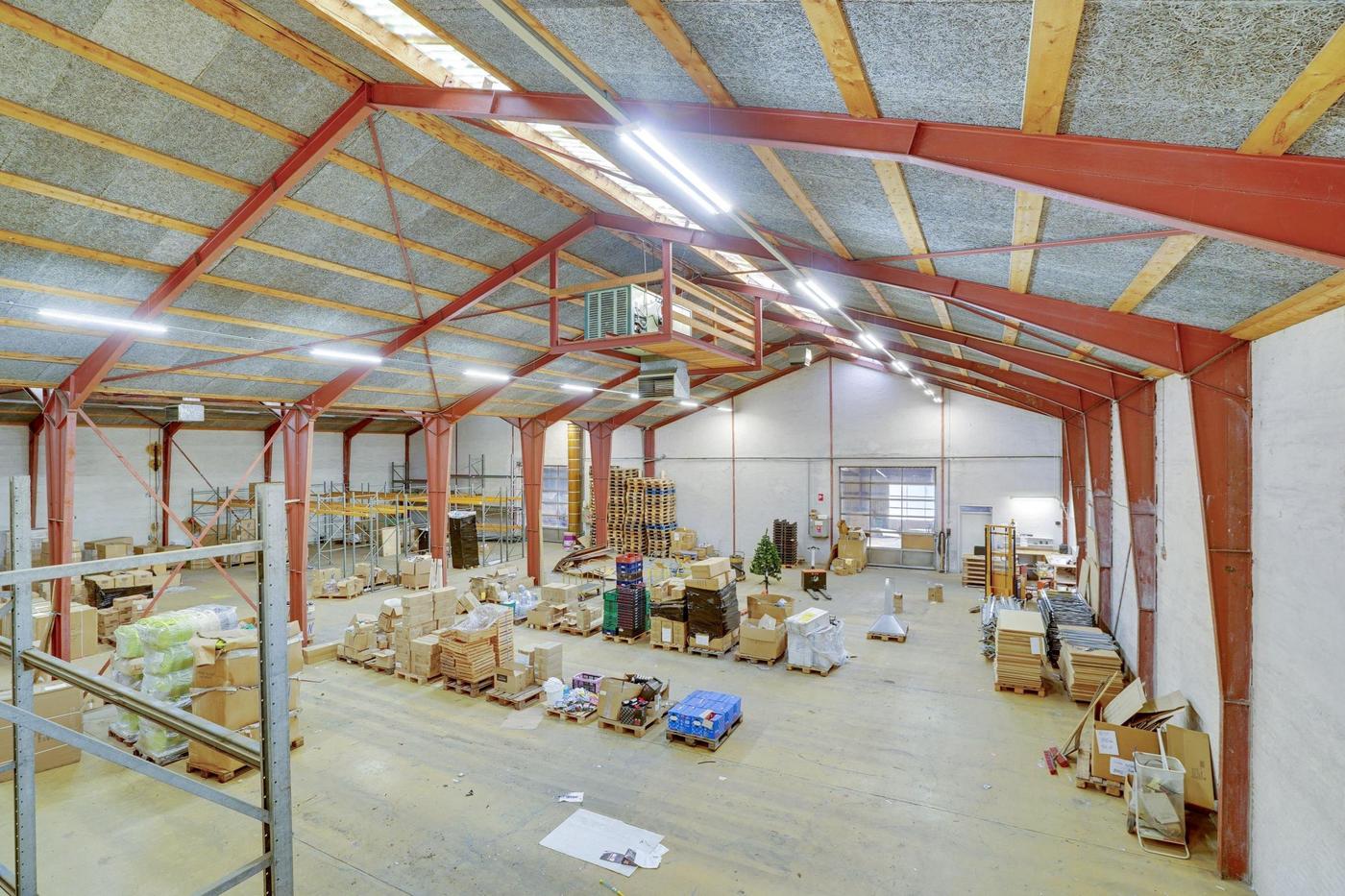 Der er ialt 1.657 m² bebygget erhvervsareal, der består af 2 gode haller med god loftshøjde. Hallerne er sammenbyggede. I den ene hal er der for enden etableret et højlager. Foran hallerne er etableret en læsserampeområde (uisoleret stålpladebygning). Der er endvidere en del gode kontorer i varierende størrelser, depotrum, frokostrum m.v.