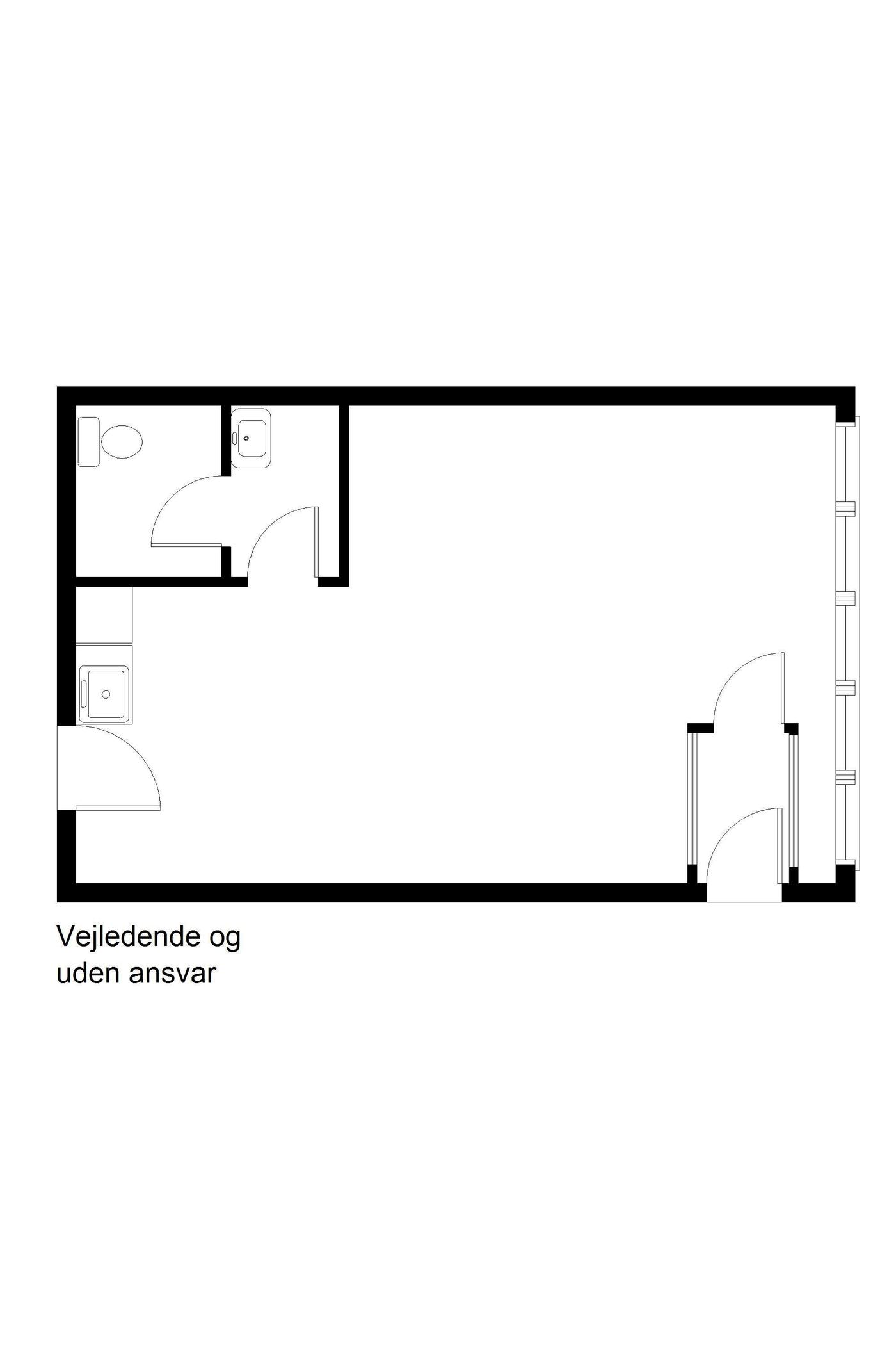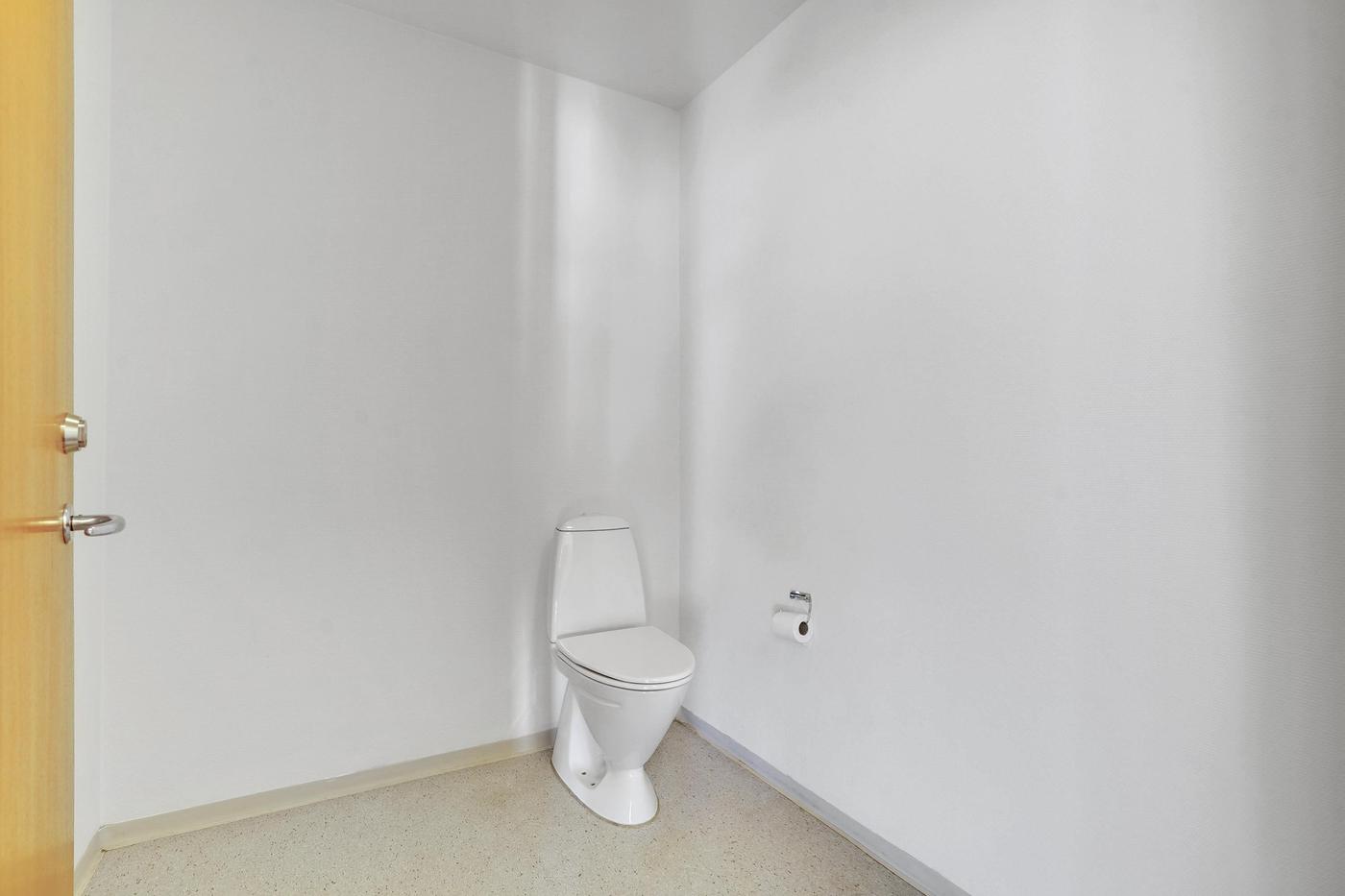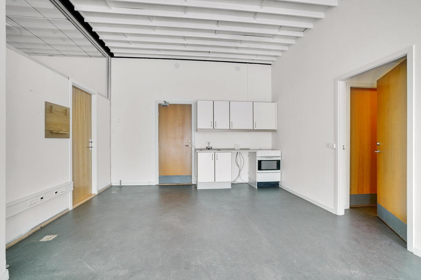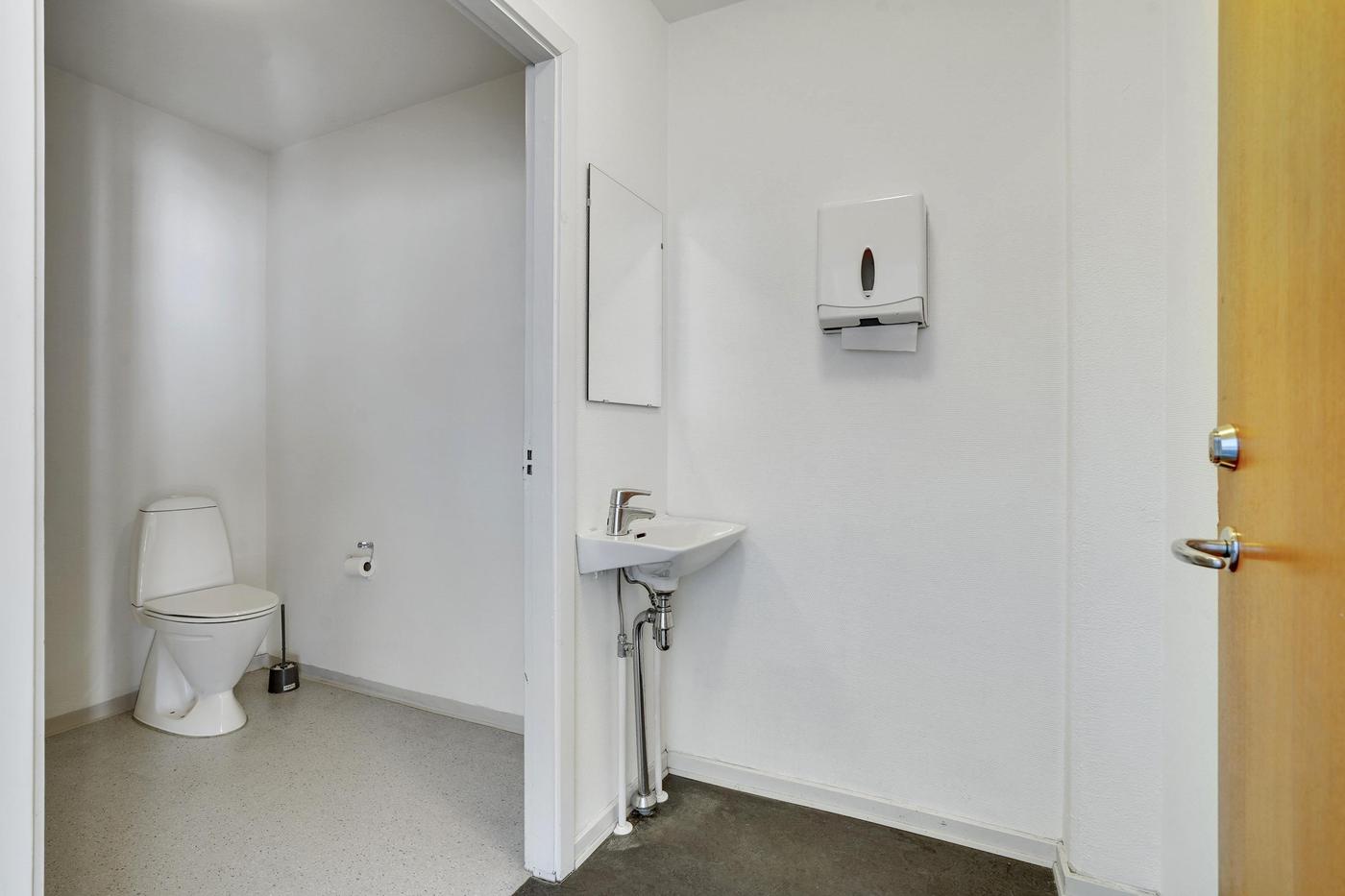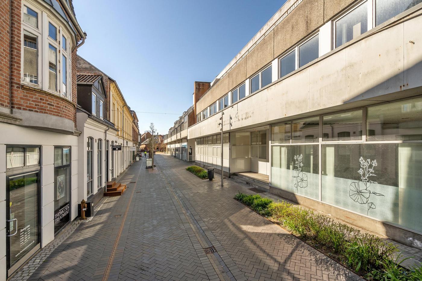 Det består af entré / vindgang - stort regulært rum velegnet til butik, klinik, kontor eller lignende. Her er der et mindre the-køkken med vask. Forgang til toiletfaciliteter.