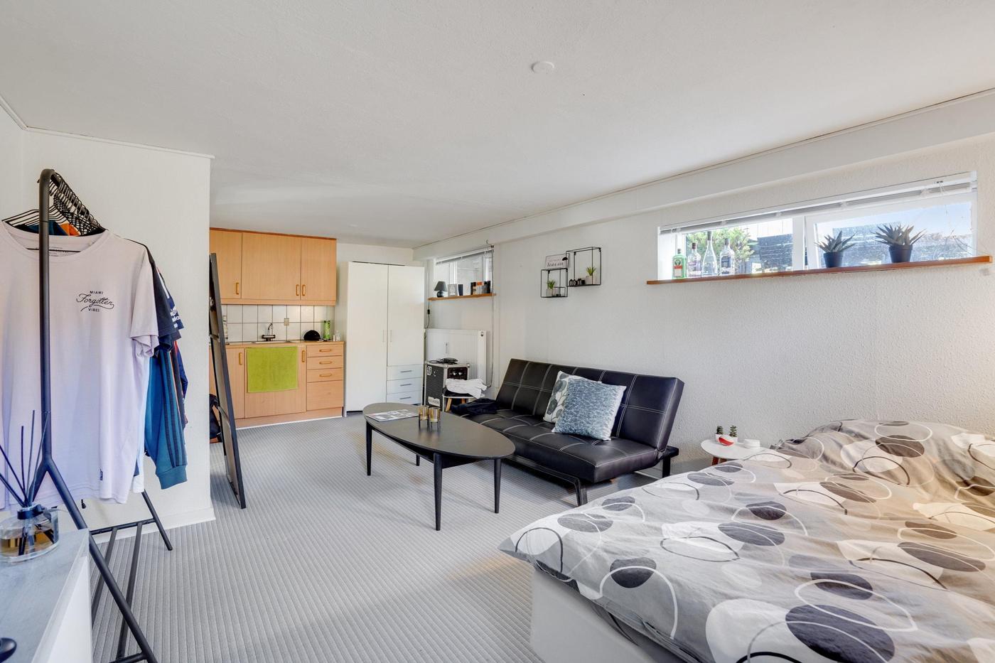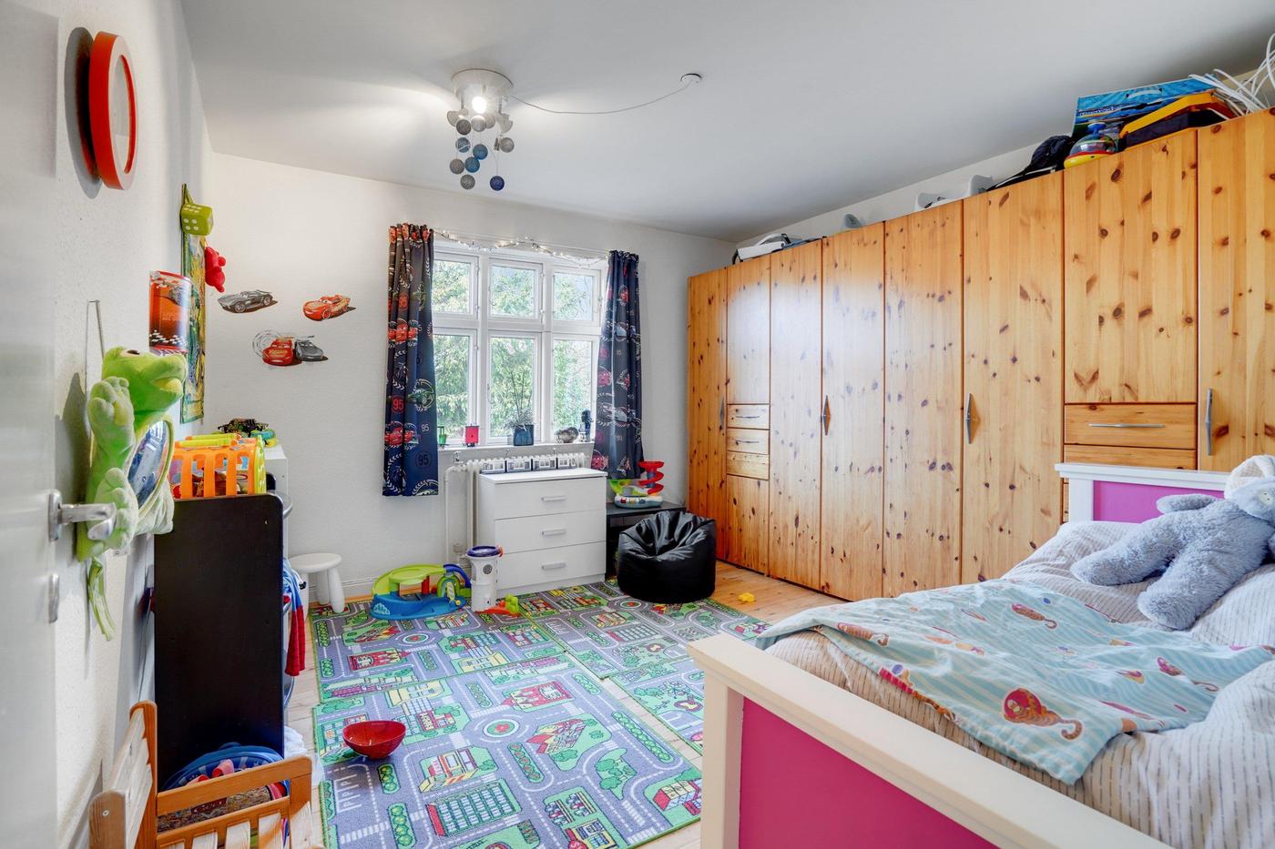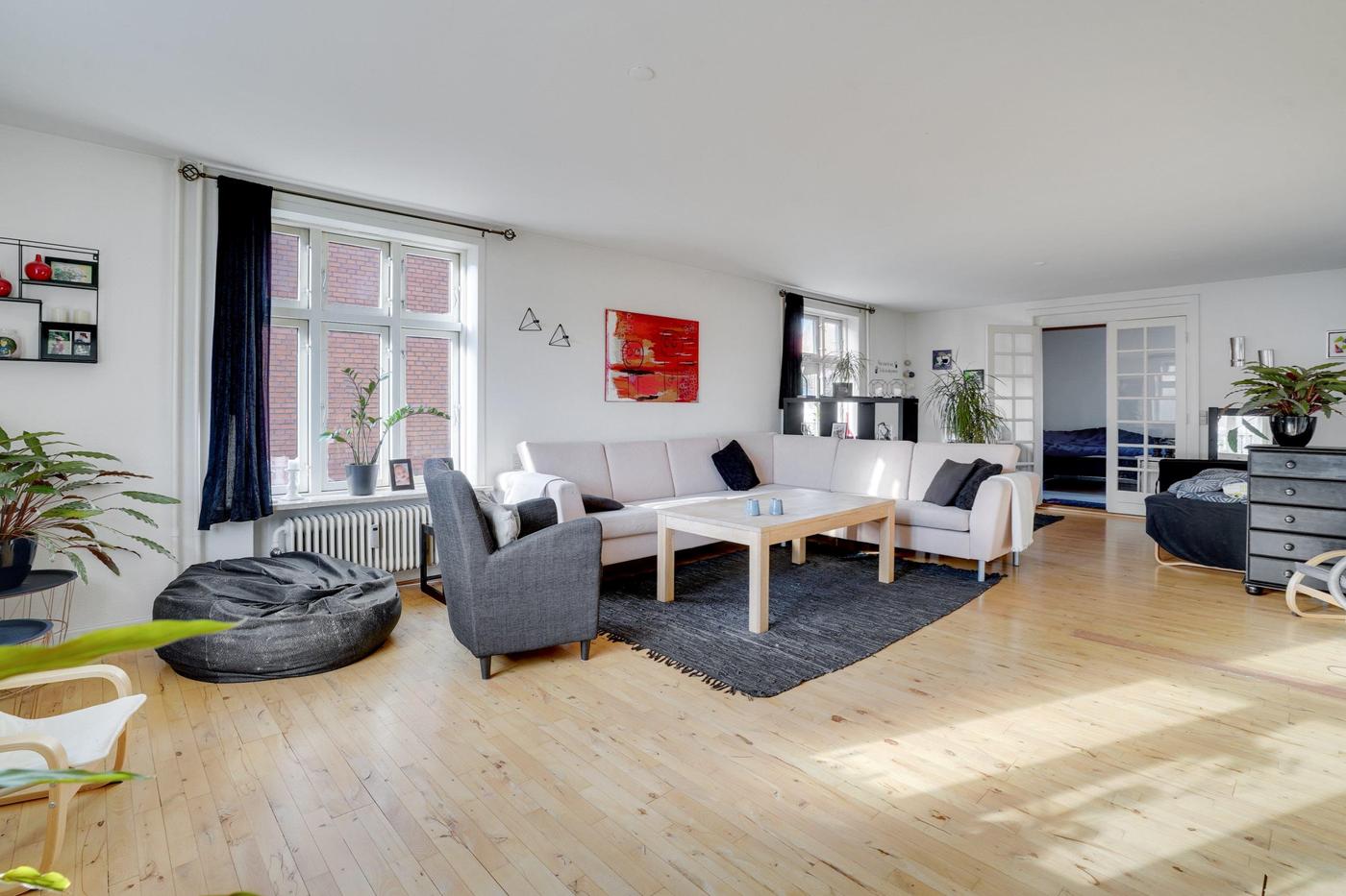 Den rummelige lejlighed i stueplan består af køkken/alrum med udgang til vestvendt terrasse, 2 værelser, stor stue og badeværelse. Dette lejemål har også adgang til 2 disponible rum i kælderen.