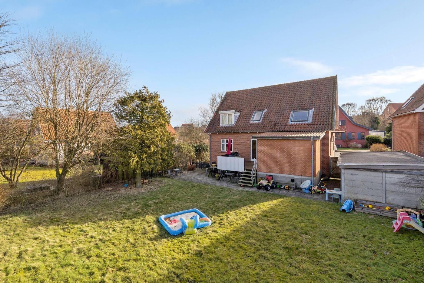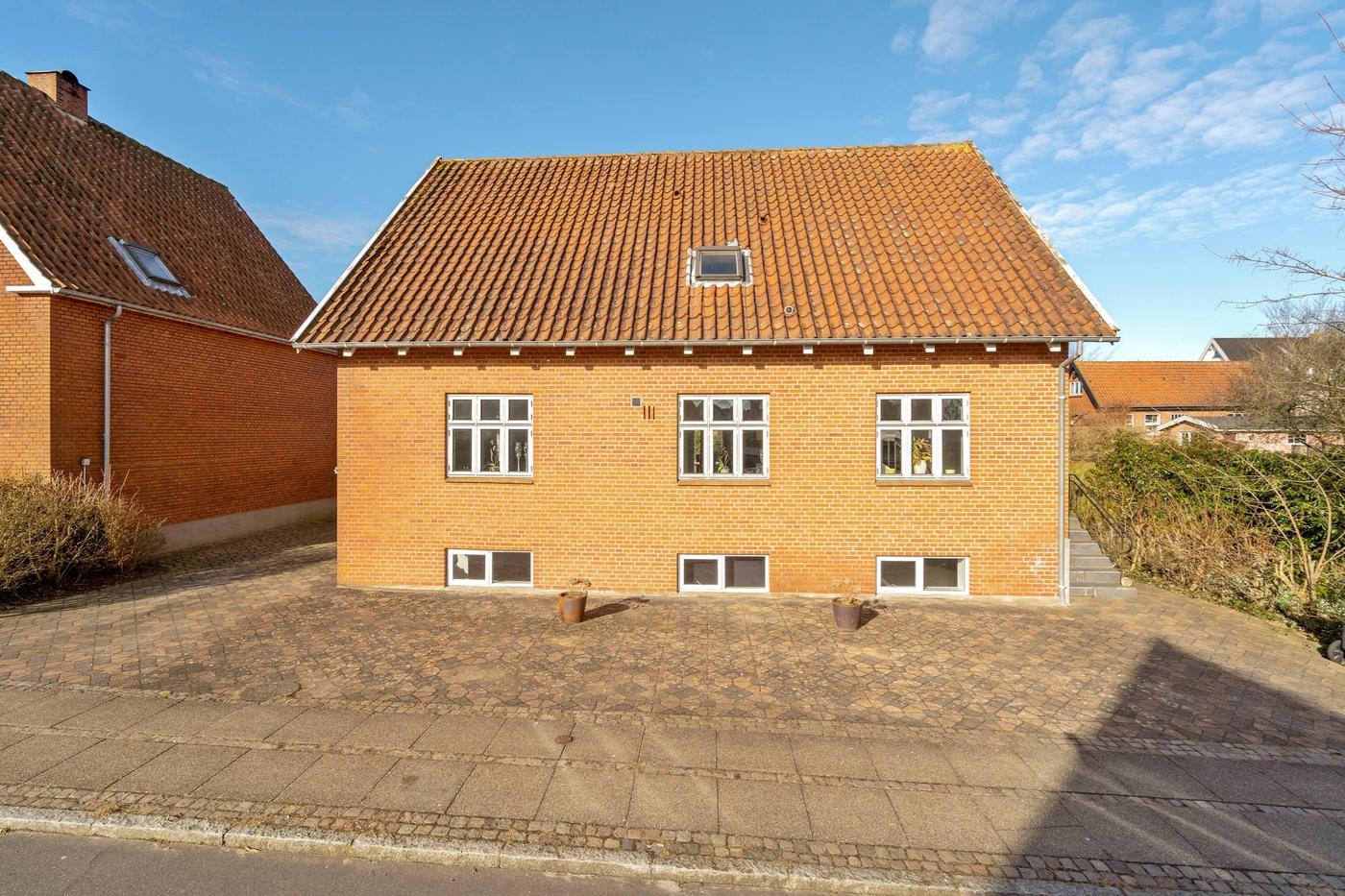 Ejendommen fremstår som en god og solid rødstensbygning med tegltag og termovinduer.