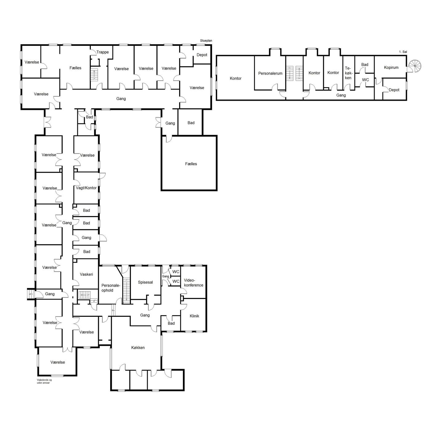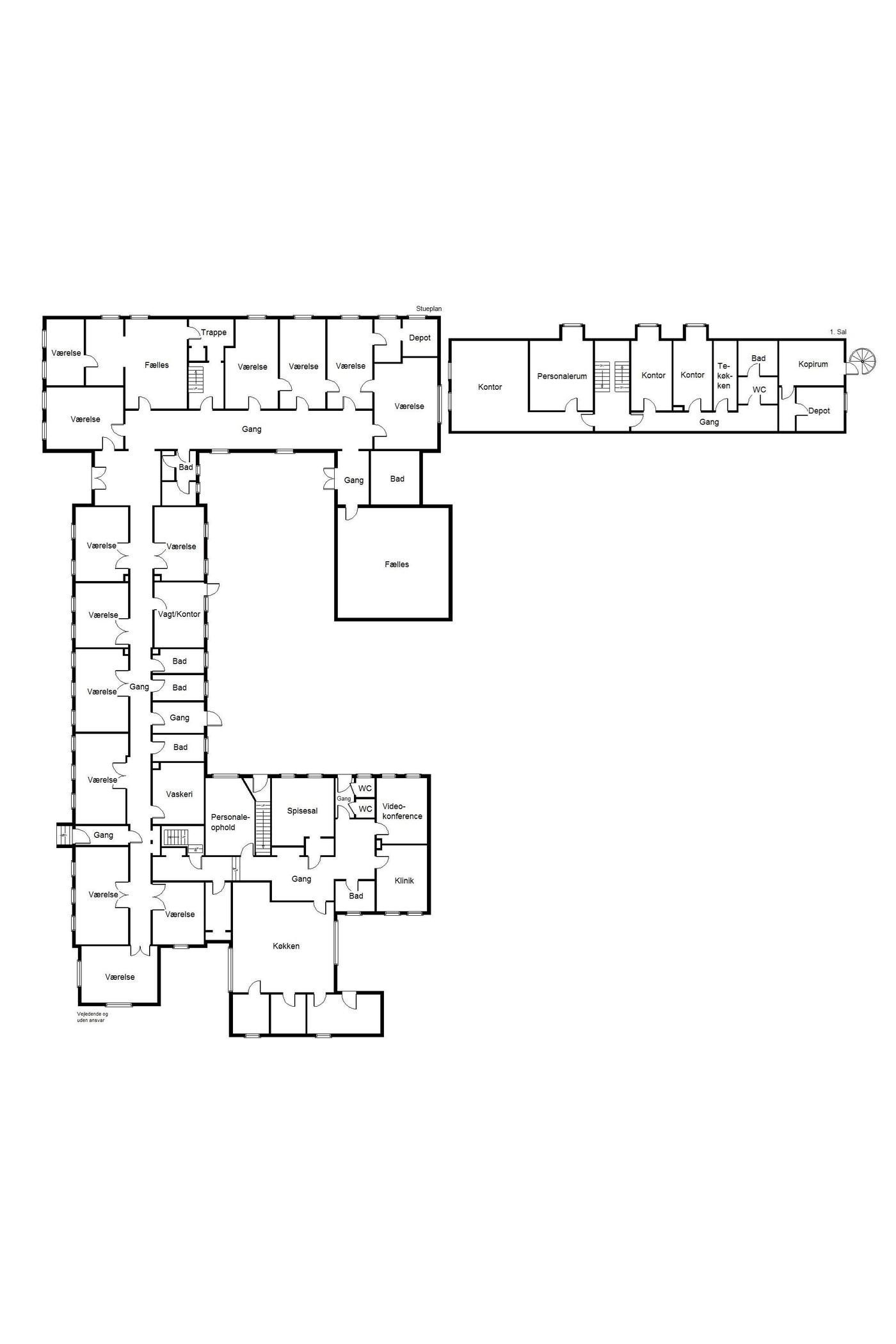 1. salen i hovedbygningen og sidebygningerne er opdelt i flere rum, der tidligere har været benyttet til beboelse for sygehusets medarbejdere. 1. salen henstår som ubenyttet loftsrum grundet lav loftshøjde.