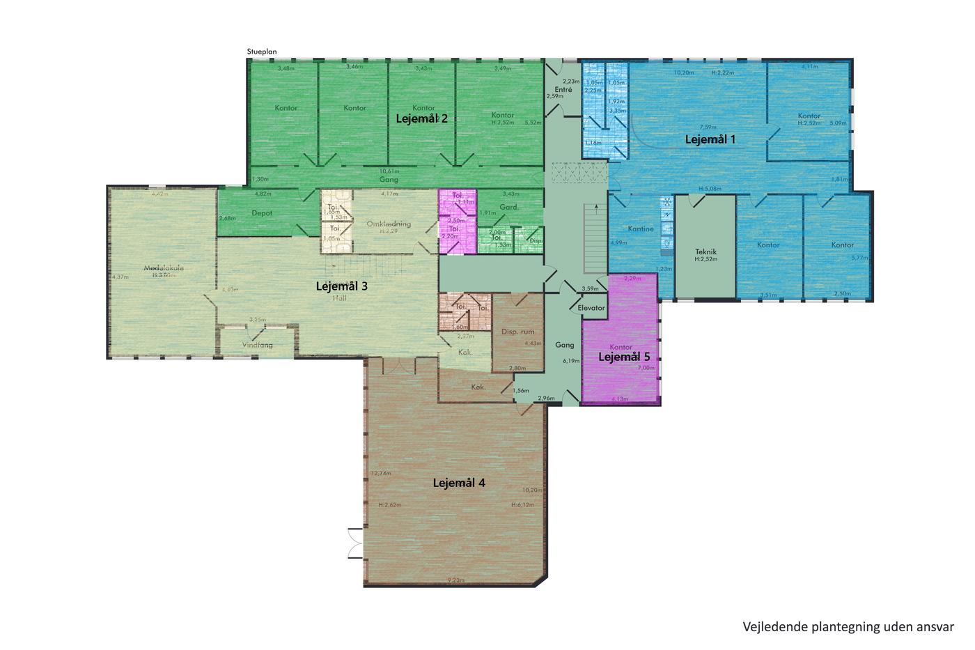 Lejemål 2 er indrettet med fordelingsgang med adgang til 4 kontorer / mødelokaler med adgang til depot, garderobe og toilet. Der etableres thekøkken til lejer.