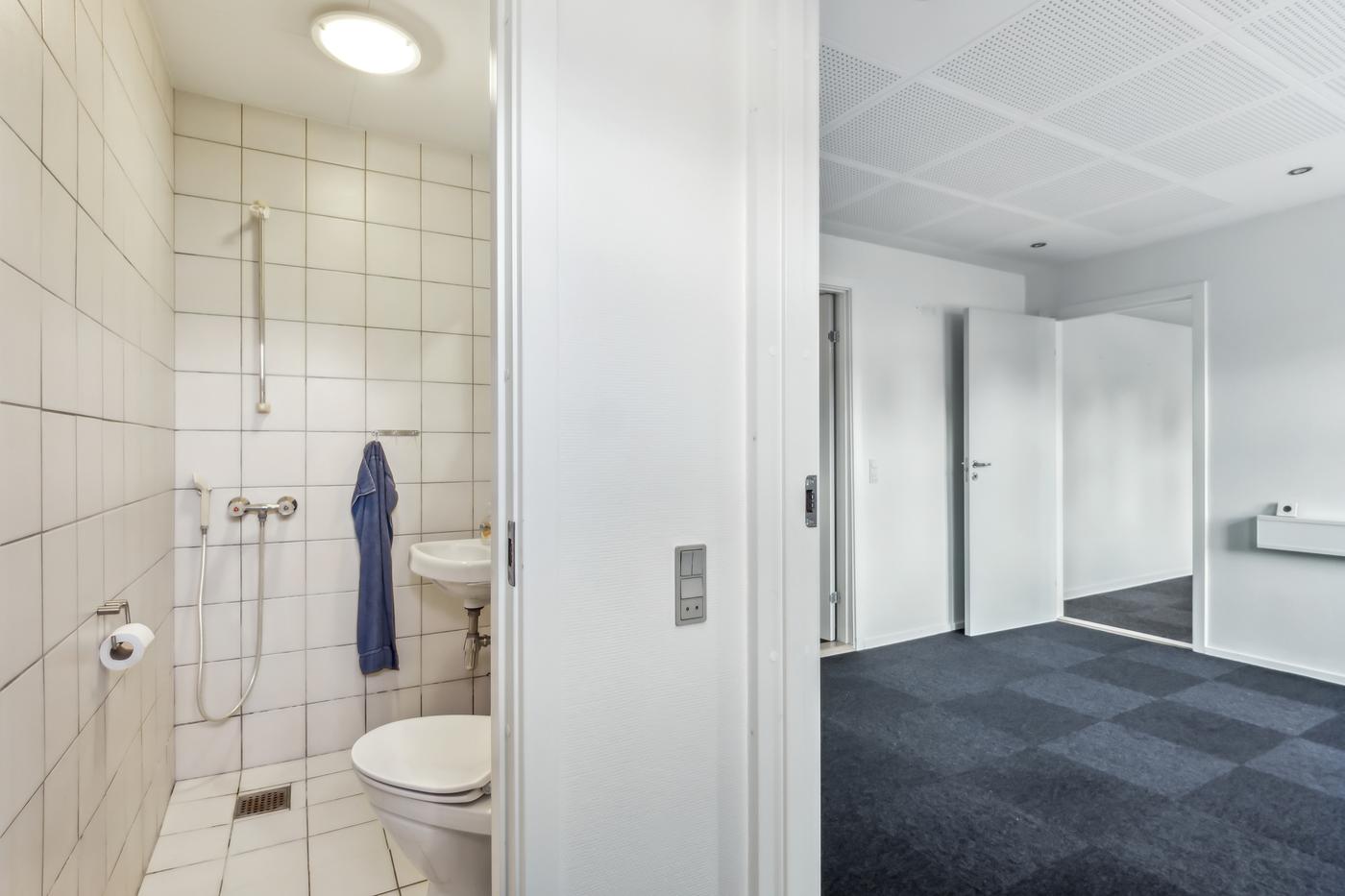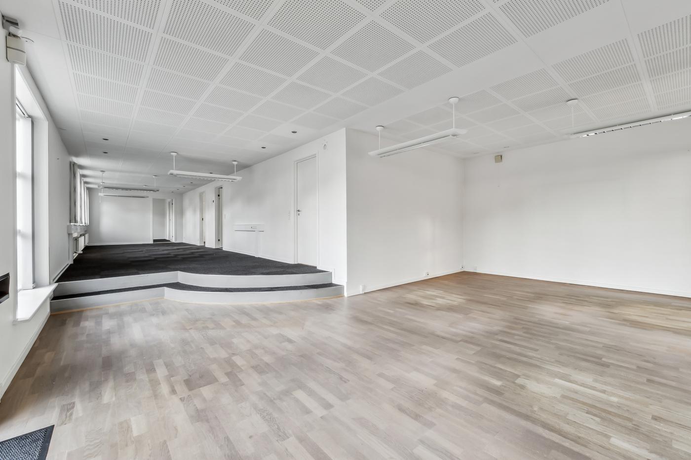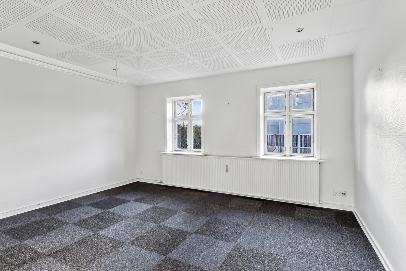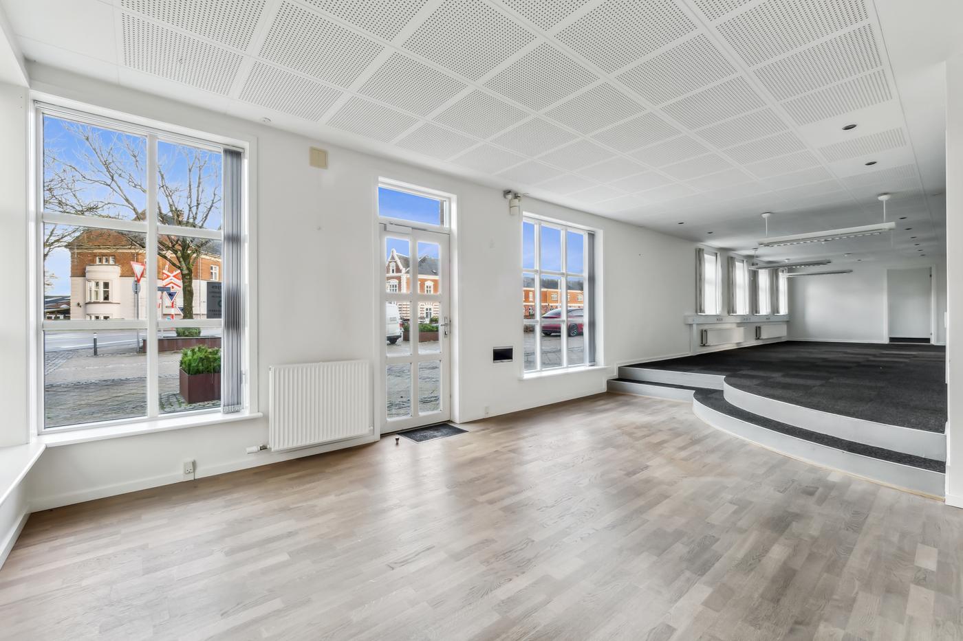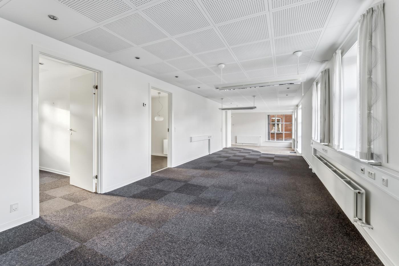 Lejemålet fremstår lyse og indbydende med store vinduespartier, der skaber et behageligt arbejdsmiljø.