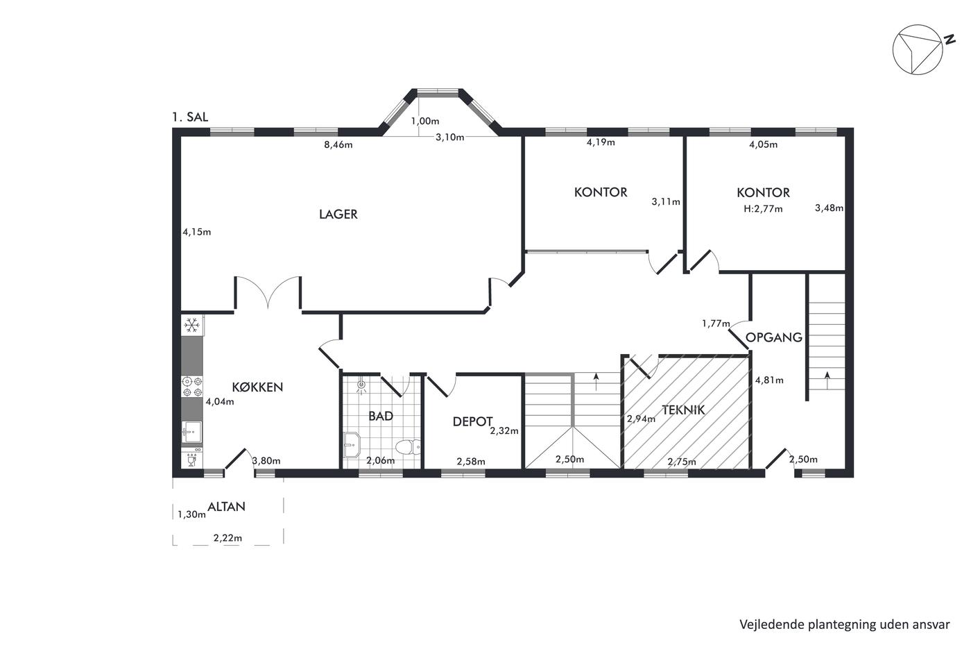 Lejemålet er beliggende på 1. sal, hvor der er flere kontorer og personalefaciliteter, herunder køkken, toilet og bad.