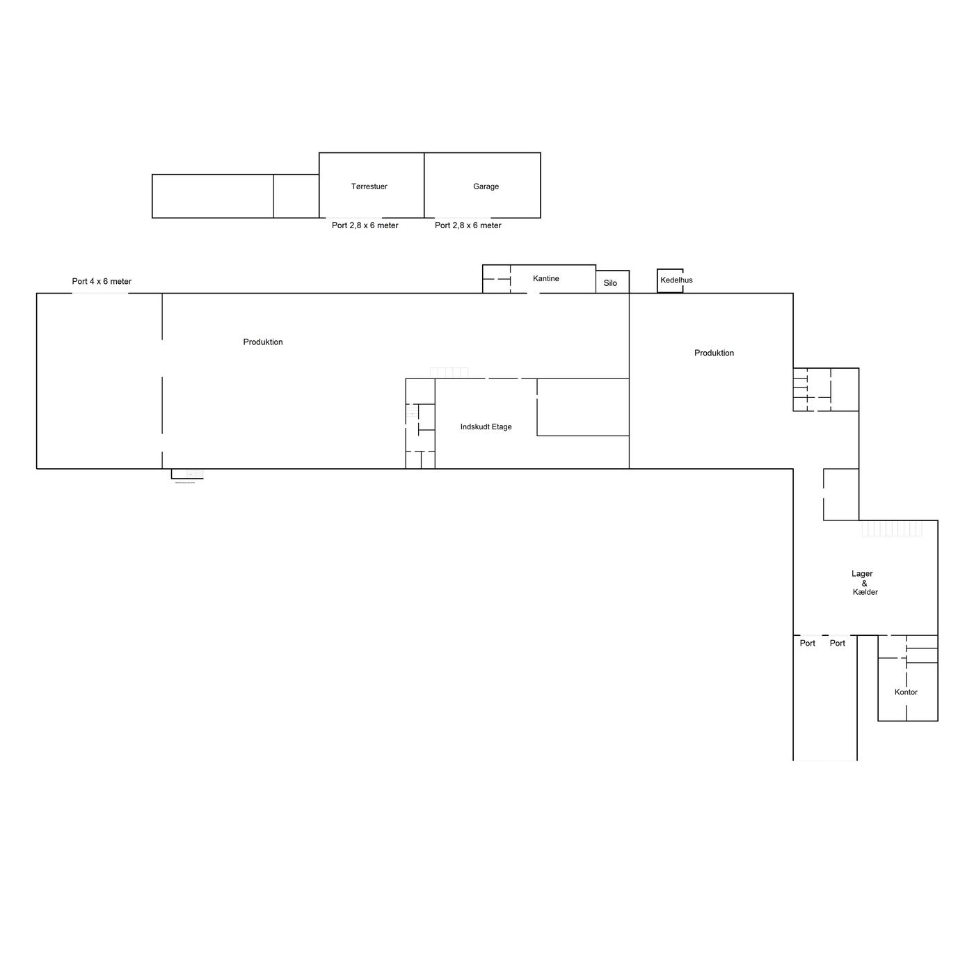 Porte: 2 aluhejseporte på hhv. ca. 2,5 x 2,5 meter og H: 3 x 3 meter med rampetilkørsler. 1 port i terræn på H: 4 x B: 6 meter.
