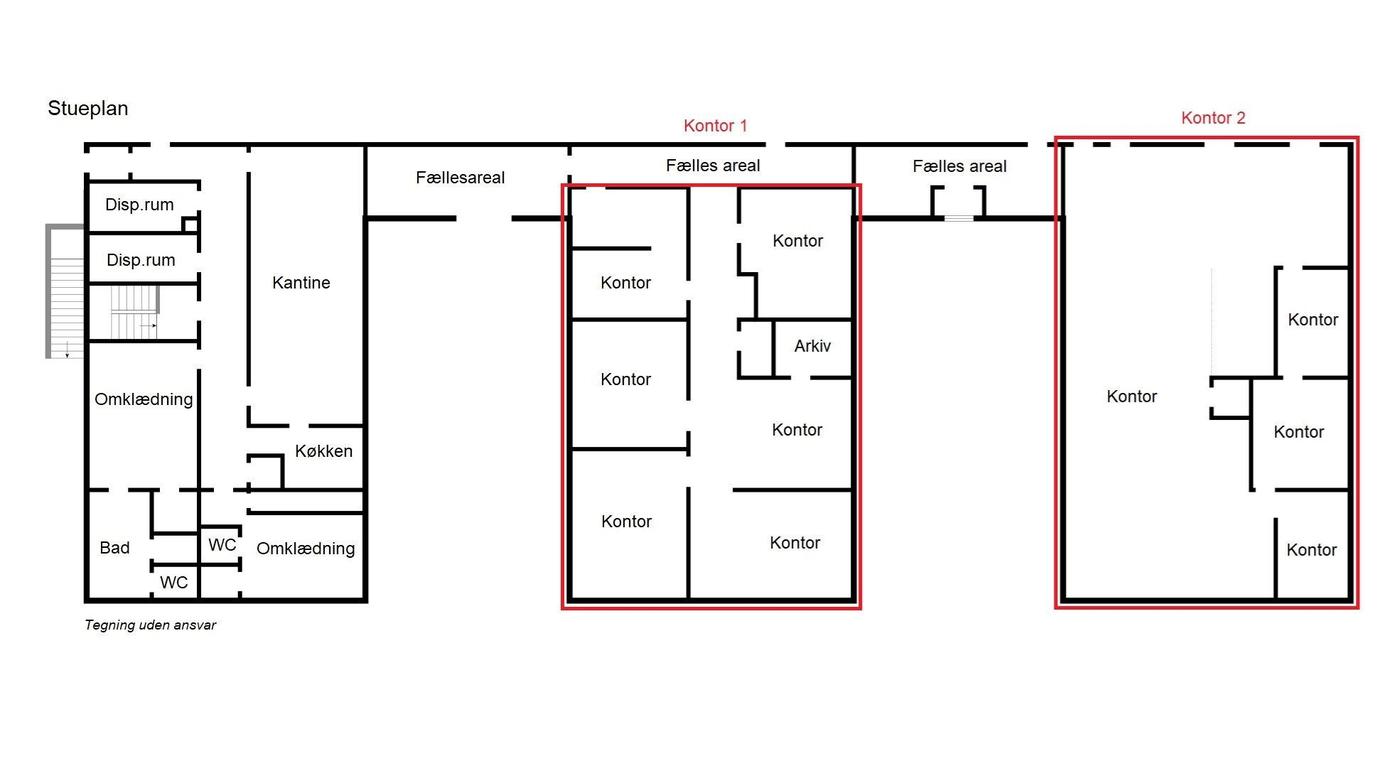 Indretning: Lejemålet har sammen med nabolejemålet et fælles indgangsparti samt fordelingsgang. Kontorarealet er opgjort til ca. 224 kvm og fordeler sig med et stort og åbent kontormiljø samt 3 gode enkeltmandskontorer.