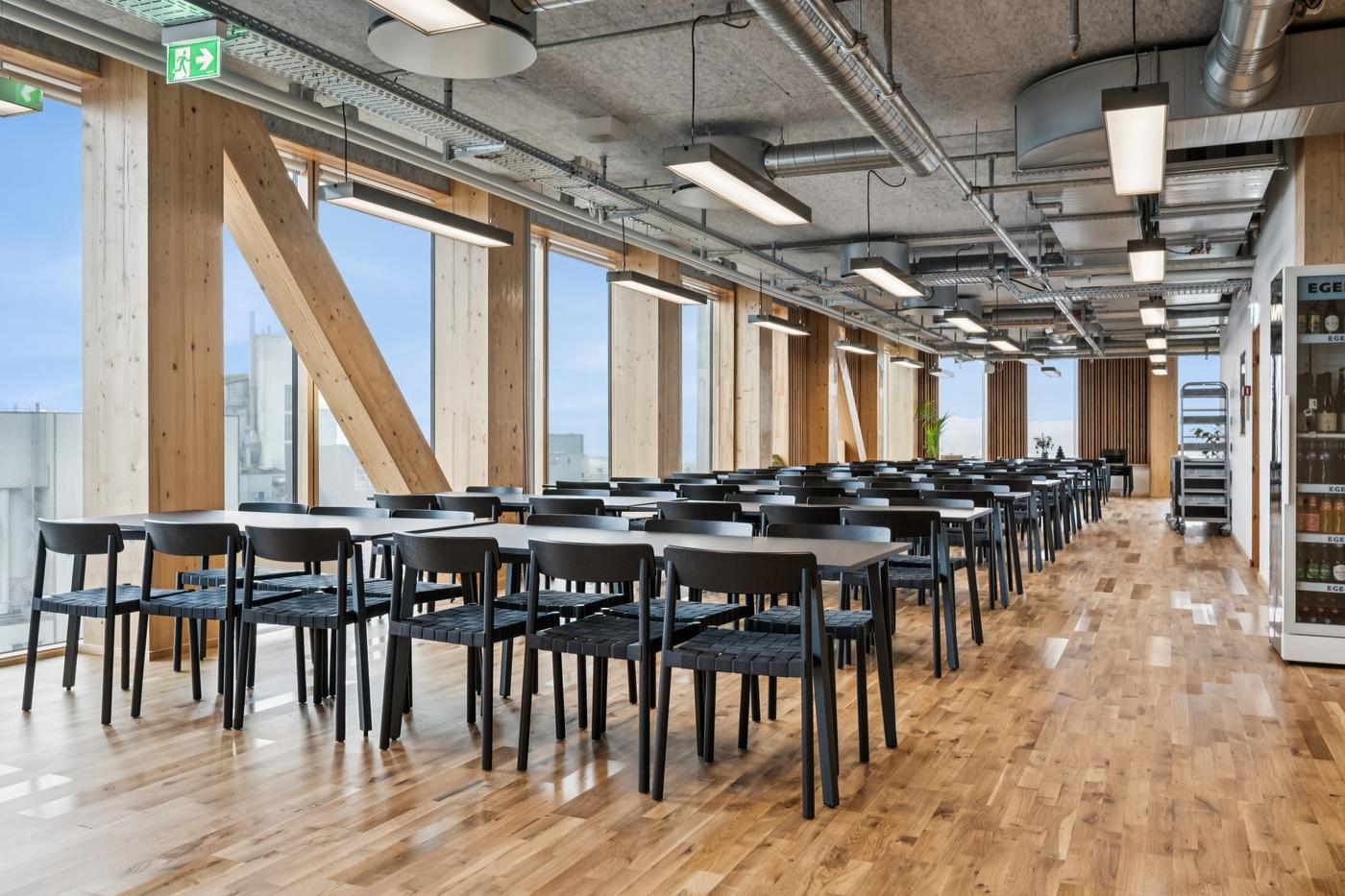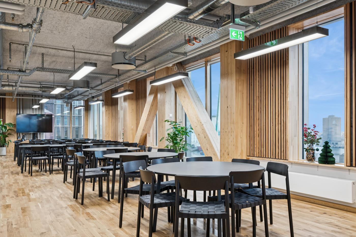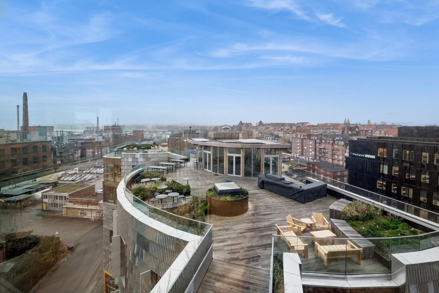 Som lejer i TRÆ får I adgang til fællesfaciliteter udover det sædvanlige. Frokosten indtages i den store fælles kantine på 7. og 8. sal. Herfra der er direkte udgang til den store fælles tagterrasse, som udover frokosten kan bruges til firmaevents i et afslappet loungemiljø med udsigt over byen og vandet.
