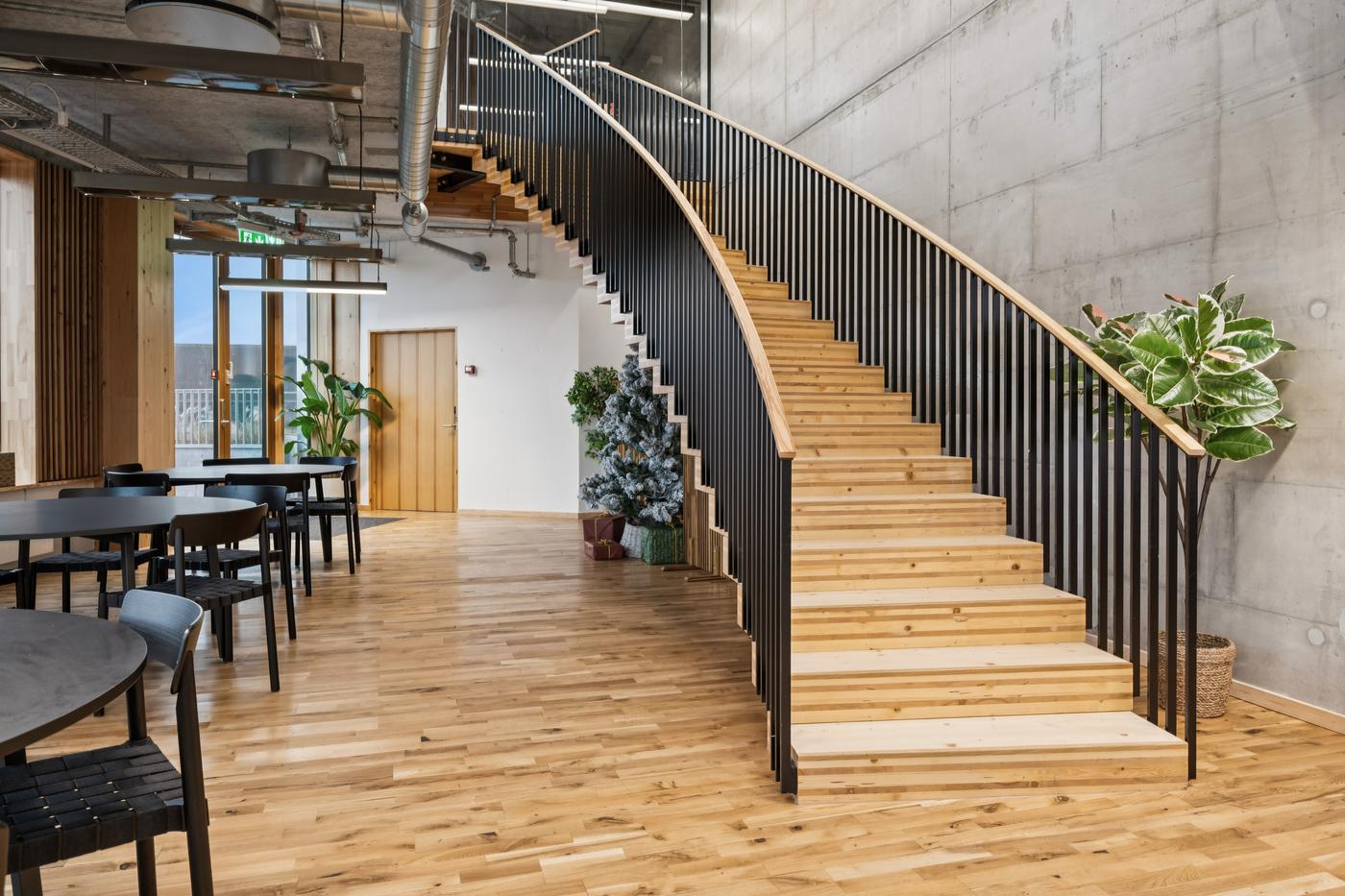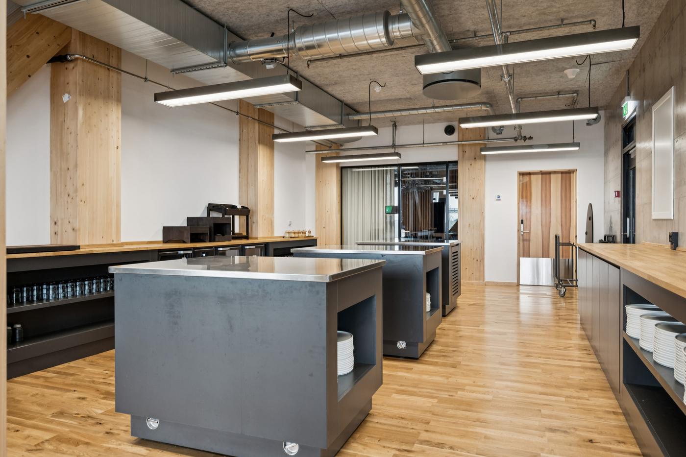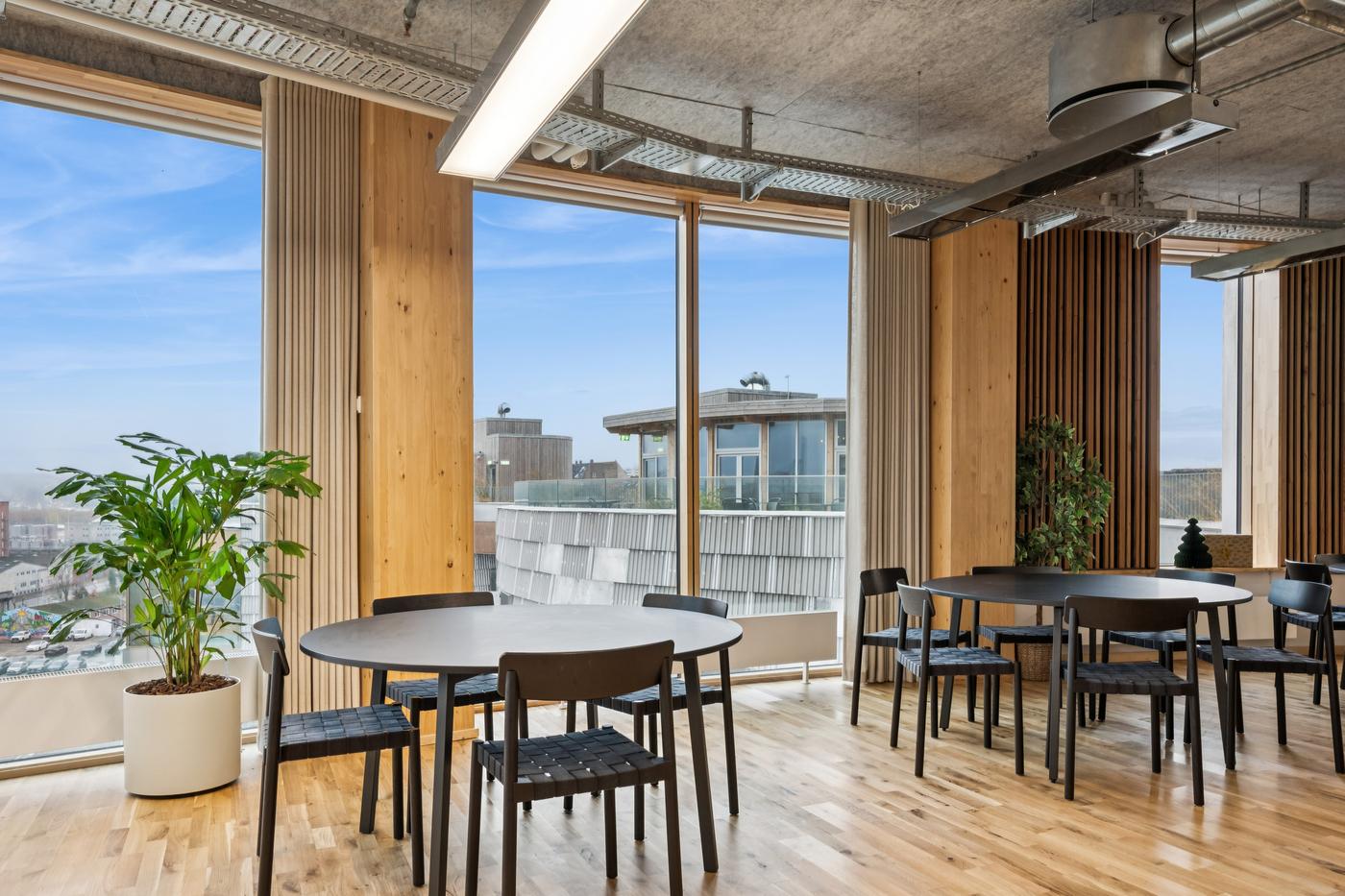 Som lejer i TRÆ får I adgang til fællesfaciliteter udover det sædvanlige. Frokosten indtages i den store fælles kantine på 7. og 8. sal. Herfra der er direkte udgang til den store fælles tagterrasse, som udover frokosten kan bruges til firmaevents i et afslappet loungemiljø med udsigt over byen og vandet.