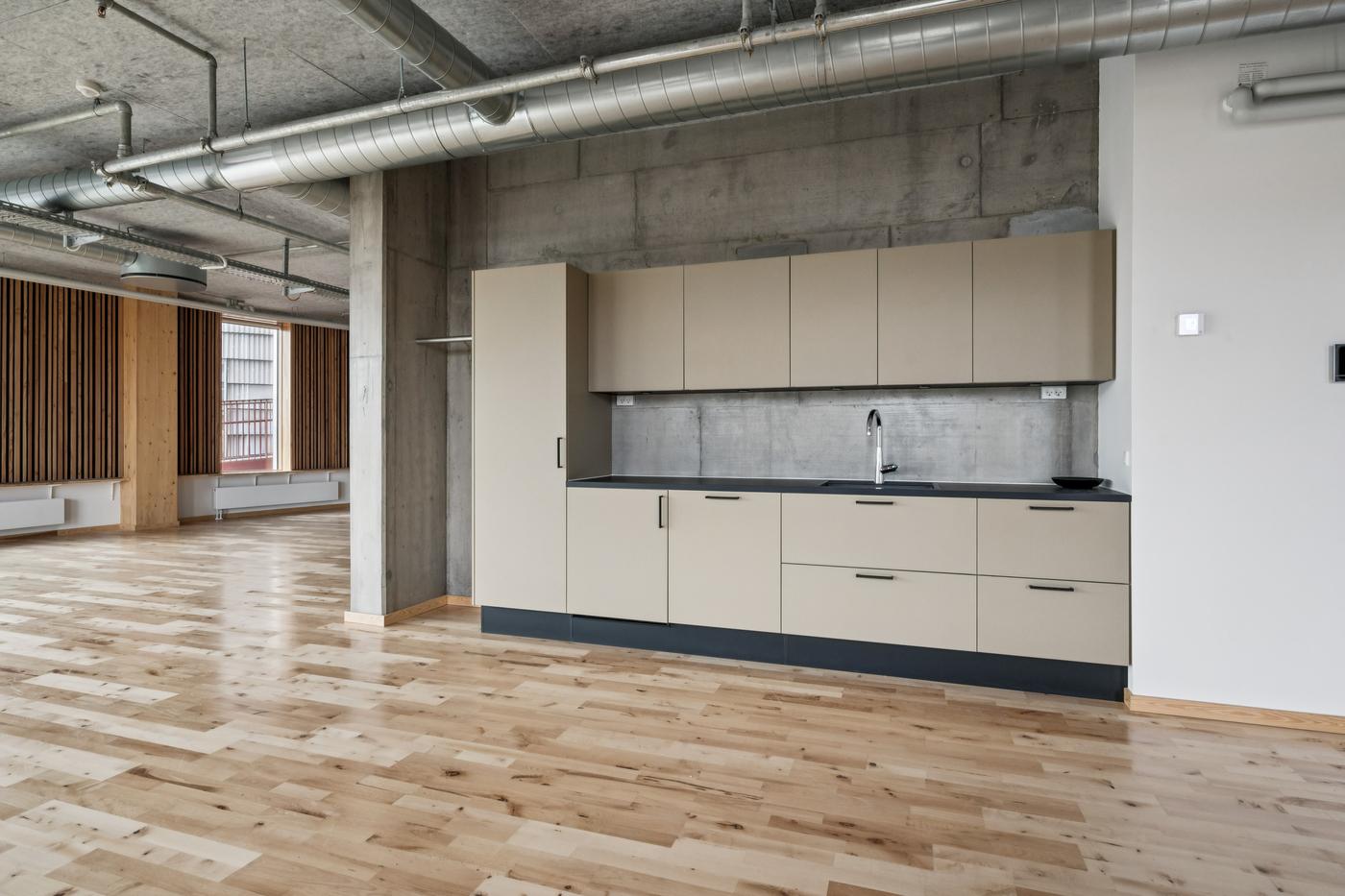 I dette lejemål på 1. sal i Kalkværksvej 5 får jeres virksomhed en inspirerende base med karakteristiske bjælker og udsigt til byens udvikling. Lejemålet har tekøkken og toiletfaciliteter, mens de fleste af fællesfaciliteterne findes i samme bygning.