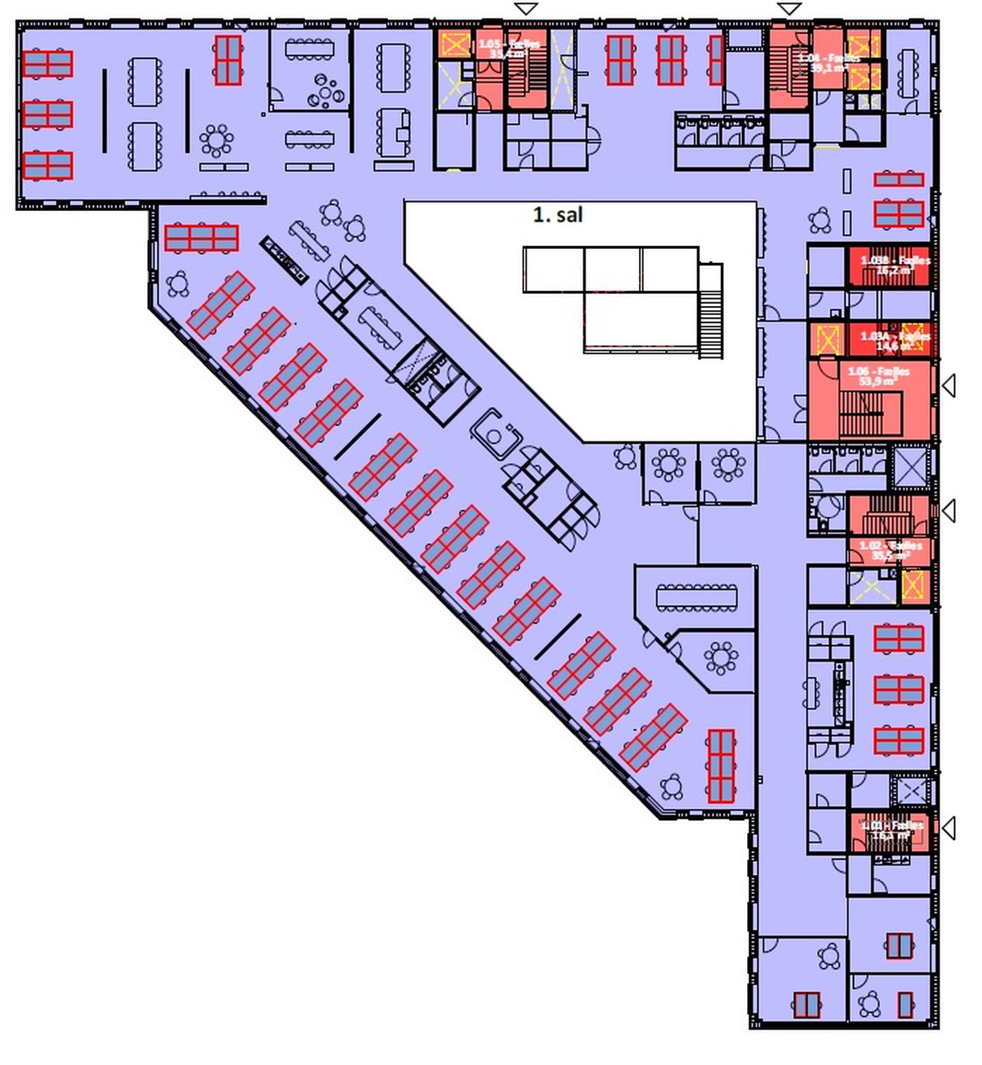 Ejendommen indeholder områder med mulighed for storrumskontor, mødelokaler i forskellige størrelser, stillerum, tekøkkener samt toiletter med garderobe.