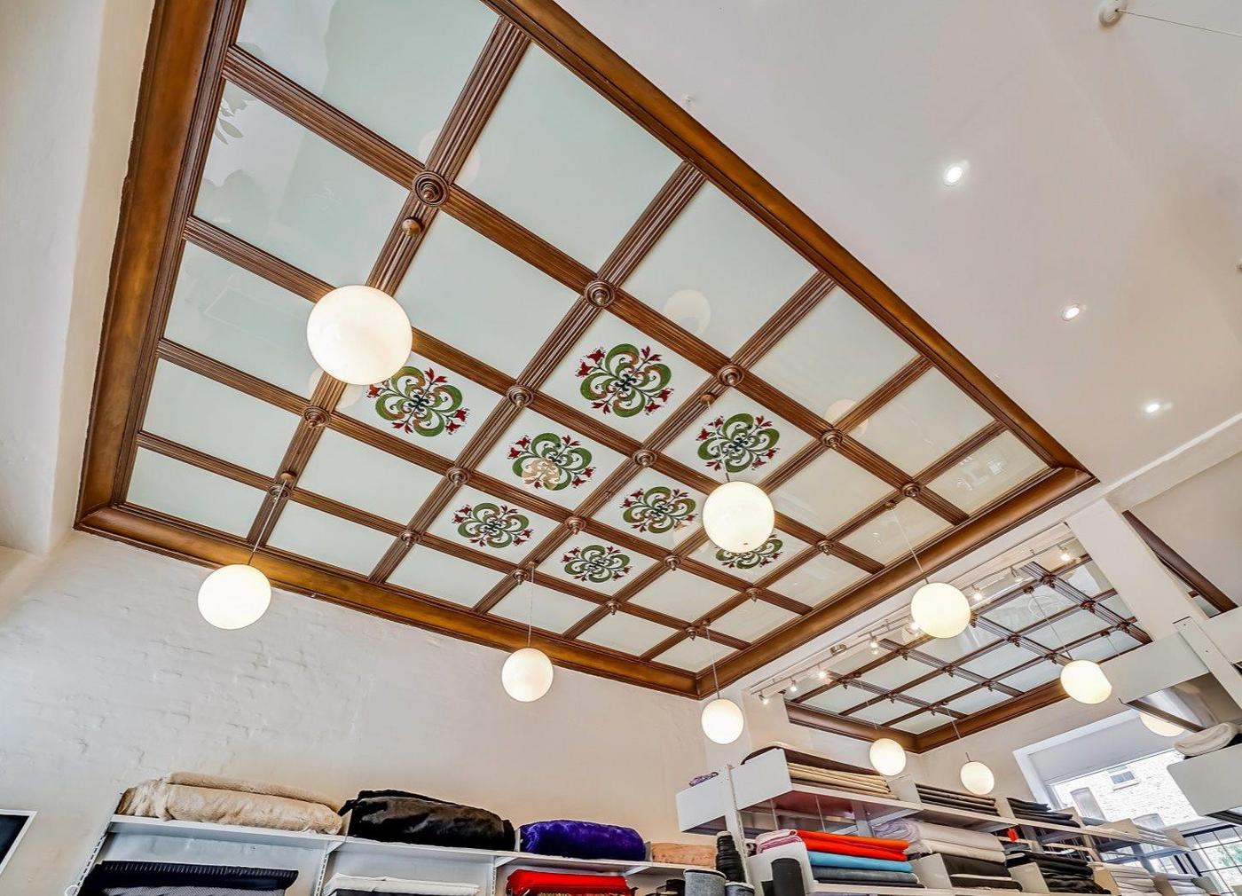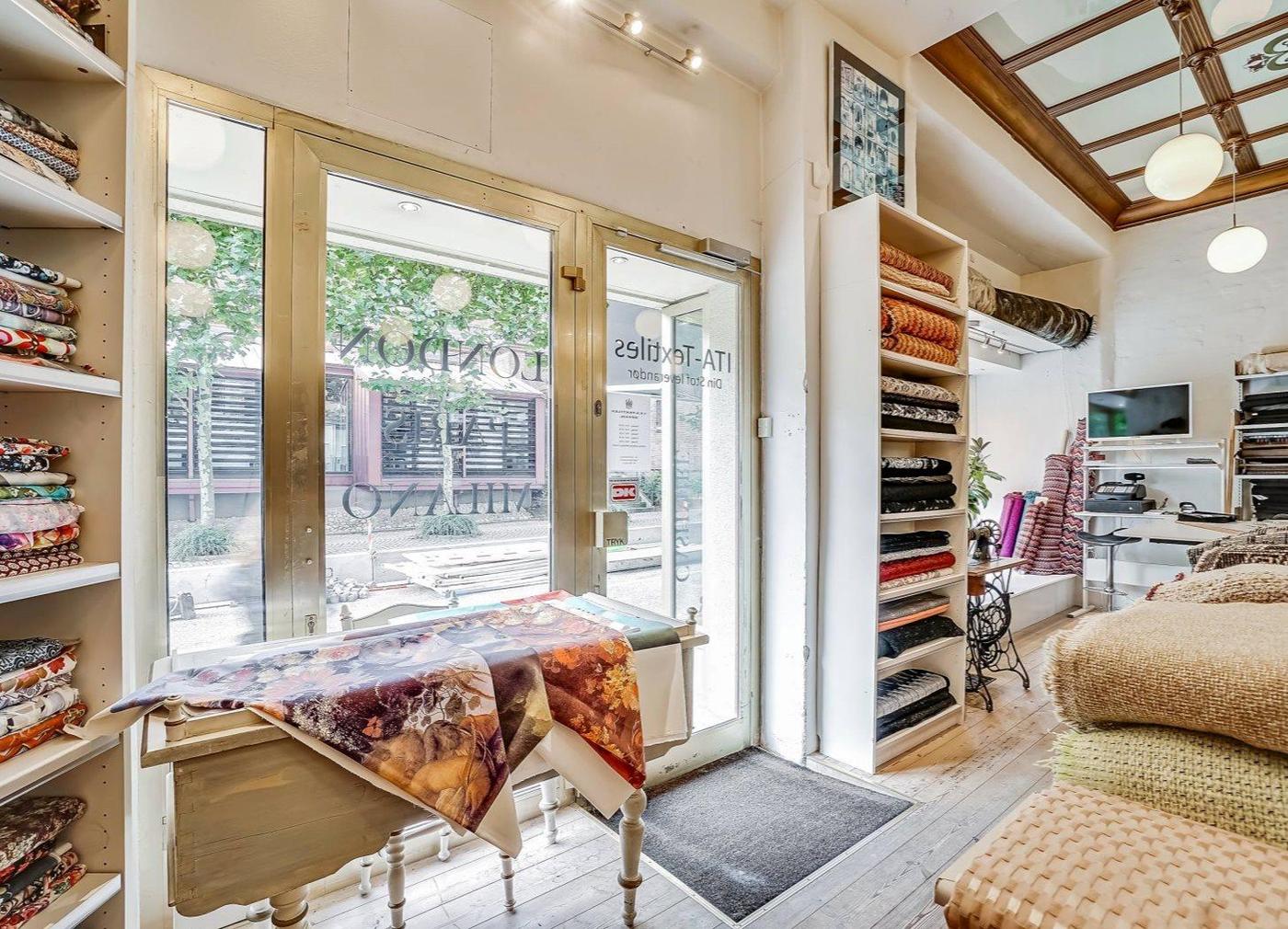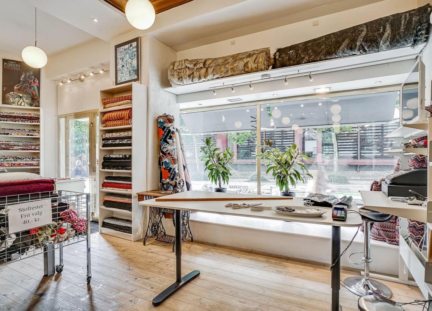 Fra indgangspartiet er der direkte adgang til salgsarealet i stueetagen. Alt fremstår lyst og indbydende. Det unikke loft i lokalet danner ramme om en smuk glasudsmykning.