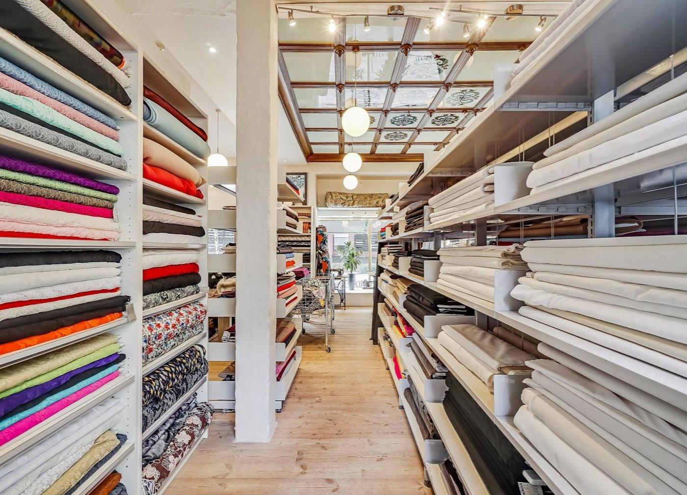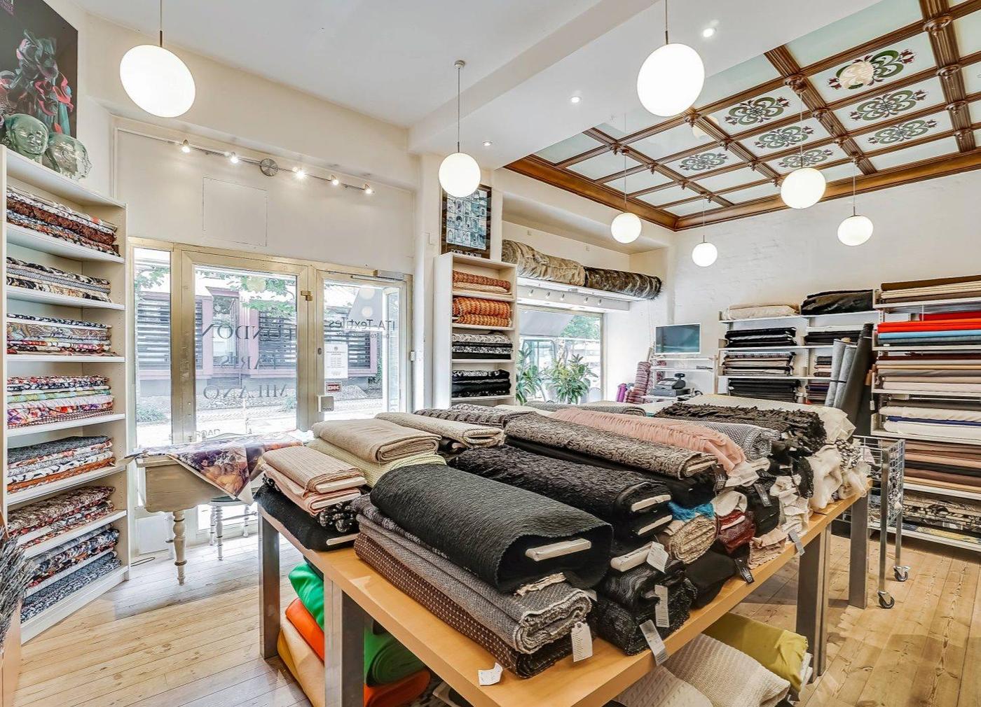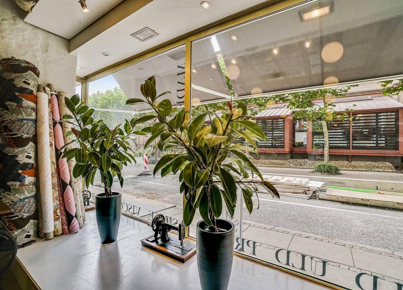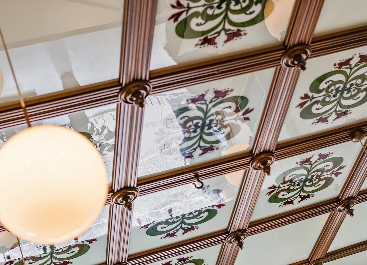 Fra indgangspartiet er der direkte adgang til salgsarealet i stueetagen. Alt fremstår lyst og indbydende. Det unikke loft i lokalet danner ramme om en smuk glasudsmykning.