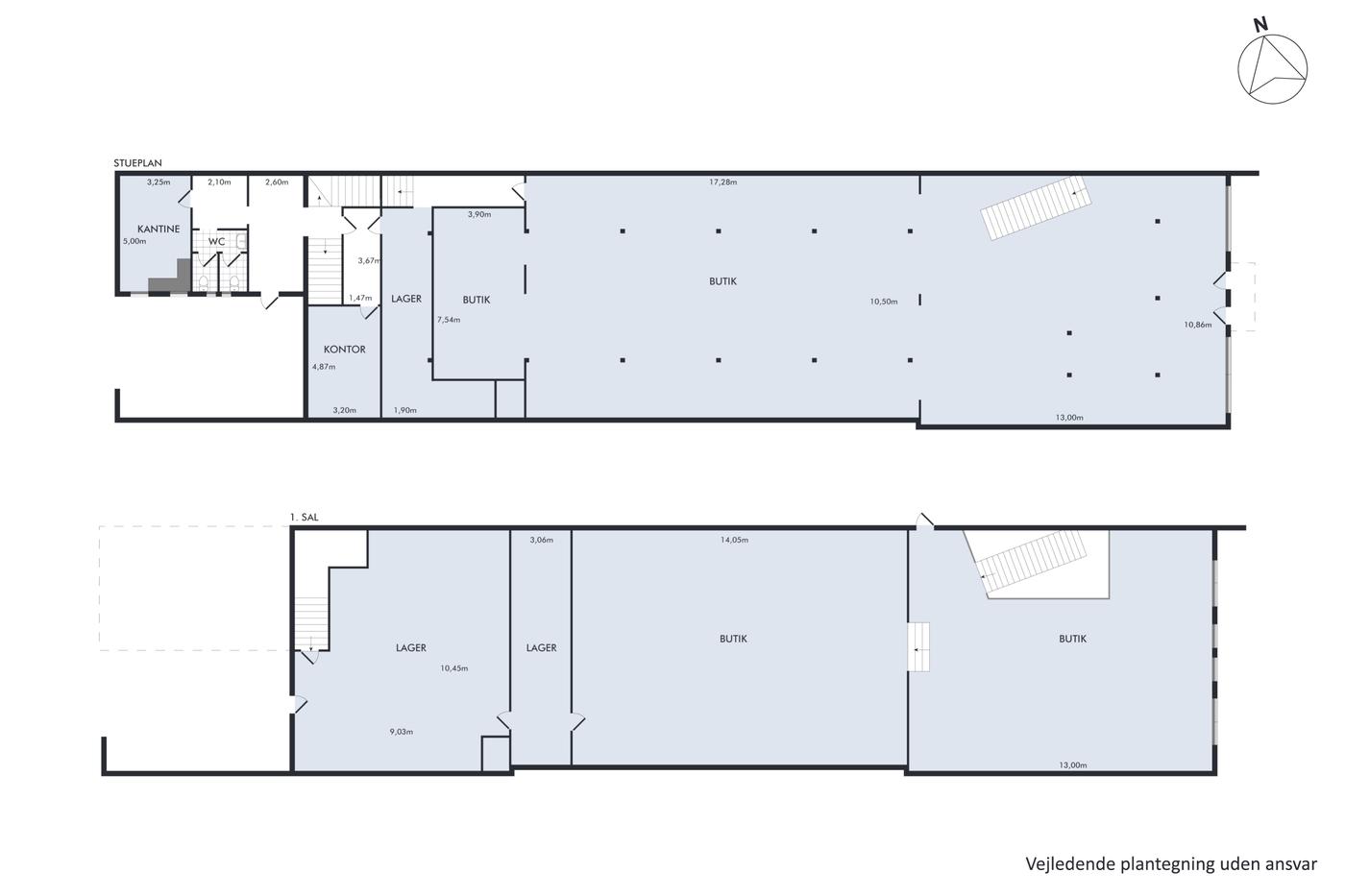 Lejemålet består af et rummeligt og regulært salgsareal i stueplan samt yderligere salgsareal på 1. sal med god loftshøjde og udkig ud mod gaden.