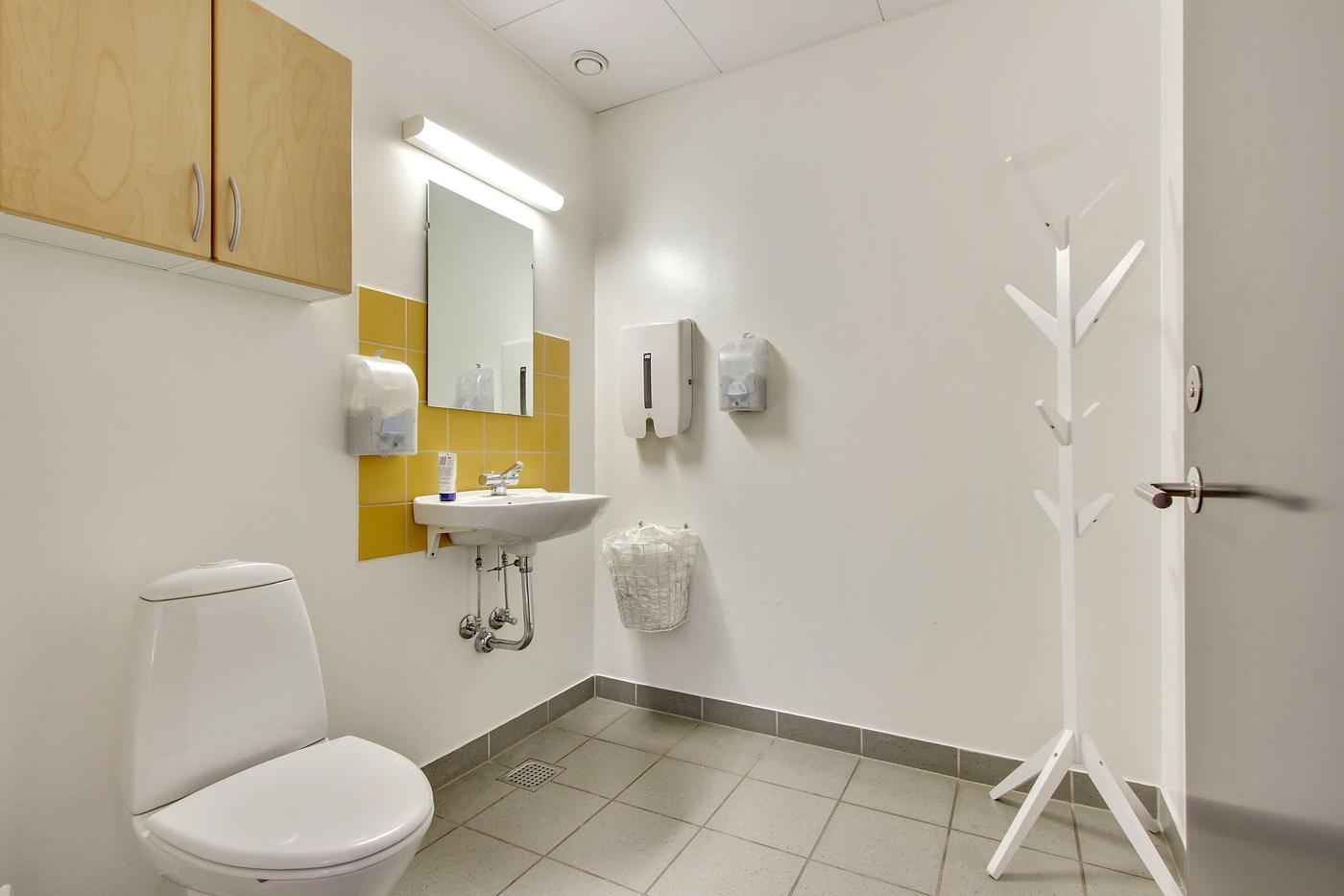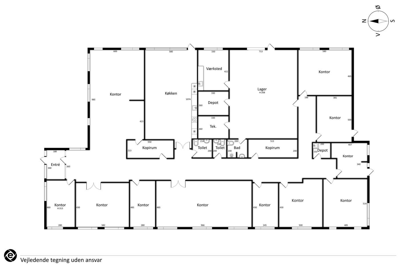 Bygningen på i alt 615 m² består overordnet set af ca. 515 m² lyse og veldisponerede kontorarealer og et ca. 100 m² opvarmet og isoleret lager-/ produktionsafsnit. De større rum er med flotte trægulve, og de mindre kontorrum er med gulvtæpper. Ejendommen er indrettet med flere større og mindre kontorer, kantine/køkken, 3 toiletter og badefaciliteter, diverse teknik, printer eller depotrum samt lager.