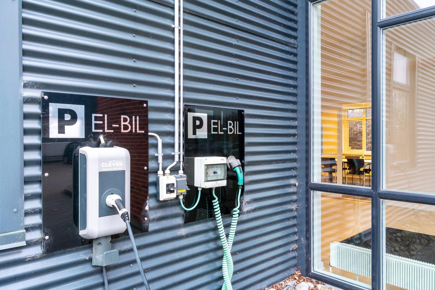 Beskrivelse: Ejendommen fremstår udvendigt solid med facader af hhv. røde mursten og metalprofilplader. Der er monteret oplader til elbiler.
