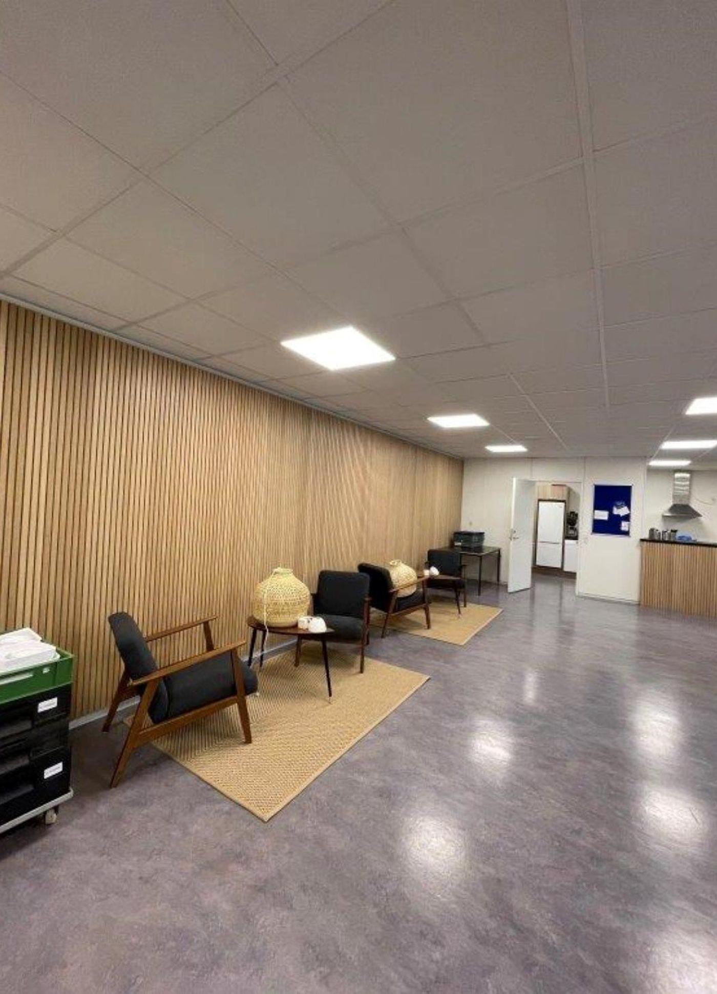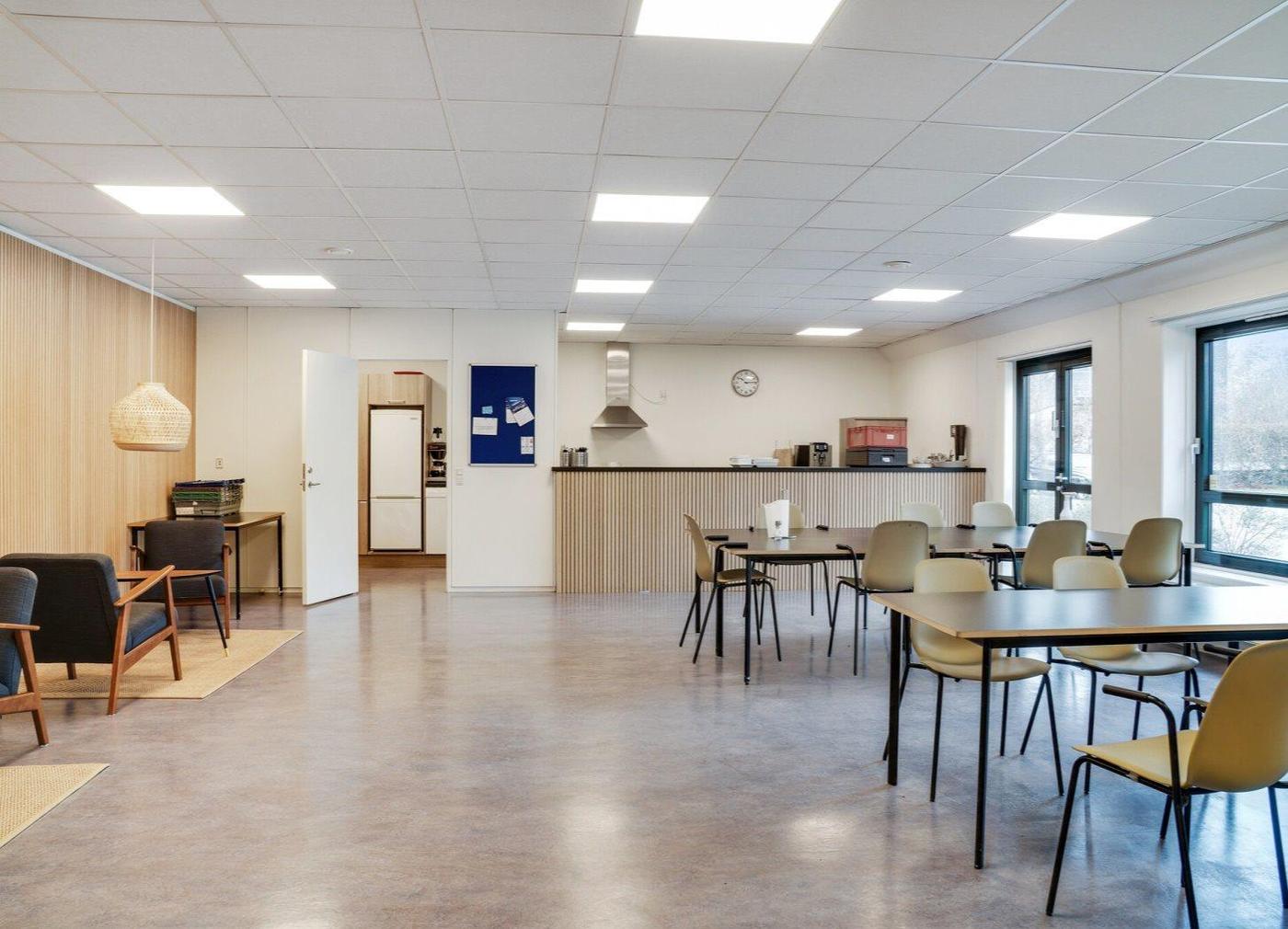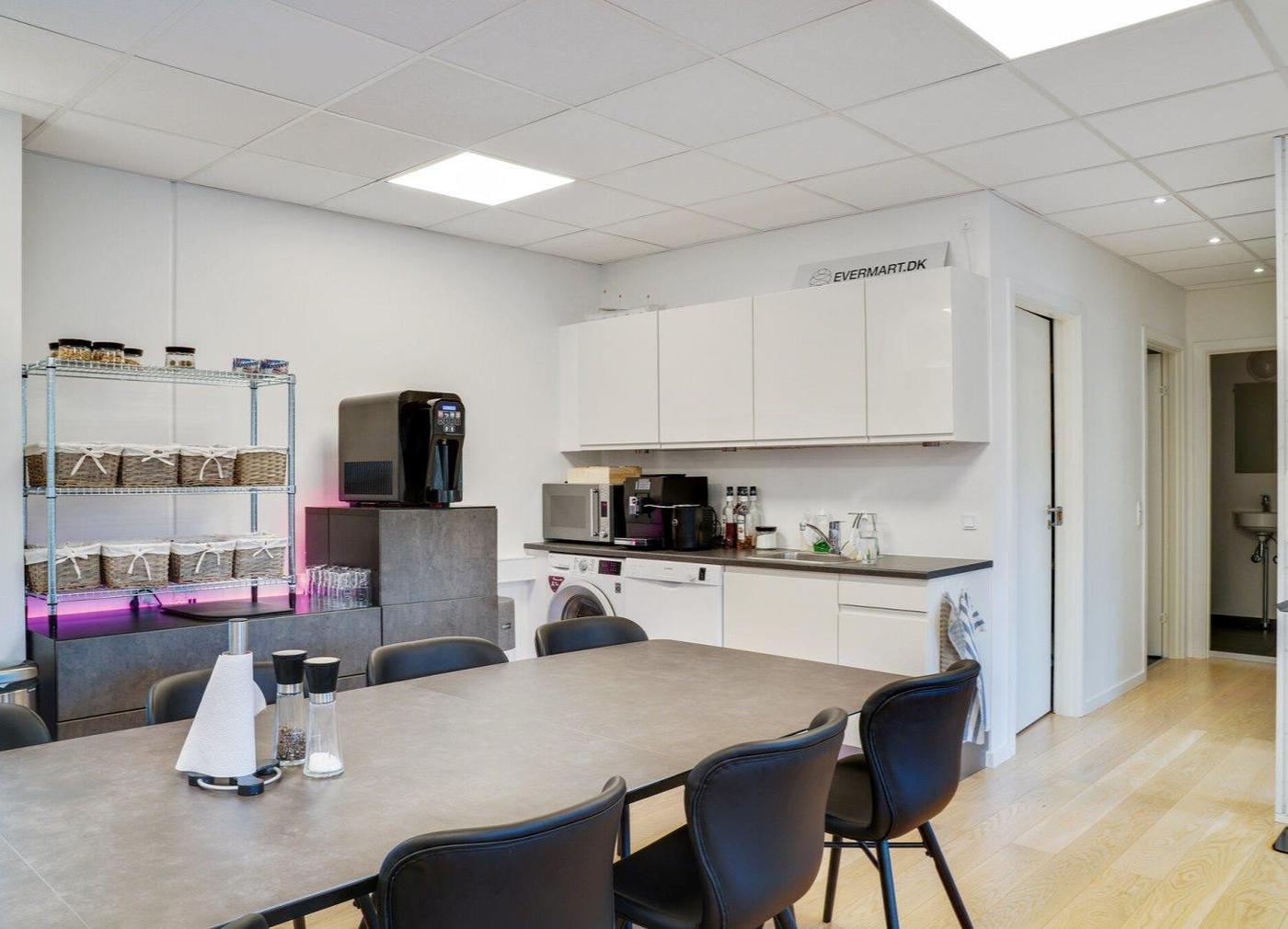 Lejemålet er beliggende på 1. sal og tilgås via flot indgangshall og trappeløb. Lejemålet er nyistandsat med nyt trægulv, tekøkken, mødelokale samt 2 toiletter, hvoraf et er med bad. Lejemålet fremstår lyst og præsentabelt, med hvidmalede vægge, lyse trægulve og integreret loftsbelysning.
