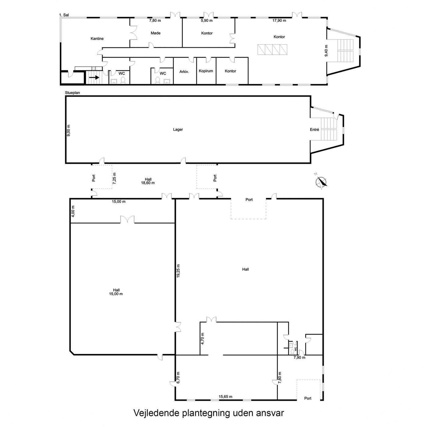 Stueetagen, der er på næsten 400 m², er indrettet til lagerforhold, men kan med få midler indrettes til kontoranvendelse.