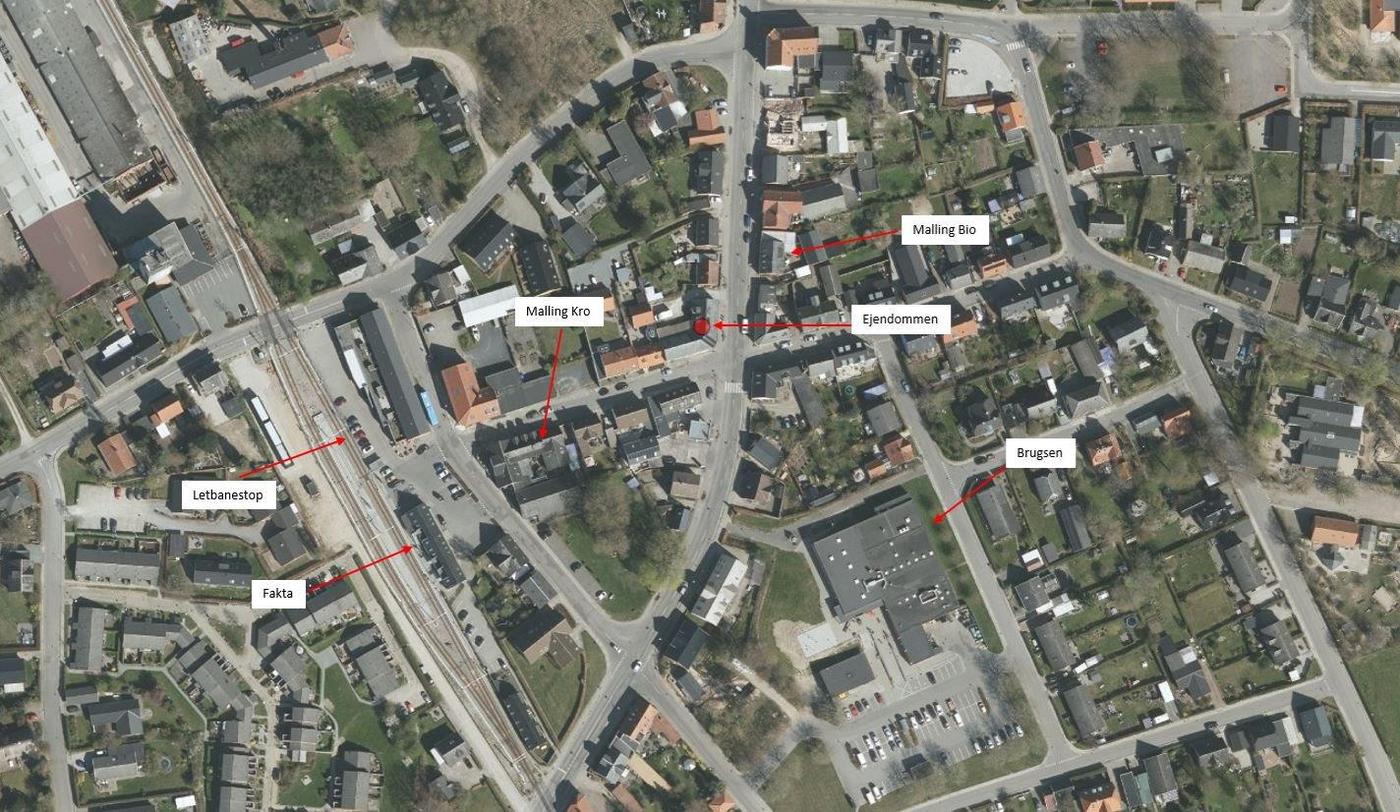 Beliggenhed Ejendommen er beliggende centralt på Bredgade, som er hovedgaden i Malling. Malling er en by i Østjylland med godt 3.500 indbyggere beliggende ca. 10 km syd for Aarhus. Byen er velforsynet med offentlige transportmidler i form af både bus og letbane. Nærheden til Aarhus gør Malling til en populær oplandsby. Byen har de seneste år oplevet en markant stigning i huspriserne, og byen oplever store nybyggerier og en generel forøgelse i tilflytningspopularitet.