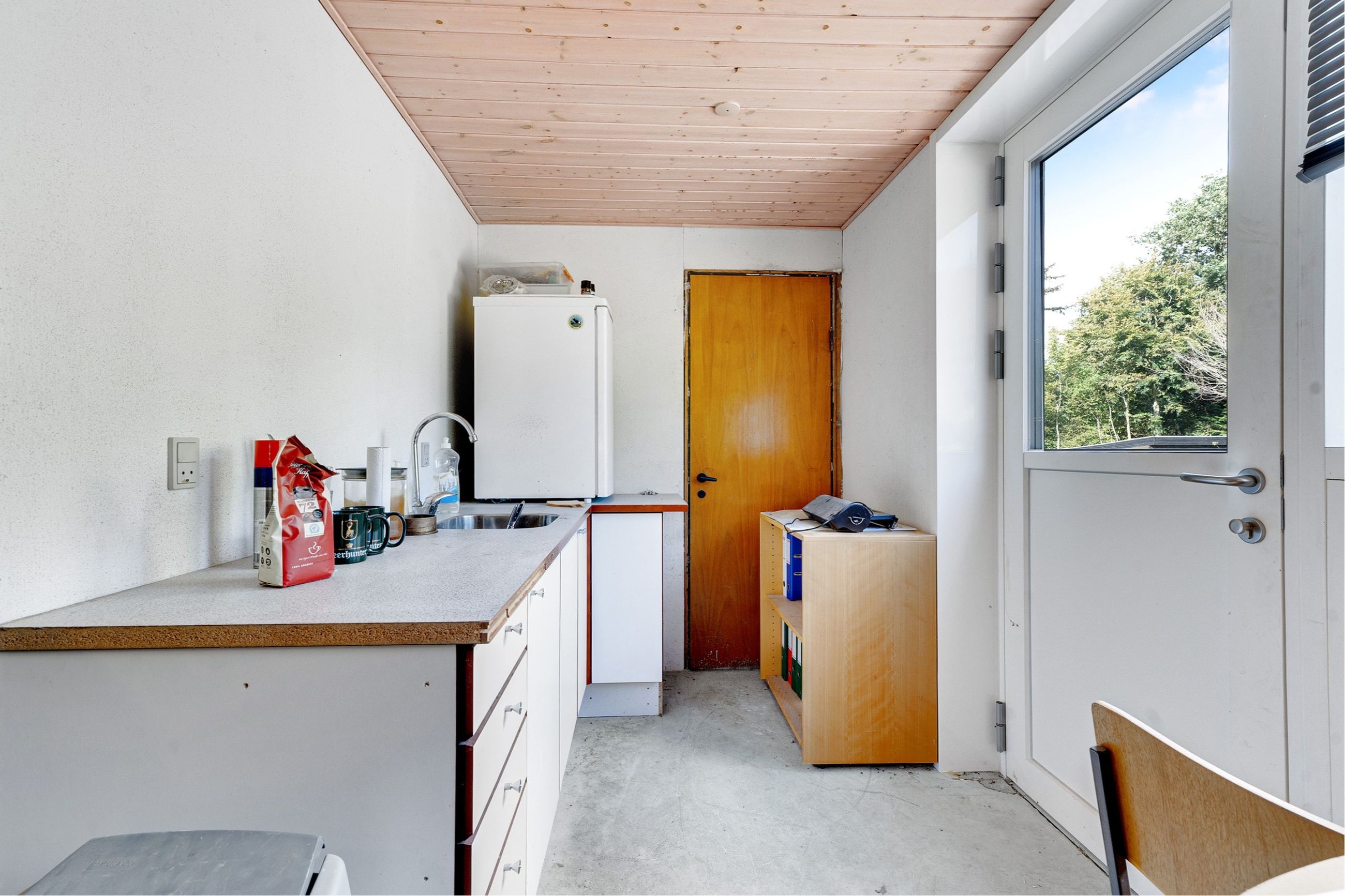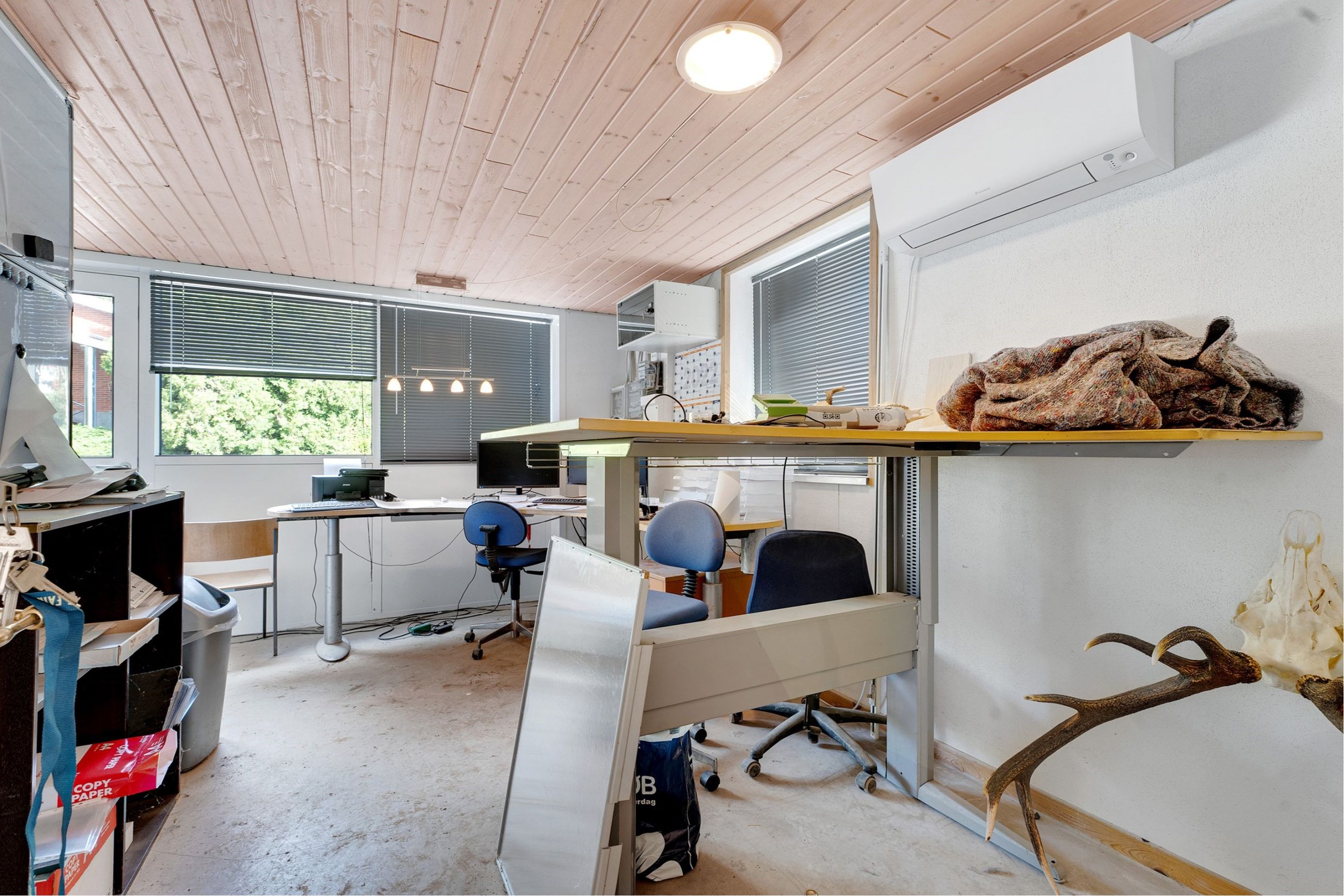Indretning: stort kontorlokale, toilet, thekøkken og badeværelse.