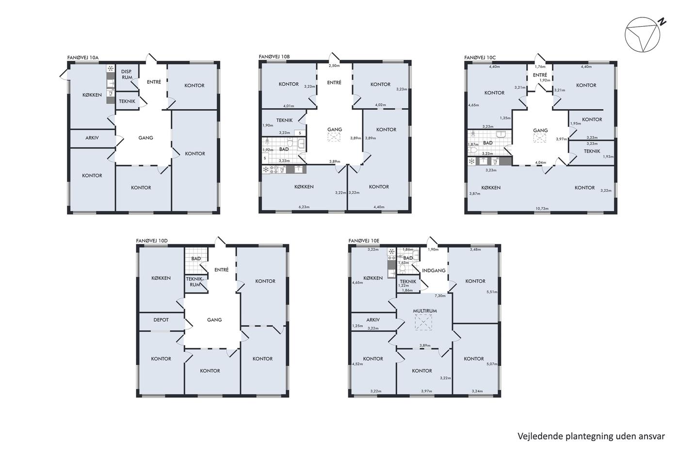 Fanøvej 10 består af fem velholdte og fritliggende erhvervsejendomme, som hver fungerer som selvstændige kontor- eller klinikenheder. Bygningerne fremstår ensartede og moderne med pæne facader og store vinduespartier. Hver enhed er indrettet med fokus på funktionalitet og fleksibilitet, hvilket gør dem særligt velegnede til liberale erhverv, behandlere og mindre virksomheder, der ønsker egne lokaler.