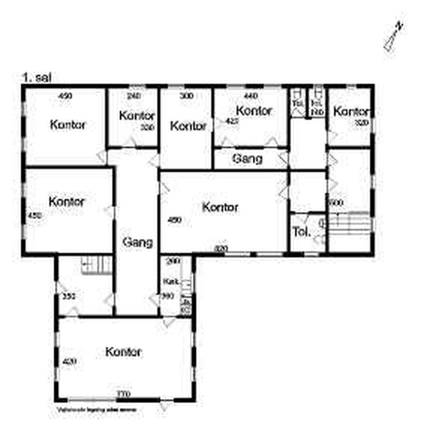 Første salen er indrettet til kontorer og velfærdsfaciliteter. Der er vel 9 kontorer, tekøkken og toiletforhold. På loftet er der arkivrum. Loftet kan udnyttes mere til arkiv end det bliver udnyttet i dag. Der er udviklingsmuligheder.