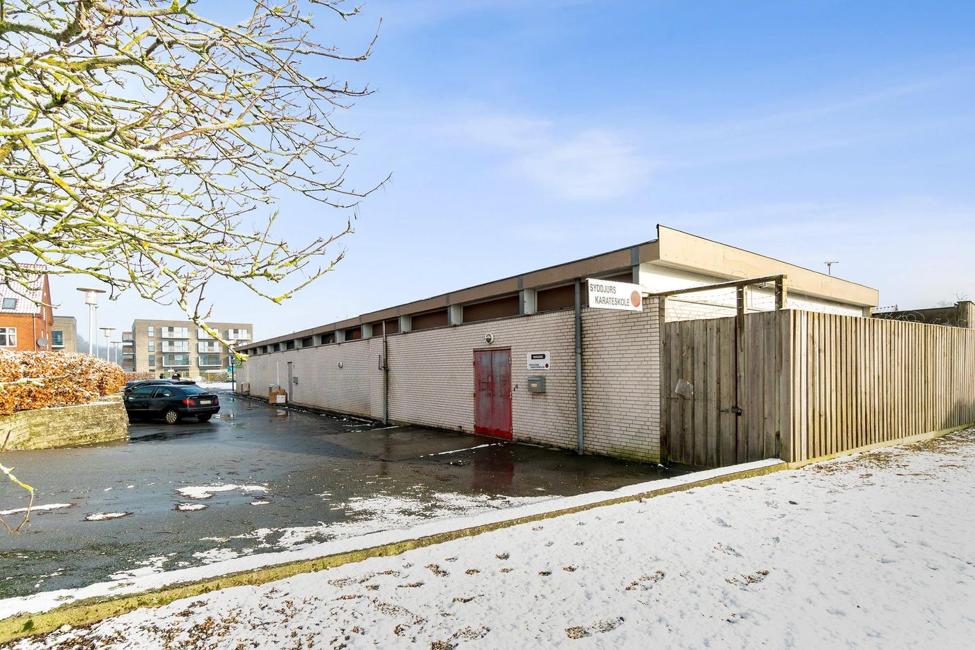 Ejendommen er oprindelig opført i 1974 i hvide kalksandsten og med fladt tag.