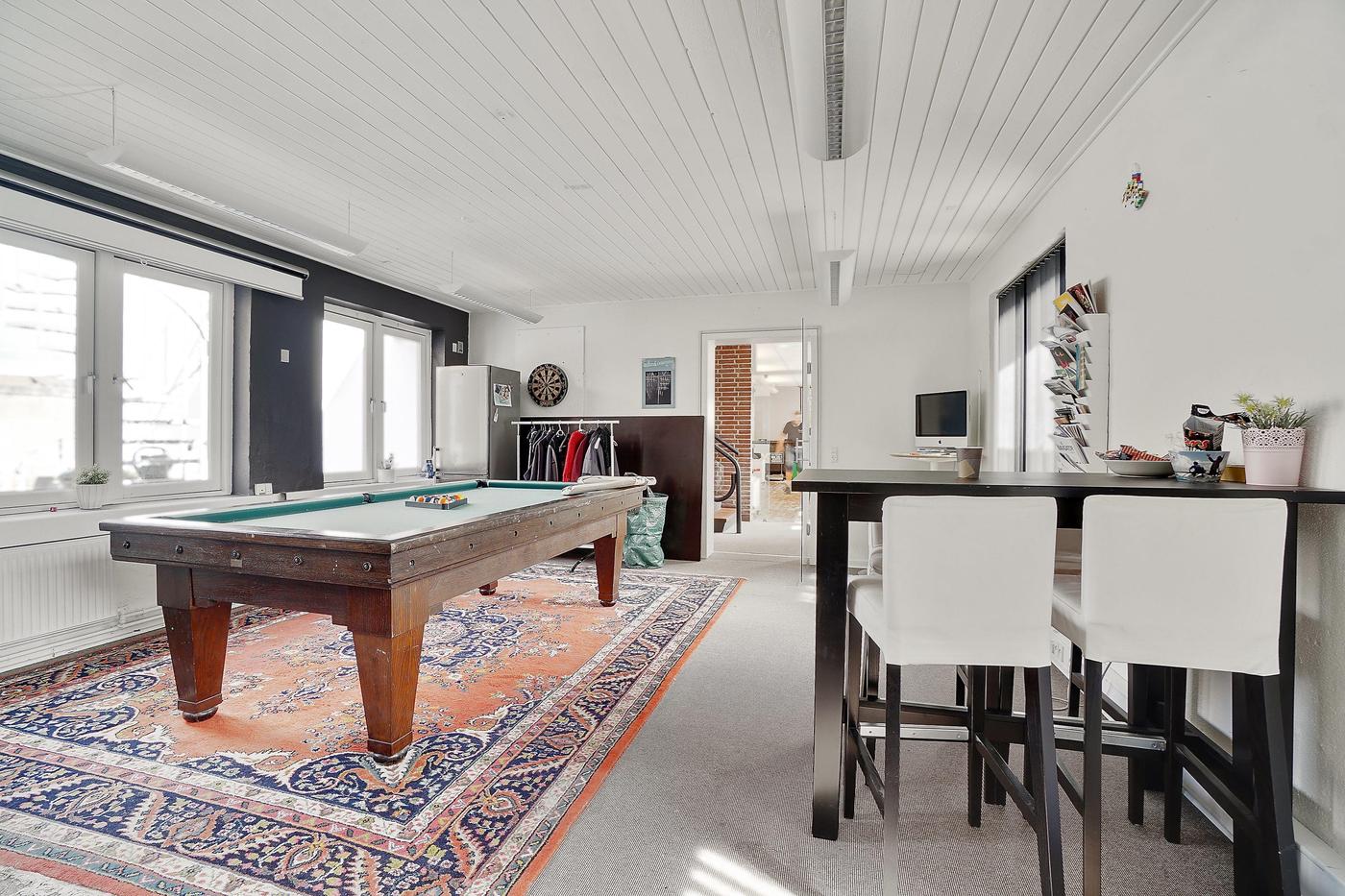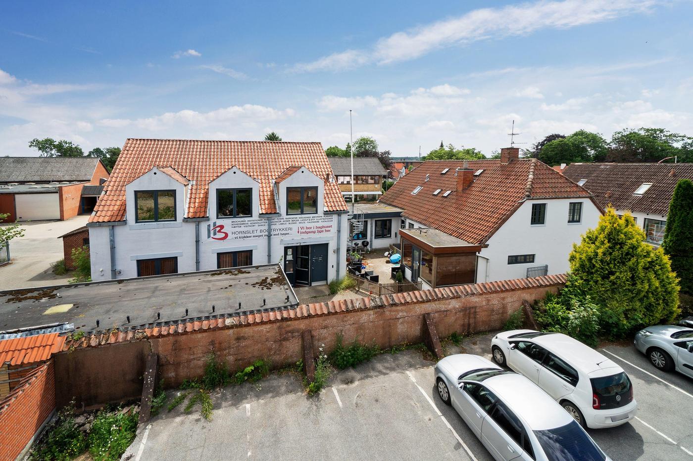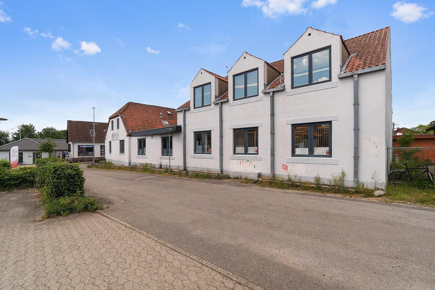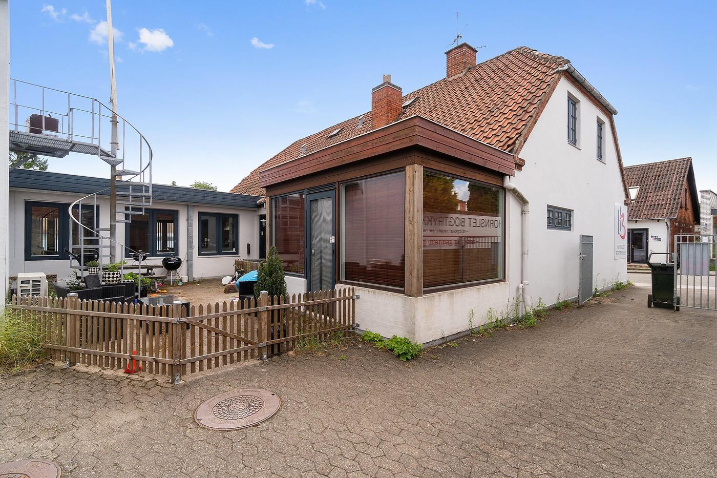 Beskrivelse Ejendommen har et bebygget areal på 375 m2 og indeholder en selvstændig bolig og et erhvervslejemål. Boligen er på 120 m2 og udlejet og erhvervsareal er på 472 m2 og også udlejet. Bygningen er opført i 1894 og tilbygget i 1979. Huset er opført i mursten og der er tegl på taget. Boligen indeholder stue/værelser, køkken og toiletforhold. Erhvervsdelen indeholder kontorareal som tidligere har været anvendt til butik samt et stort produktionsareal som i dag anvendes til trykkeri. Der er el-varme i produktionen og fjernvarme i kontorarealet. Loftet er beklædt med lyddæmpende plader med nedhængte lamper. Gulvet er belagt med fliser. Førstesalen er indrettet med mødelokaler og køkken og toilet forhold.