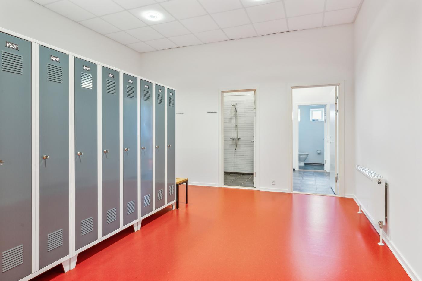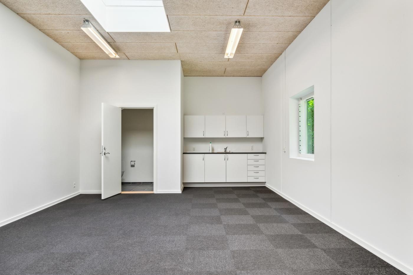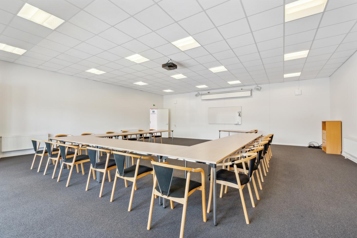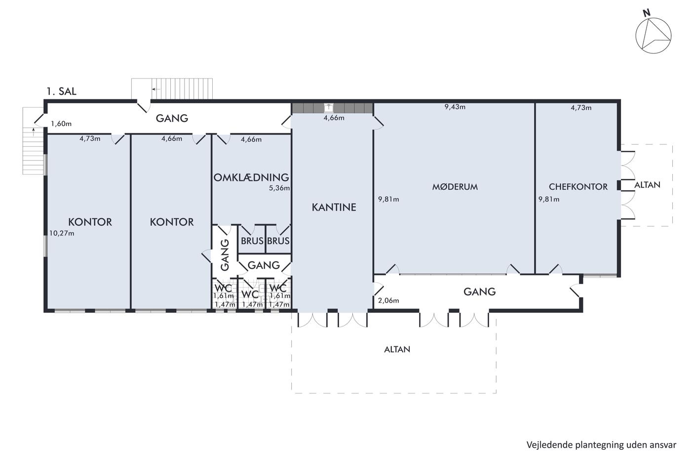 På 1. salen er stort kontor med udgang til tagterrasse. Stort mødelokale, som også kan bruges til f.eks. undervisning. Fordelingsgang med udgang til stor sydvendt tagterrasse. Fra kantinen er der ligeledes udgang til terrassen, ligesom der er direkte adgang til det store mødelokale. Velfærdsområde med omklædning, brus og toiletter. Herudover 2 store rum, som kan bruges til kontor, mødelokale, motionsrum mm.