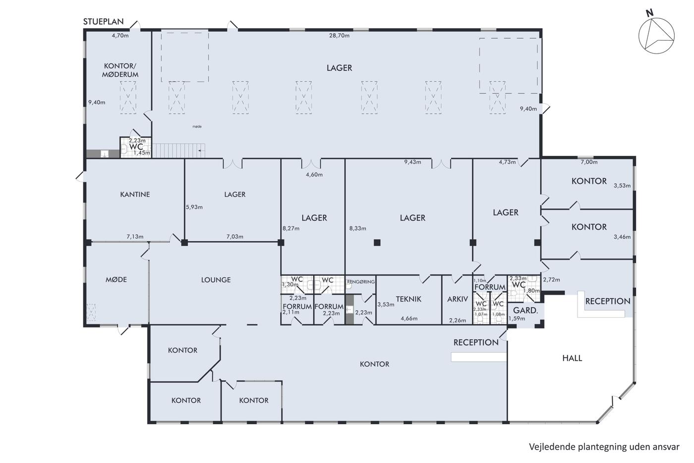 Stueplan er delt op i flere områder. Her er indretningsvenligt kontorområde med stort fælles kontor, 3 lukkede kontorer, mødelokale, stort lounge/møde område, kantine, toiletter samt depot/teknikrum. Bag receptionen er område med 2 kontorer, flere rum, der kan bruges til lager, depot mm., Ca. 330 m² lager med 2 porte - højde 3 meter og bredde 3,5 meter. Med egen indgang er separat rum med tekøkken og toilet på ca. 40 m². Rummet kan bruges til møder, showroom, testrum mm.